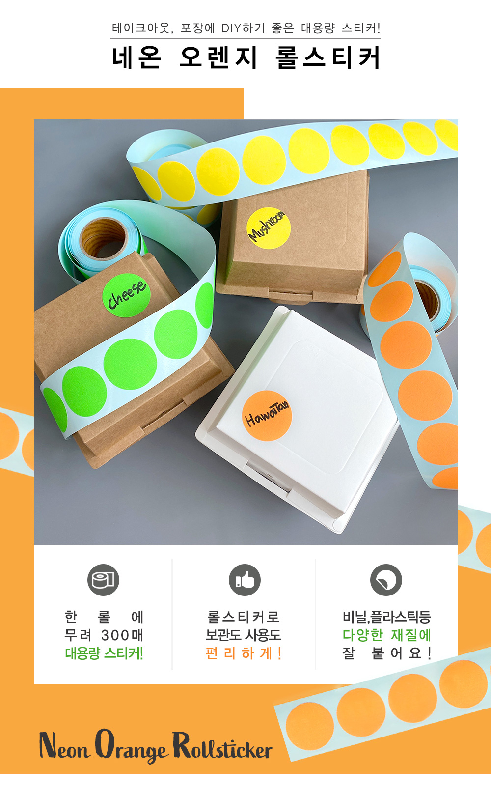 | 상품명: 네온 오렌지 롤스티커 형태: 롤스티커 재질: 모조지 수량: 1롤/300매입 규격: 가로35*세로35mm 톡톡! 튀는 시원한 네온 색감으로 포인트 주기 좋으며 보관과 사용이 편한 롤 타입입니다. 300매 대용량으로 오래 사용하실 수 있어요! 모조지로 종이 질감이 살아있어 자연스러운 연출! 네임펜으로 간단한 메모 가능! 박스, 종이, 비닐 어디든 잘 붙어 베이커리, 카페, 선물포장 등 포인트 스티커로 다양하게 사용하실 수 있습니다. 원하는 색상과 디자인을 선택해 두 개 이상 함께 사용해도 좋습니다. - ★대용량 구매는 www.소행섬.com |
