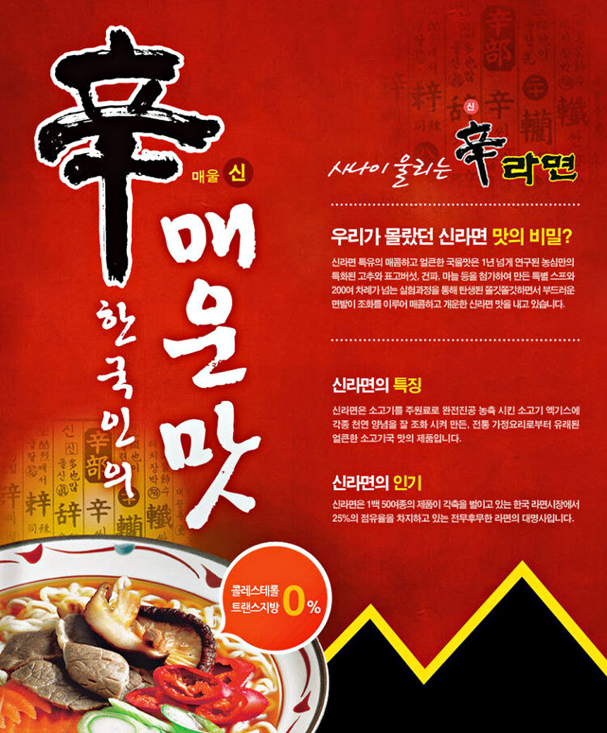 농심 신라면은 우리 입맛에 맞는 얼큰하고 매운맛 제품이에요. 농심의 정성과 앞선 기술 그리고 좋은 원료로 만들어 남녀노소 구분 없이 많은 사랑을 받고 있답니다.