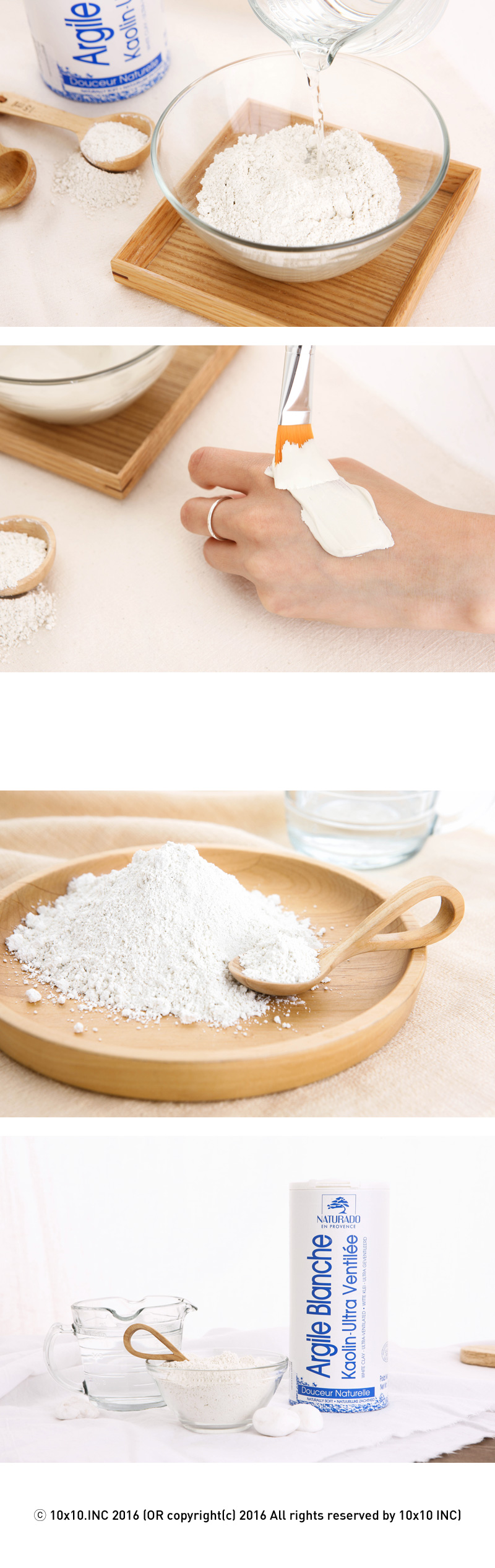 사용법 : 물과 파우더를 1:1.5 비율로 섞으면 클레이로 변하게됩니다. 얼굴에 바른 후 10분뒤 물로 씻어냅니다.