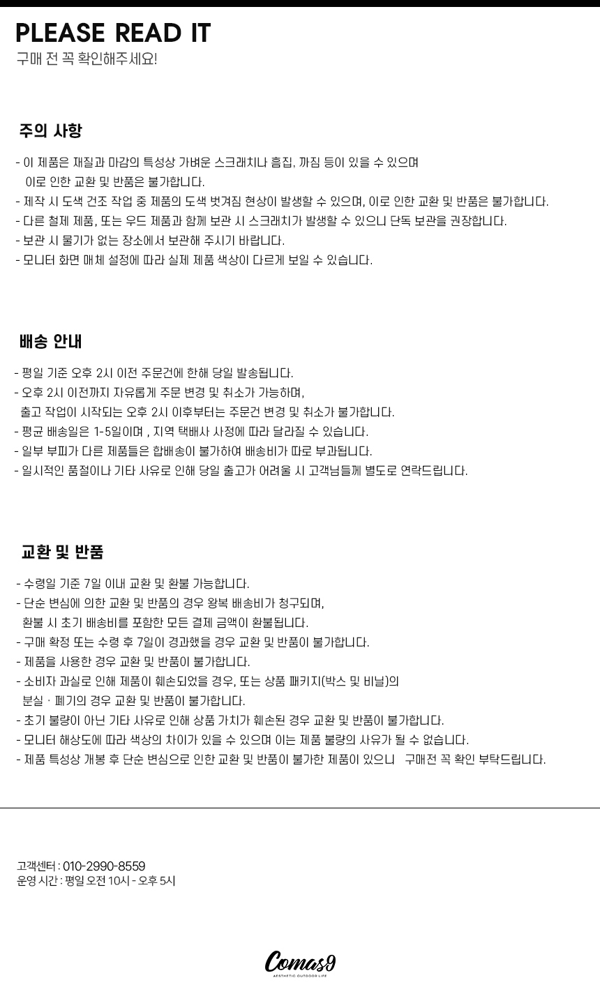*이 제품은 재질과 마감의 특성으로 가벼운 스크레치나 흠집, 까짐 등이 있을 수 있습니다. 위 사항으로 인한 반품이나 교환은 불가능하오니 이 점 양해부탁드립니다.