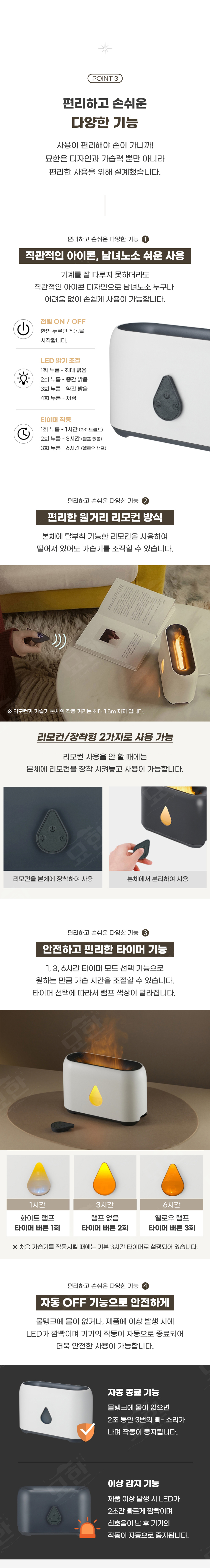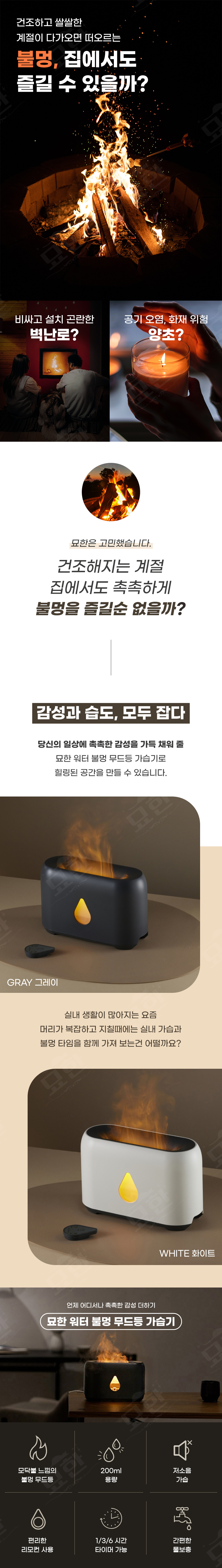 집에서도 즐기고 싶다 불멍! 설치하기도 힘든 비싼 벽난로, 화재의 원인이자 집안 미세먼지를 올리는 양초로는 집에서 할 수 없는 불멍! 묘한이 해냈습니다. 3단계 밝기 조절로 더욱 감성적이게 즐겨보세요. 모닥불이 타는 듯한 LED 라이트가 은은하고 감성적인 분위기를 연출합니다. 안전한 불멍을 즐겨보세요. 디자인에만 신경쓴 제품이 아닌 가습 기능 또한 신경 쓴 제품입니다. 200ml 용량으로 하루 한번 물 보충시 최대 9시간까지 사용이 가능합니다. 또한 저소음 가습 분무로 숙면에도 방해되지 않습니다. 직관적인 아이콘으로 누구나 쉽게 사용이 가능합니다. 함께 제공되는 리모컨을 붙였다 떼었다 멀리서도 작동시킬수 있을 뿐아니라 잃어버릴일 없이 본체에 장착하여 사용해보세요. 1시간 3시간 6시간 타이머 설정과 물탱크 물부족, 제품 이상 발생시 자동 OFF기능이 작동됩니다.