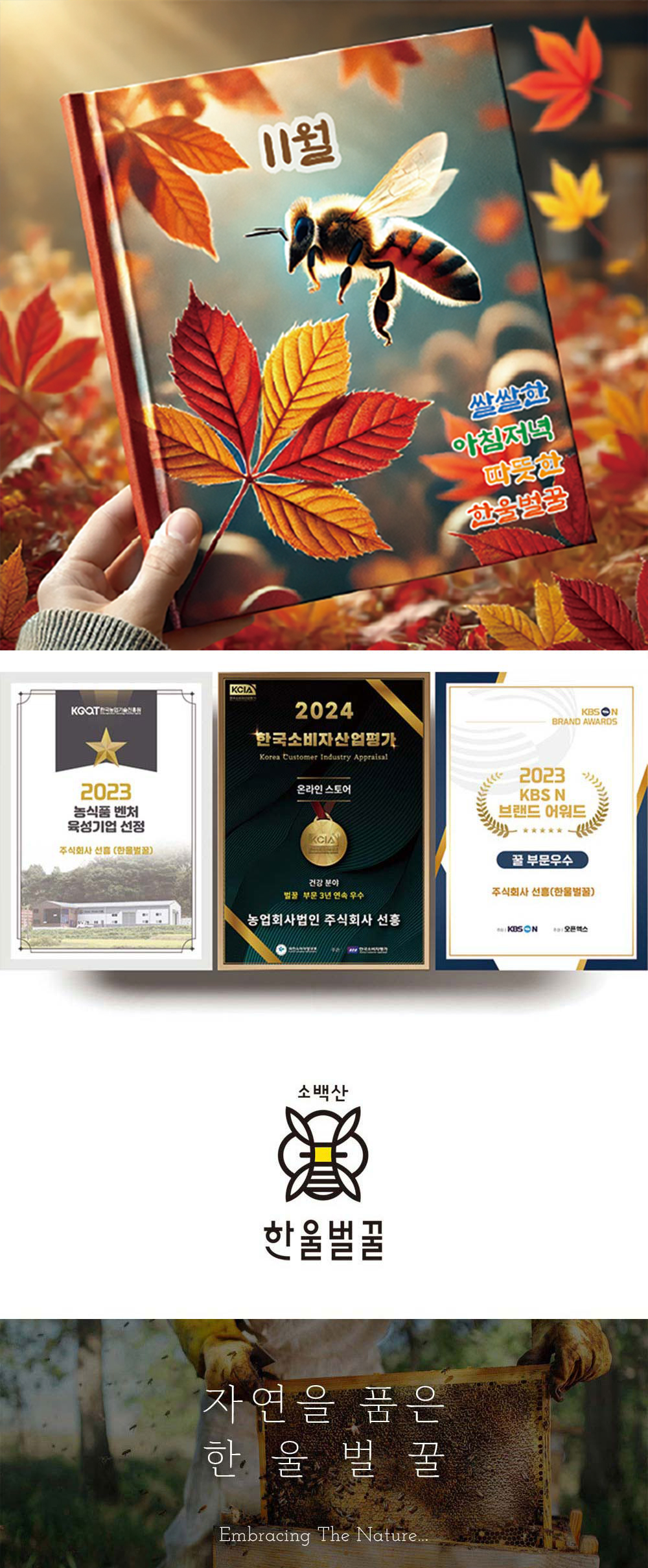 소비자산업평가 벌꿀부문 소비자만족도상 수상 1) 22년~24년 3년연속 한국소비자 산업평가 벌꿀부문 1위 2) 2023년 농식품 벤처 육성기업 선정