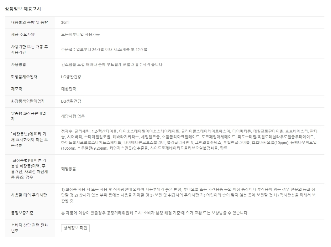 ![]() ![]() 전자상거래 등에서의 상품 등의 정보제공에 관한 고시1. 내용물의 용량 또는 중량 : 상품상세참고 2. 제품 주요 사양 (피부타입, 색상(호, 번) 등) : 상품상세참고 3. 사용기한 또는 개봉 후 사용기간(개봉 후 사용기간을 기재할 경우에는 제조연월일을 병행표기) : 제품에 별도표기 4. 사용방법 : 적당량 덜어 사용 5. 화장품제조업자, 화장품책임판매업자 및 맞춤형화장품판매업자 : 상품상세참고 6. 제조국 : 상품상세참고 7. 「화장품법」에 따라 기재ㆍ표시하여야 하는 모든 성분 : 상품상세참고 8. 「화장품법」에 따른 기능성 화장품(미백, 주름개선, 자외선 차단제품 등)의 경우 “화장품법에 따른 기능성 화장품 심사(또는 보고)를 필함”의 문구 : 상품상세참고 9. 사용할 때의 주의사항 : 고온 또는 저온의 장소 및 직사광선이 닿는 곳에 보관을 피해주세요. 10. 품질보증기준 : 상품상세참고 11. 소비자 상담 관련 전화번호 : 상품상세참고 ![]() |