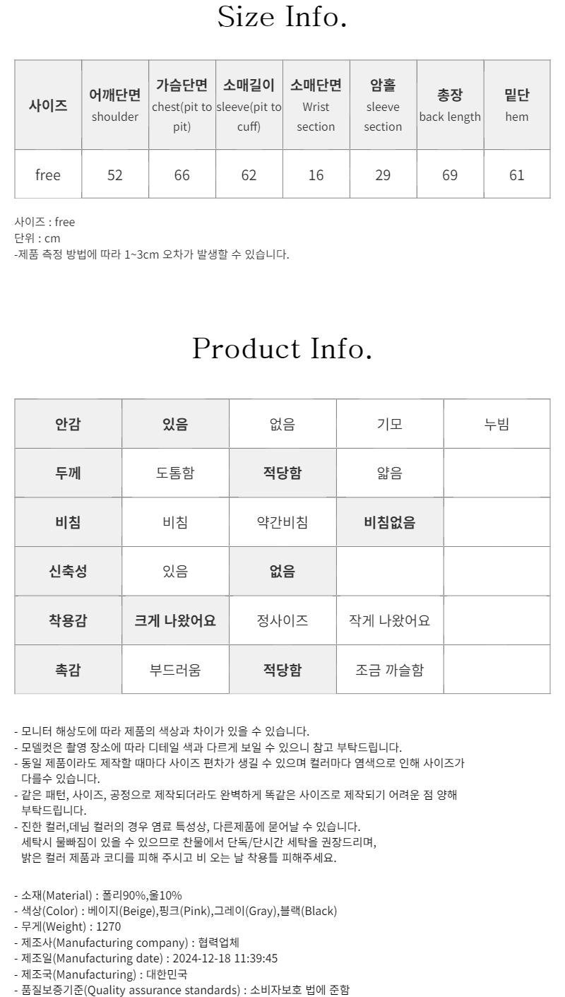 [ 사들라 복실 양털 비죠 울 박시 점퍼 ] 양털 안감으로 따뜻하게 입을 수 있으며 박시한 핏으로 스타일리쉬하게 연출 가능한 겨울 점퍼 추천해드려요~! 컬러는 총 4가지 베이지(Beige),핑크(Pink),그레이(Gray),블랙(Black)컬러로 준비했습니다. 사이즈는 FREE로 44~77사이즈까지 착용 가능합니다. ※같은 사이즈라도 체형에 따라 핏감이 조금씩 다를 수 있습니다. 상세사이즈를 확인하셔서 굿초이스해주세요 :) MD.SW [#점퍼#긴팔점퍼#항공점퍼#스트릿점퍼#여성점퍼#데일리#캐쥬얼#점퍼코디#간절기점퍼#양털점퍼#겨울점퍼#모직점퍼#누빔점퍼] - COLOR(색상) : 베이지(Beige),핑크(Pink),그레이(Gray),블랙(Black) - SIZE(사이즈) : free - 상세사이즈 : 어깨단면 / 가슴단면 / 소매길이 / 소매단면 / 암홀 / 총장 / 밑단 (free)52 / 66 / 62 / 16 / 29 / 69 / 61 "Model Size" Top 44 / Bust 70A / Pants 25 / Height 166cm / Shoes 240 size ☆ 모델 착용 사이즈 : FREE/베이지,핑크 착용/SW - FABRIC(소재) : 폴리90%,울10% - 안감(있음),촉감(적당함),착용감(크게나옴),신축성(없음),두께감(적당함),비침(없음),사이즈(44~77) - 무게 : 1270 - WASHING(세탁방법) : 단독세탁 - 제조국 : 대한민국
