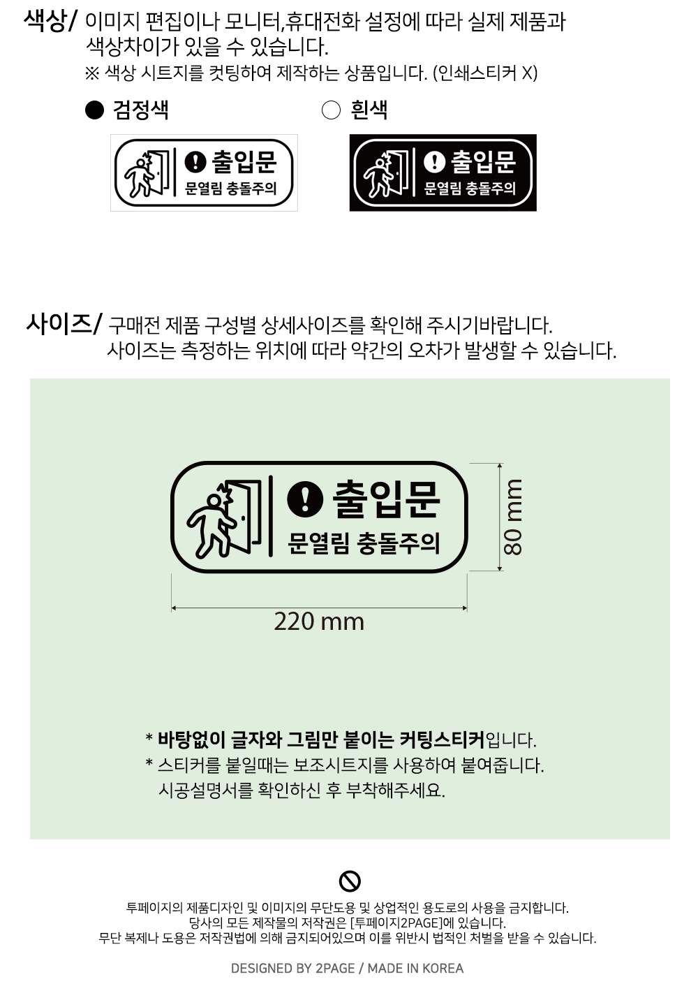 "출입문/ 문열림 충돌주의"출입문에 붙이는 스티커입니다.문이 예상치 못하게 열리며 발생할 수 있는 부딪힘이나 위험을 예방합니다.