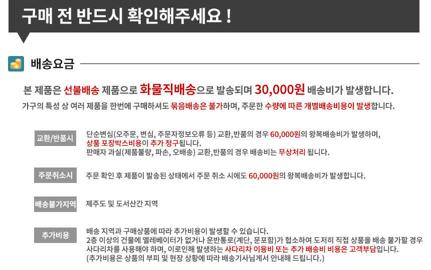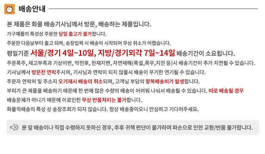 ★ 본 상품은 착불배송으로 출고 되는 제품으로 쇼핑몰에 무료배송으로 나와도 착불배송으로 진행되는 가구 제품입니다 ★ 해피콜은 주문확인후 1~2일이내 해피콜 문자나 유선으로 연락드리고 있습니다. 안심번호로는 확인이 어려우니 일반 핸드폰번호 기재 해주세요 ★ 제품에 관한 상담,출고일,제품 반품등 자세한 상담을 원하시면 문자나 유선으로 연락주시면 확인후 빠른 상담 가능합니다 010-5750-2219