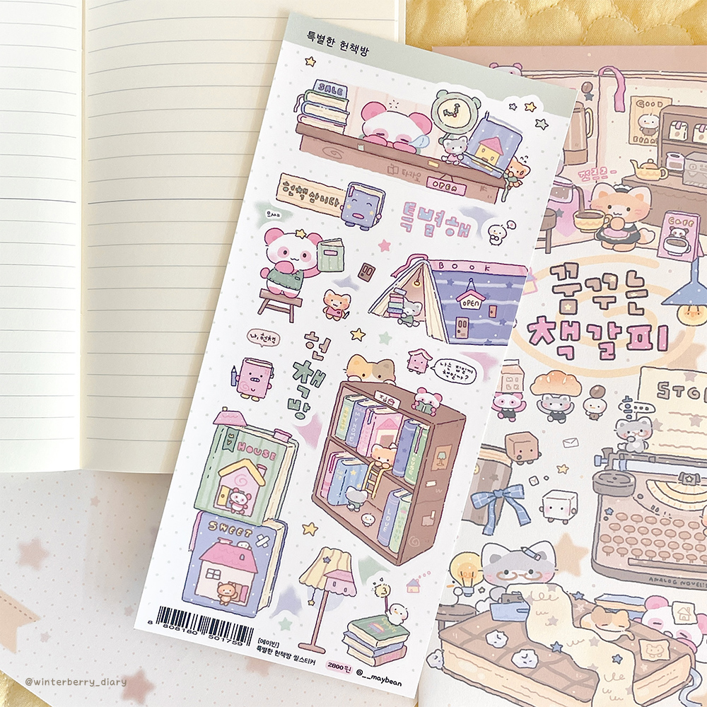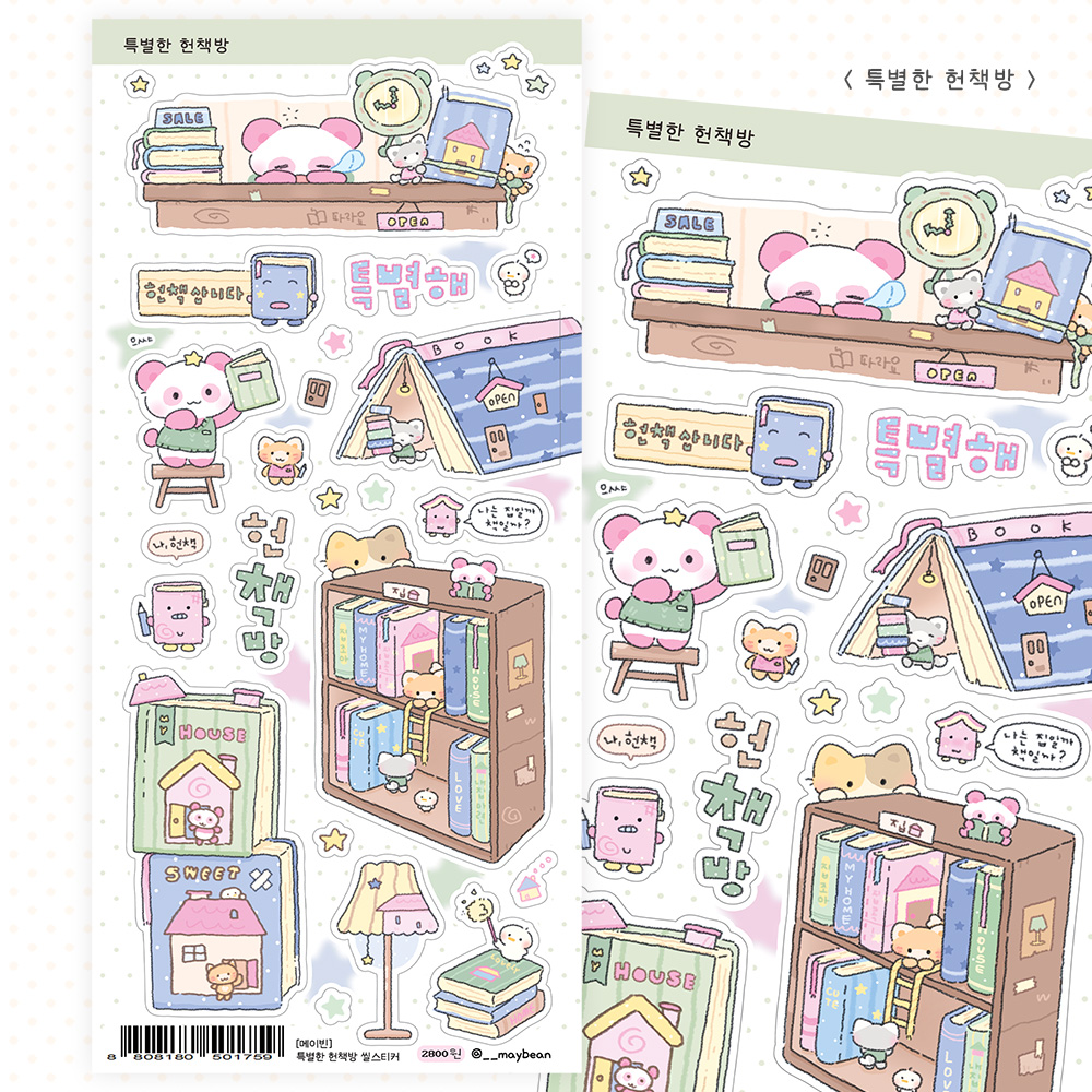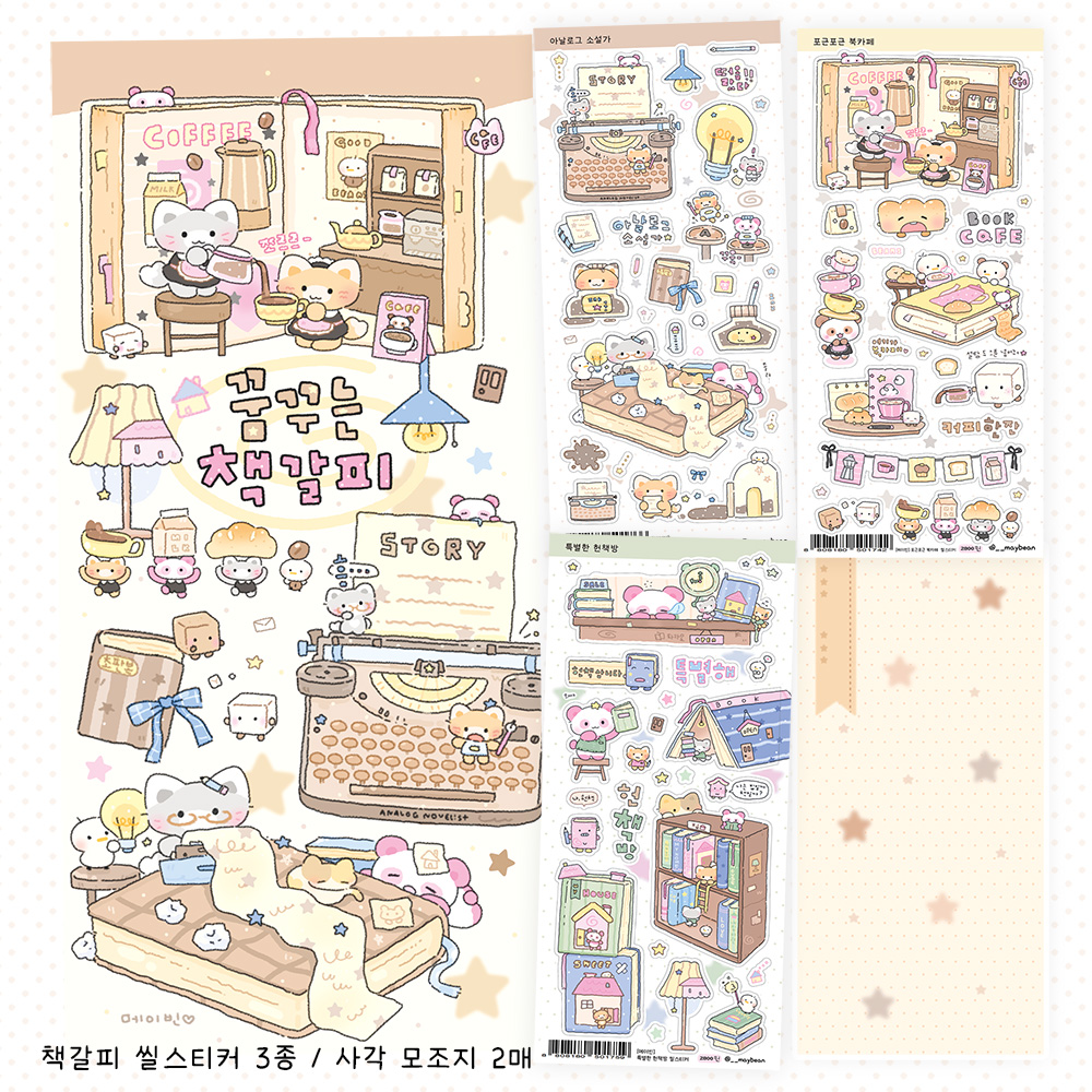 | < 꿈꾸는 책갈피 팩 > 책 좋아하시는 분 여기요 여기~!! 계절이 선선하게 바뀔 준비를 하고 있는 요즘과 잘 어울리는 아주 폭닥한 신상을 데려왔어요 이번 스티커팩의 주제는 책이에요 일상 속 책과 함께하는 특별한 순간들을 담았답니다 북카페, 책방 그리고 타자기까지 따스하고 포근포근함 감성 가득이에요 포근포근 북카페 특별한 헌책방 아마추어 소설가 세가지 씰스티커와 함께 잘 어울리는 사각 책갈피 배경모조지 2장이 함께 들어있어요 책과 함께 힐링해요 씰스티커 93*200mm 배경모조지 85*175mm |