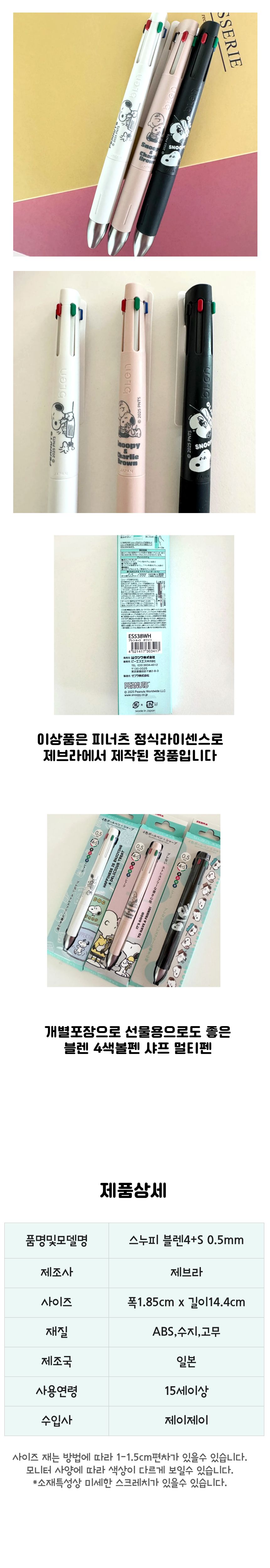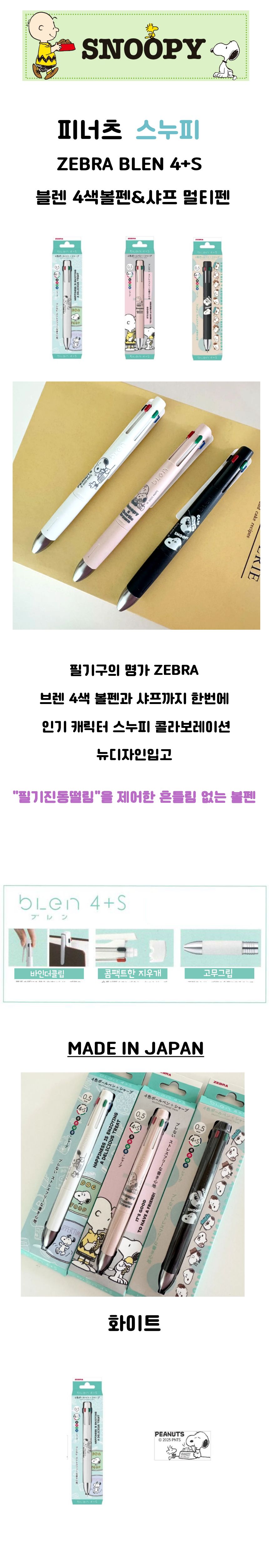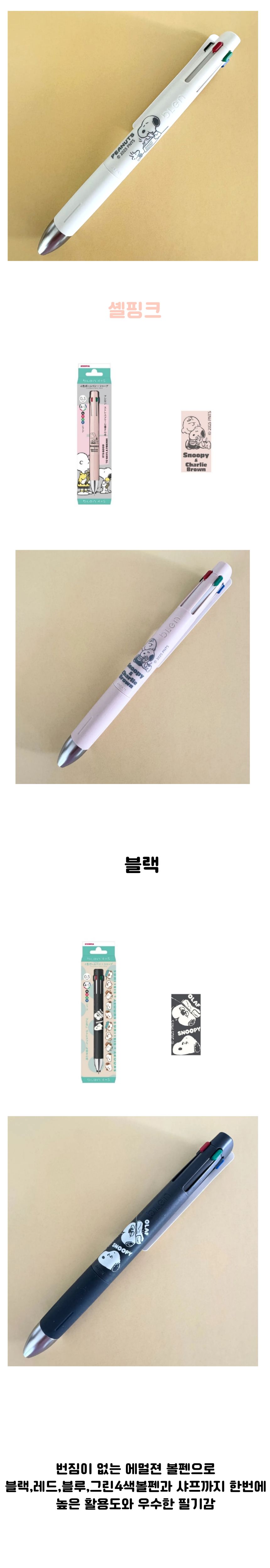 귀여운 캐릭터 스누피 일러스트의 제브라 블렌 4색볼펜 샤프 결합된 4+S멀티펜