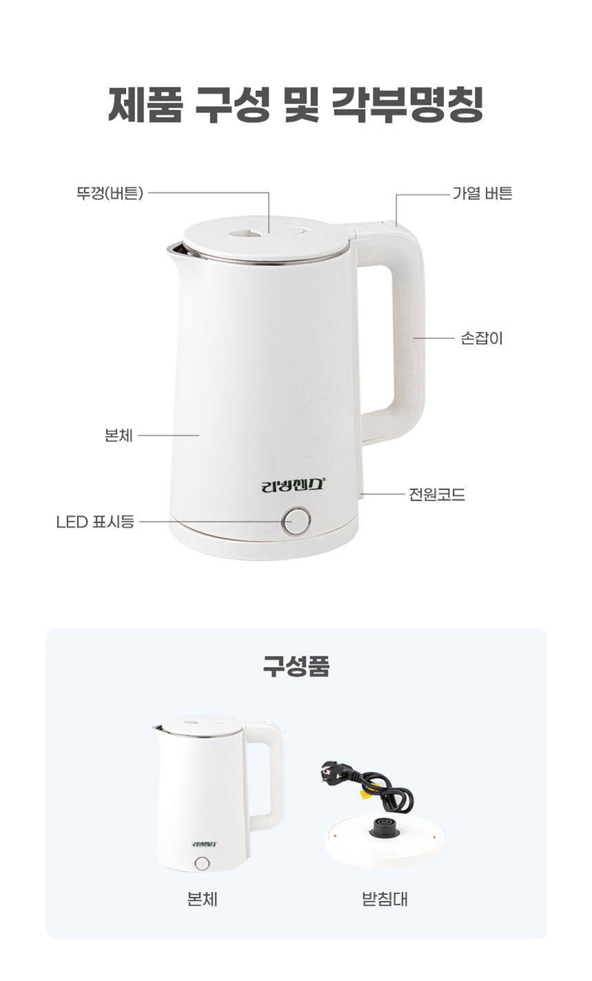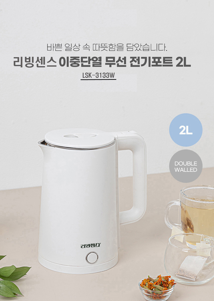 [ 제품 정보 ]* 제품명 : 리빙센스 이중단열 무선 전기포트 2L* 용량 : 2L* 안전인증번호 : HU072256-19010N* 전자파식별번호 : R-R-UML-KE3006* 정격전압/소비전력 : 220V/ 60Hz 1500W* 재질 : 스텐레스,PP,실리콘* 원산지 : 중국OEM뻔하지 않은 Fun 한 쇼핑주방,생활용품 전문샵람스네에서자신있게 추천드립니다.?믿고 구매하셔도 좋습니다.