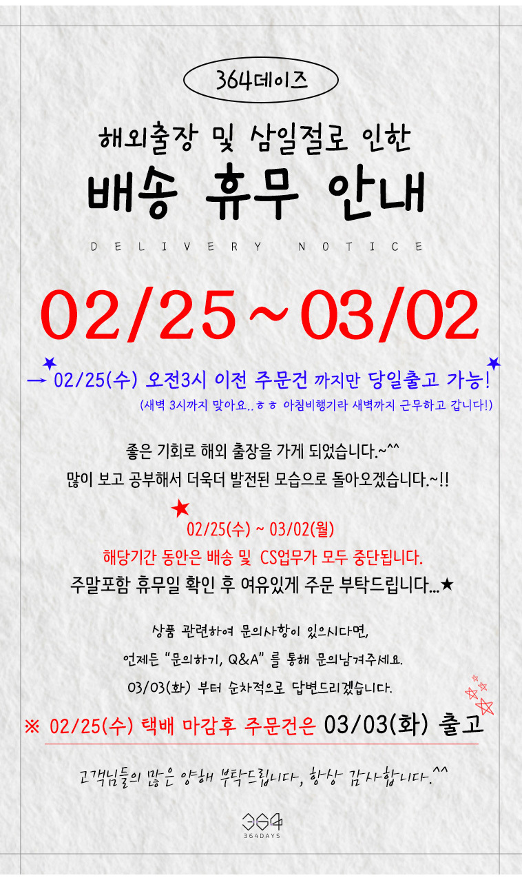 - 배송기간은 주문일(무통장입금은 결제완료일)로부터 1일(24시간) ~ 5일정도 걸립니다.