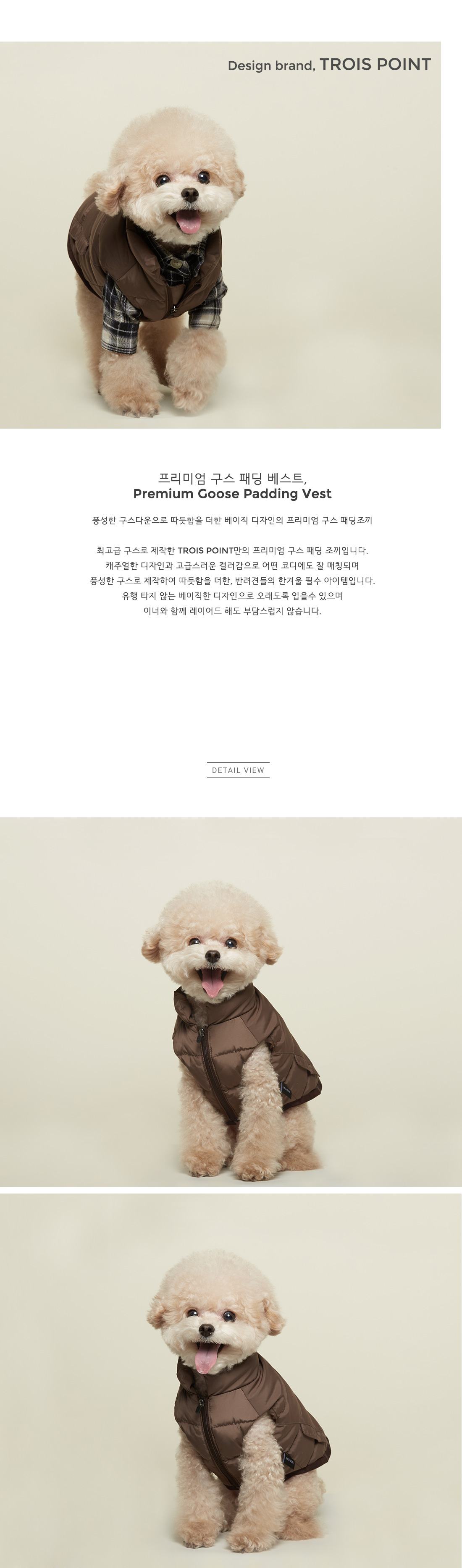 프리미엄 구스를 풍성하게 넣어 따듯함을 더하고, 베이직한 4가지 컬러와 캐주얼한 디자인으로 추운 겨울 반려견들의 따듯함을 함께해줄 데일리아이템입니다. 이너와 함께 입어도 부담스럽지 않으며 안정된 착용감으로 오래도록 따듯하게 착용할 수 있는 프리미엄 구스 패딩 조끼 입니다.
