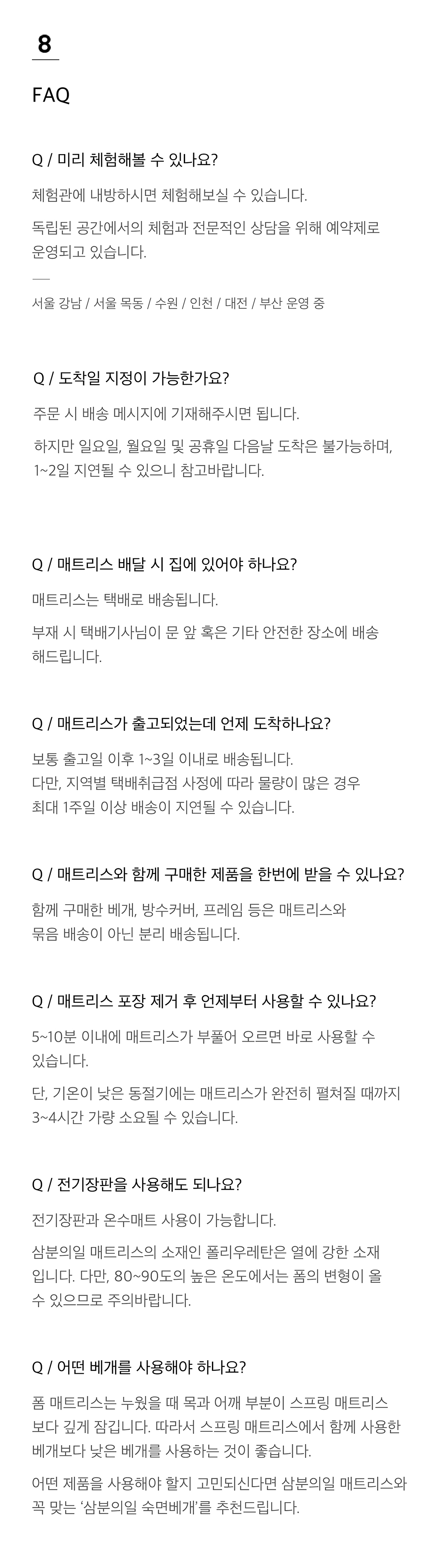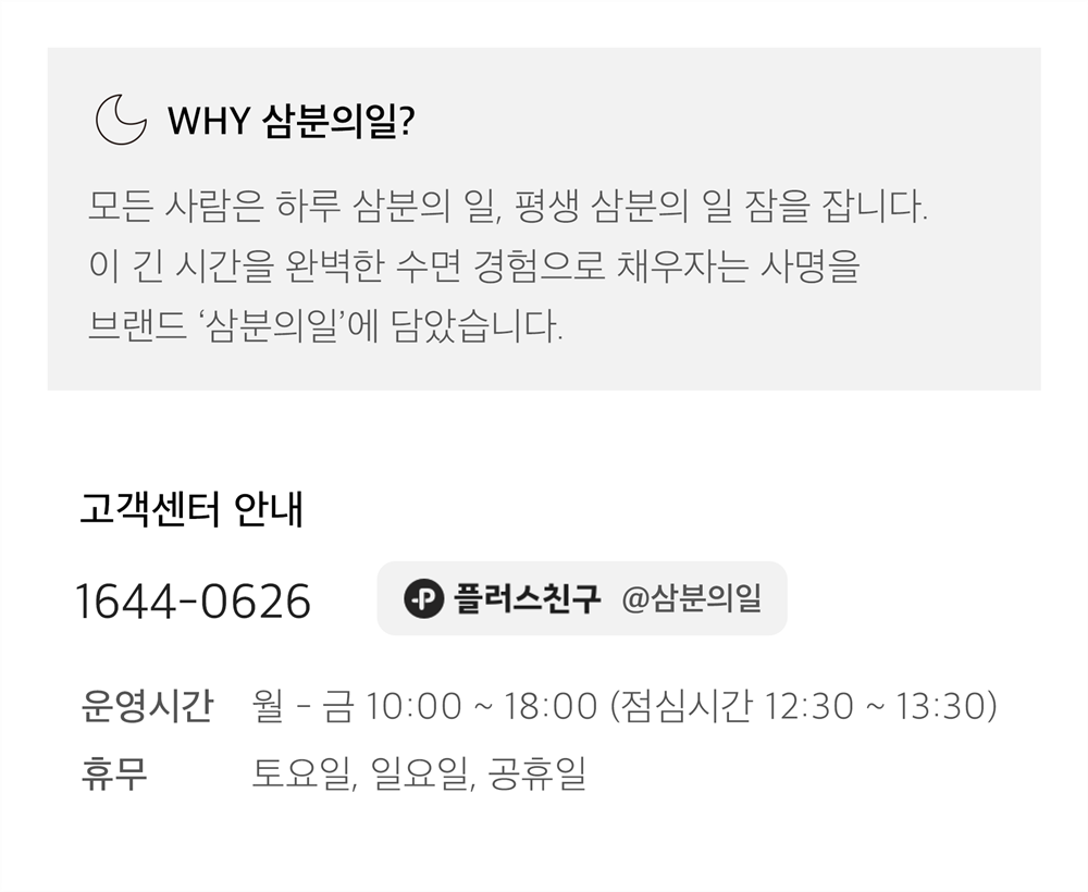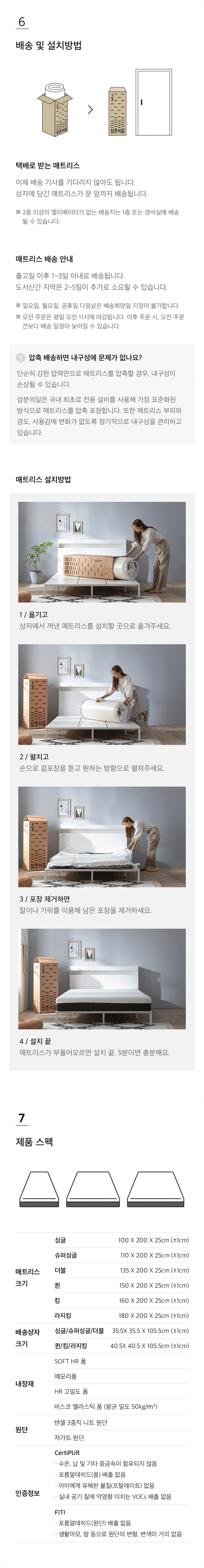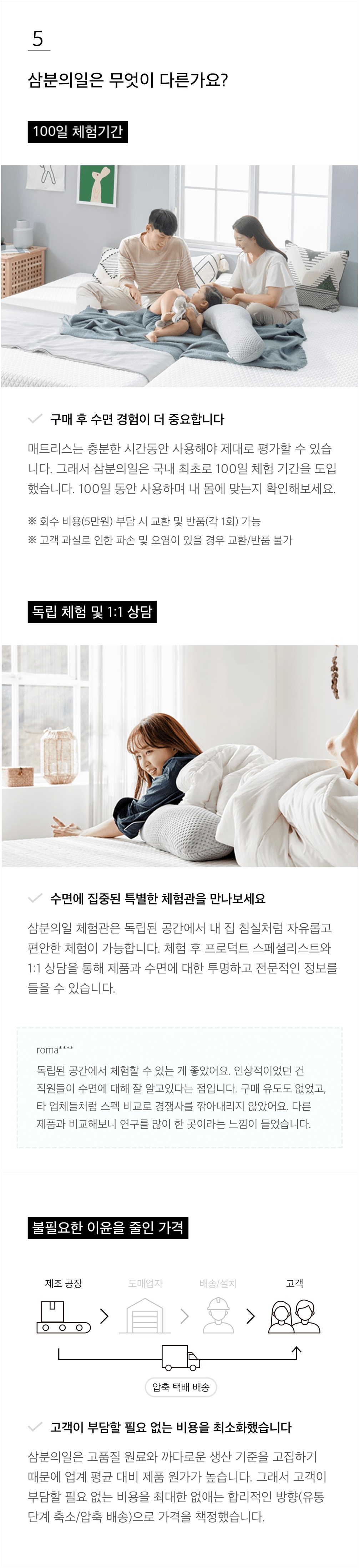 | <매트리스 100일 체험 서비스> 매트리스는 충분한 시간 동안 누워보고, 잠도 자야 내 몸에 맞는지 확인할 수 있습니다. 그래서 삼분의일은 모든 고객에게 매트리스 100일 체험 서비스를 제공합니다. 매트리스를 100일 동안 마음껏 사용하며 몸에 맞는지 확인해 보고, 몸에 맞지 않으면 제품 수령 후 100일 이내에 언제든지 교환/반품할 수 있습니다. - 매트리스 수령 15일 이후부터 100일 이내 신청 가능하며, 동일한 사이즈로 타입 교환 1회, 반품 1회 가능합니다. - 매트리스를 교환하는 경우 100일 평가 정책 기간은 갱신되지 않으며, 처음 도착한 날로부터 100일까지만 해당 정책이 적용됩니다. ※ 교환, 반품 비용 매트리스 100일 체험 서비스를 통해 교환 또는 반품을 요청하는 경우 구매자가 비용을 부담합니다. 교환 또는 반품 진행에 따른 비용은 매트리스 1개 당 5만원입니다. 단, 제주, 도서 지역은 추가 비용이 책정될 수 있습니다. (교환 또는 반품 진행 비용은 추후에 변동될 수 있습니다.) - 공정 결함 등 품질보증에 범위에 해당하는 경우 삼분의일에서 교환 또는 반품 진행에 따른 모든 비용을 부담합니다. --- <7년 품질보증> 1. 교환, 반품 안내 - 제품을 받은 날로부터 100일 이내 교환, 반품 가능 (매트리스 100일 체험 서비스) - 제품에 하자가 있는 경우, 무상 교환, 반품 가능 - 제품에 하자가 없는 경우, 반품 비용 50,000원 - 제주도 등 도서 산간 지역 추가 요금 발생 2. 수선 안내 - 제품을 받은 날로부터 1주일 이내 봉제 불량이 발견된 경우 수선 및 교환 가능 - 겉감(커버) 결함은 수선 혹은 새 겉감으로 교환 3. 무상 교환 및 반품 가능 조건 - 육안으로 식별이 가능한 3cm 이상의 영구적인 눌림 - 의도에 맞게 사용하고 적절하게 유지·관리했음에도 불구하고 폼이 균열된 경우 - 제품을 받았을 때 겉감이 찢어져 있거나, 바늘 땀이 풀려 있는 경우 4. 교환 및 반품이 불가능한 경우 - 구매자나 제 3자의 과실로 인한 제품 손상 - 화재, 홍수와 같은 자연 재해로 인한 제품 손상 - 삼분의일에서 공인하지 않은 채널에서 구매한 제품 - 구매를 증명할 수 없고, 구매자 본인이 아닌 경우 ----- |