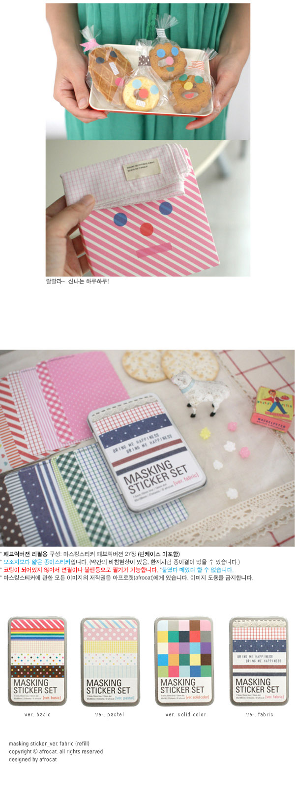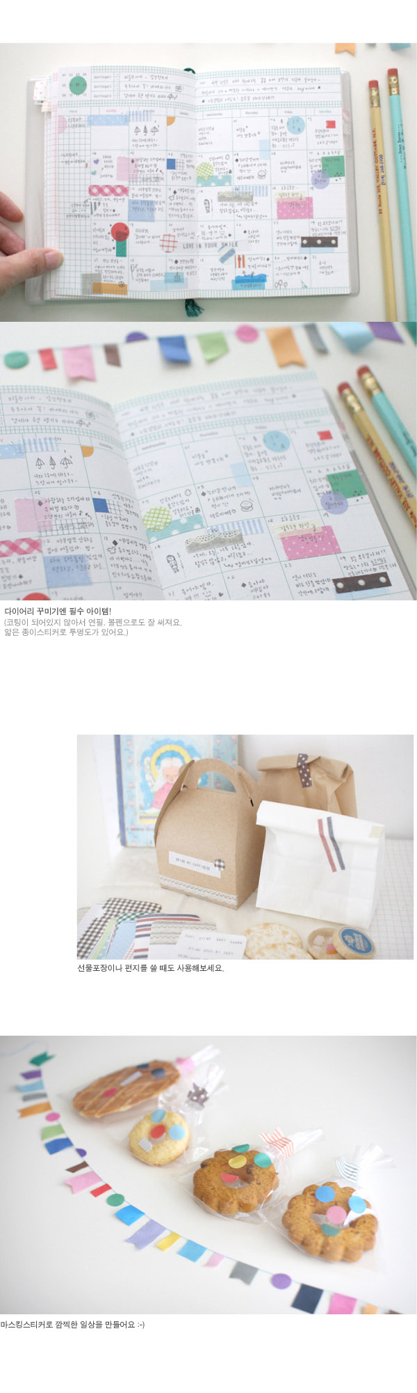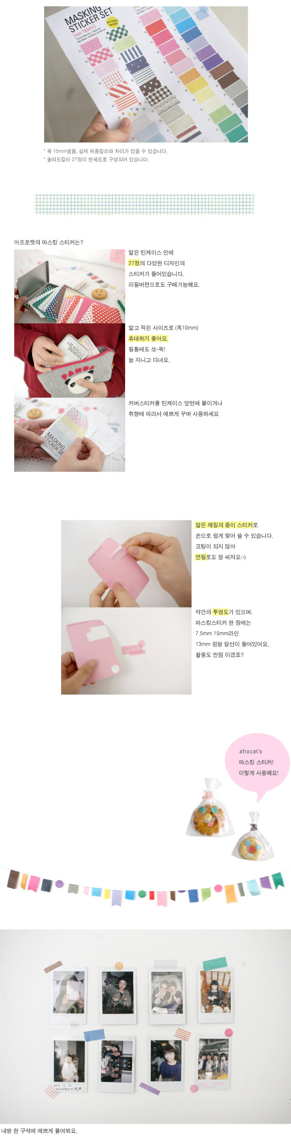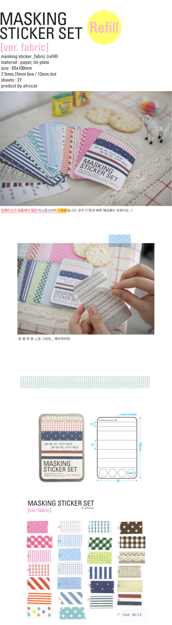 | ** 본 상품은 틴케이스가 미포함된 리필용 스티커입니다. 27가지의 여러가지 패턴들을 모두 만날 수 있는 매력적인 masking sticker. 마스킹스티커는 모조지보다 얇은 종이스티커입니다. 손으로 쉽게 찢어 쓸 수 있고, 단면에서는 종이결이 느껴진답니다. 코팅처리가 되어있지 않아서 여러가지 필기도구로 필기가 가능합니다. 깜짝 놀랄만큼의 여러가지 패턴들, 주머니에도 쏙 넣어다닐 수 있는 작은 사이즈, 내 작은 공간 구석구석 활용도 만점! must have!! masking sticker |