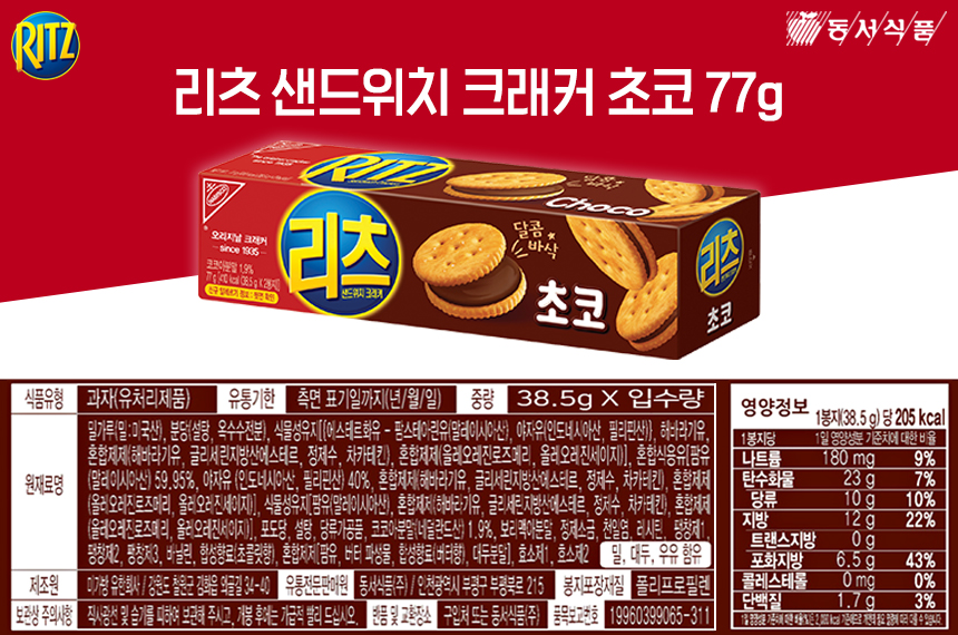 바삭하고 달콤한 맛이 일품인 리츠 샌드위치 크래커 초코입니다. 바삭바삭한 크래커 안에 달콤한 초코 크림이 들어있어요.