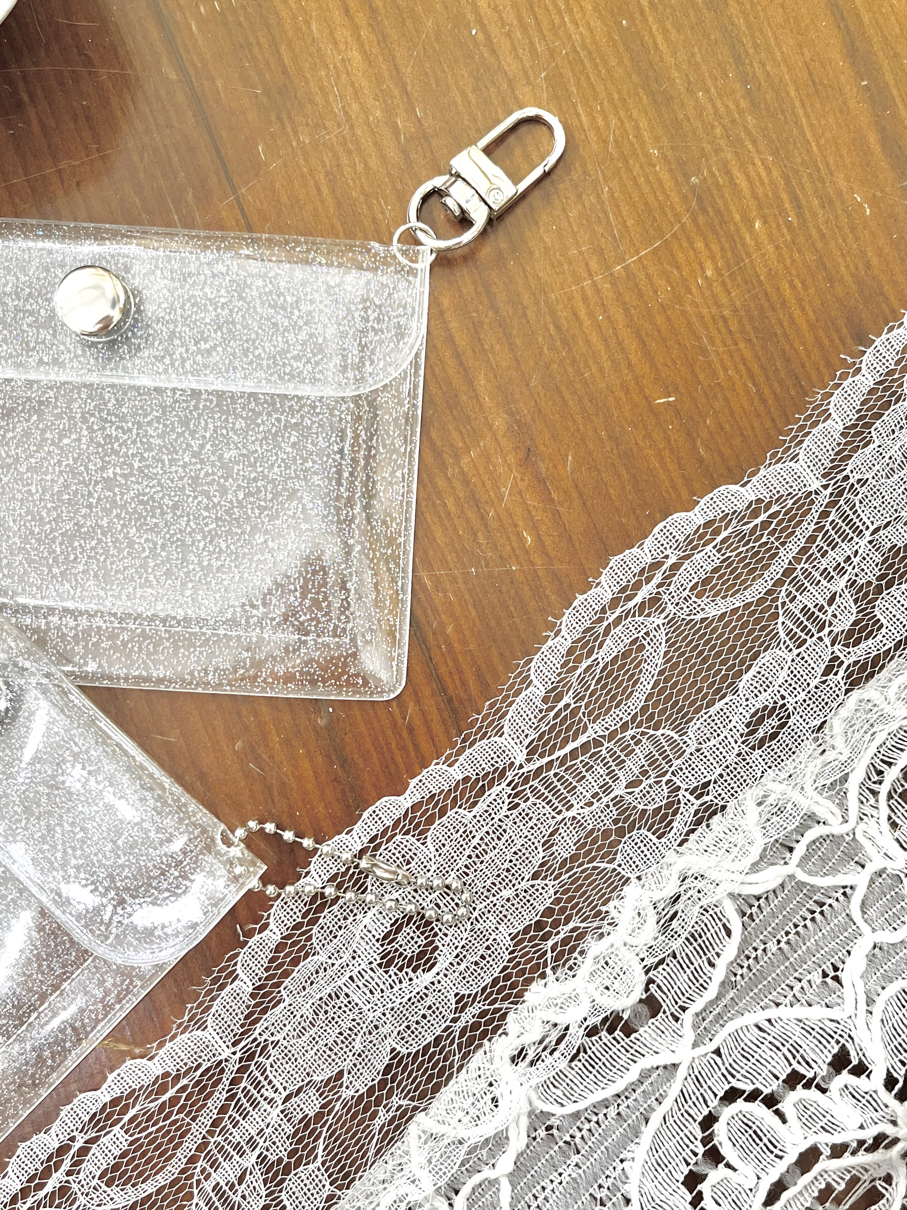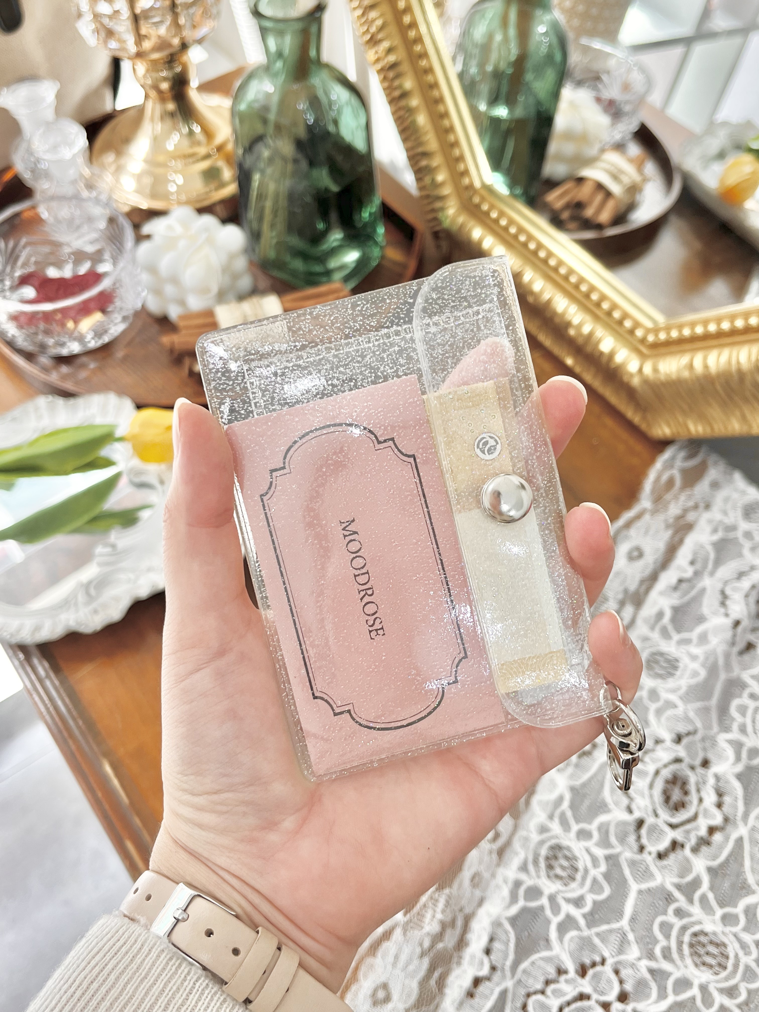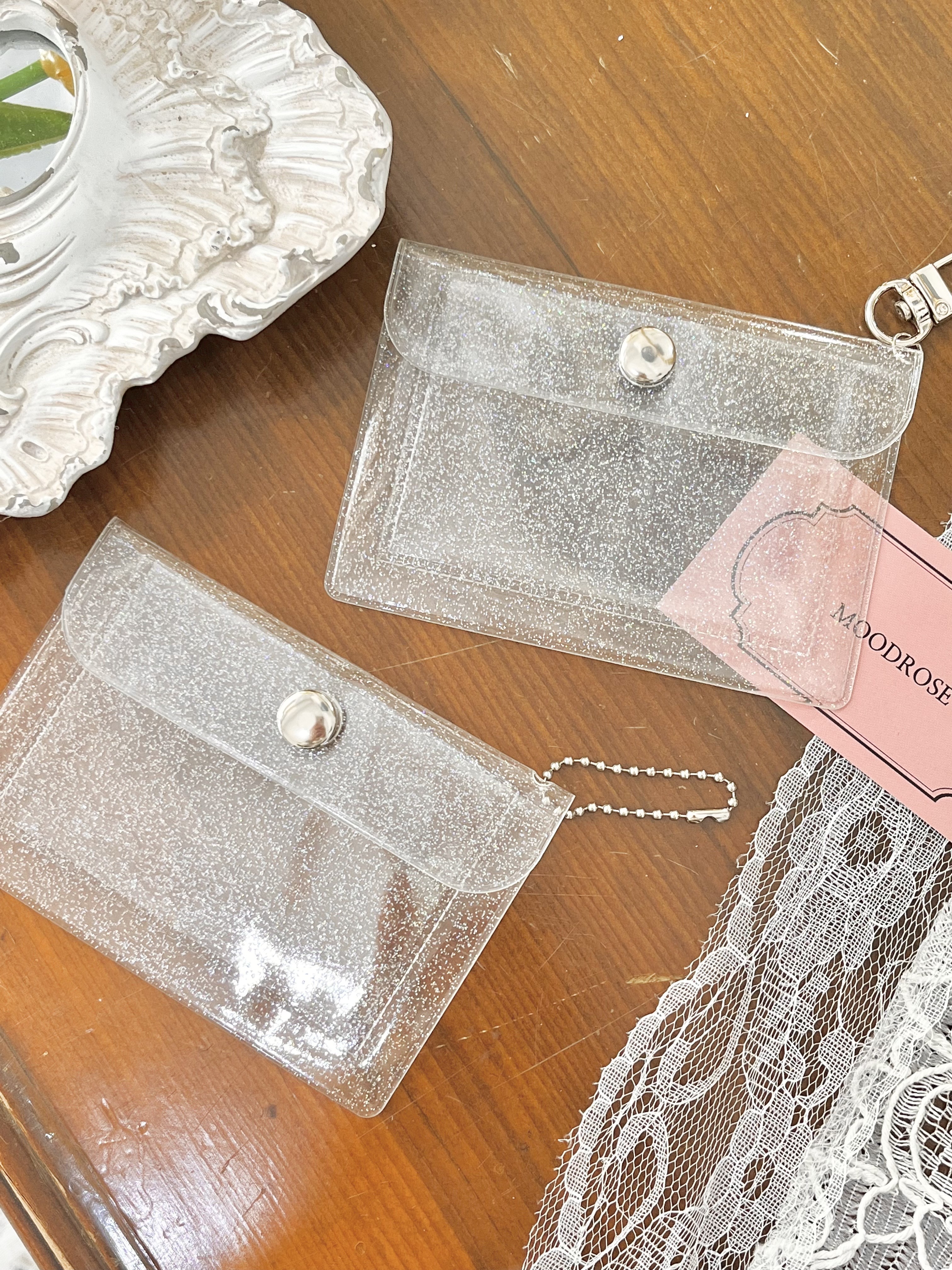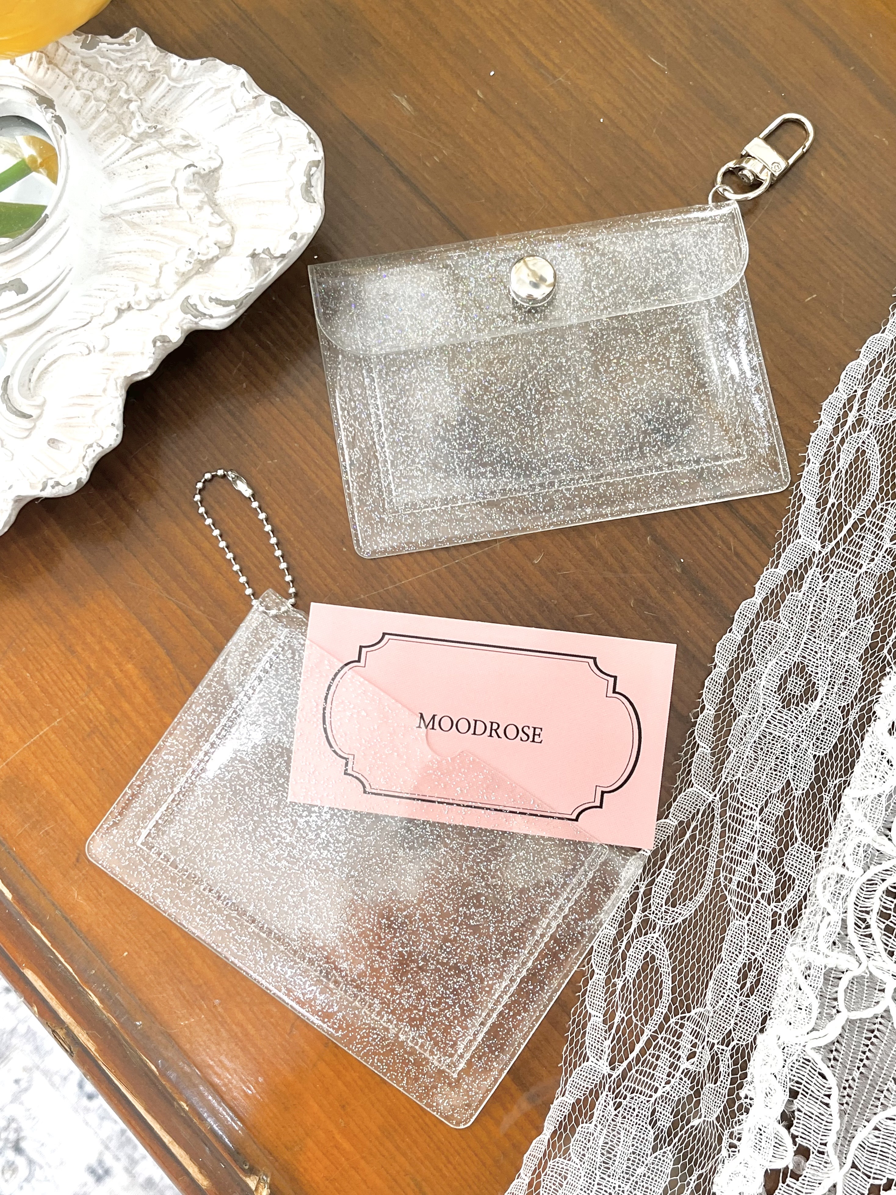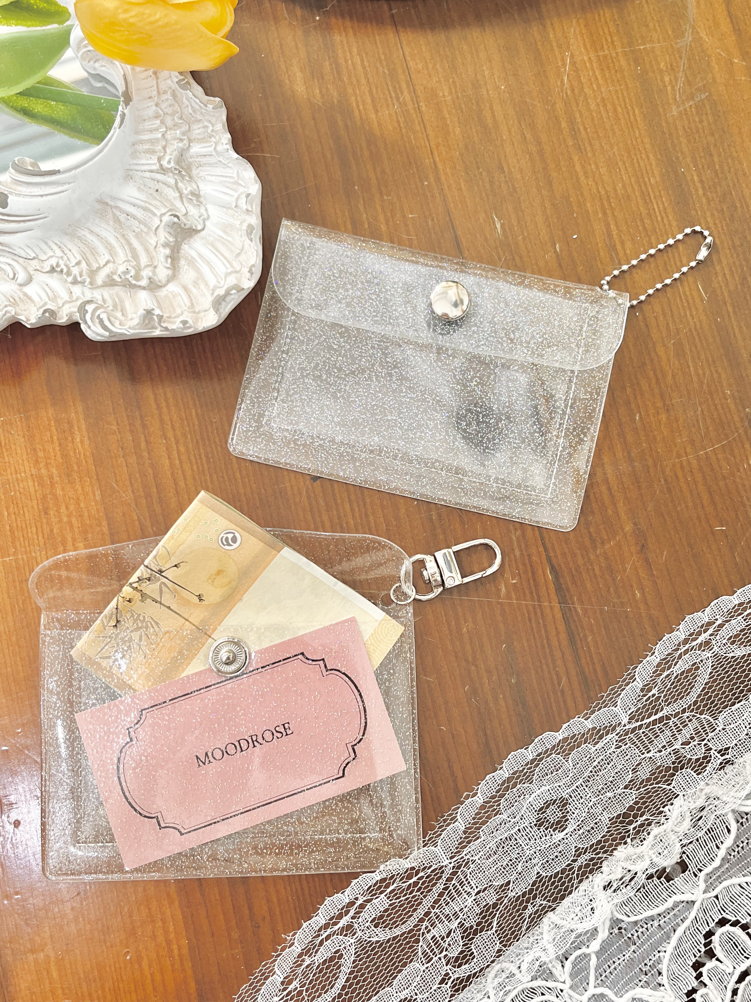 ? 데일리로 들고 다니기 좋은 pvc 소재의 가벼운 글리터 카드지갑입니다. 지갑/포카케이스/명함지갑 등 다양하게 응용하기 좋은 제품이에요! 일반 투명 pvc가 아니라 반짝이는 글리터가 들어가서 더 특별하답니다 :D