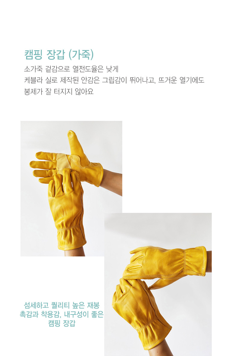 배송비 절약하는 똑똑이들의 현명한 쇼핑*^^* ▼ ▼ ▼ ▼ 현재, 완제품으로 수입, 판매되고 있는 제품은 소량의 이물질이 묻어있거나 미세한 흠집이 있을수 있으며 이는 환, 반품의 사유가 될 수 없으니 주문 전 참고 부탁드립니다. 캠핑용 바베큐 불 불멍 장갑 아웃도어 짱짱한 캠핑 바베큐 안전한 장갑 #소가죽 #캠핑장갑 #화로장갑 #불멍준비 다기능 아웃도어 화로 장갑 야외에서 요리할 때! 열전도율이 낮은 안감! 뜨거운 열기에도 안전! 그을림에 때타고 냄새나는 장갑 이제는 소가죽 화로 장갑으로 안전하게 사용하세요! 선택1. 캠핑장갑(가죽) 선택2. 캠핑장갑(세무) 선택3.캠핑장갑(난연특수도료) 소가죽 겉감으로 열전도율은 낮게 케블라 실로 제작된 안감은 그립감이 뛰어나고, 뜨거운 열기에도 봉제가 잘 터지지 않아요 섬세하고 퀄리티 높은 재봉 촉감과 착용감, 내구성이 좋은 캠핑 장갑 열과 화염에 강한 캠핑 장갑 우리들의 소중한 손을 보호해 줍니다 죽지 않아요 장작 그냥 잡지 마세요! 불멍 필수품 안전장갑 캠핑, 낚시, 바비큐, 불멍, 베이킹 언제든지 내 손을 안전하게 보호! 방화포 유로고니아 장작집게! |