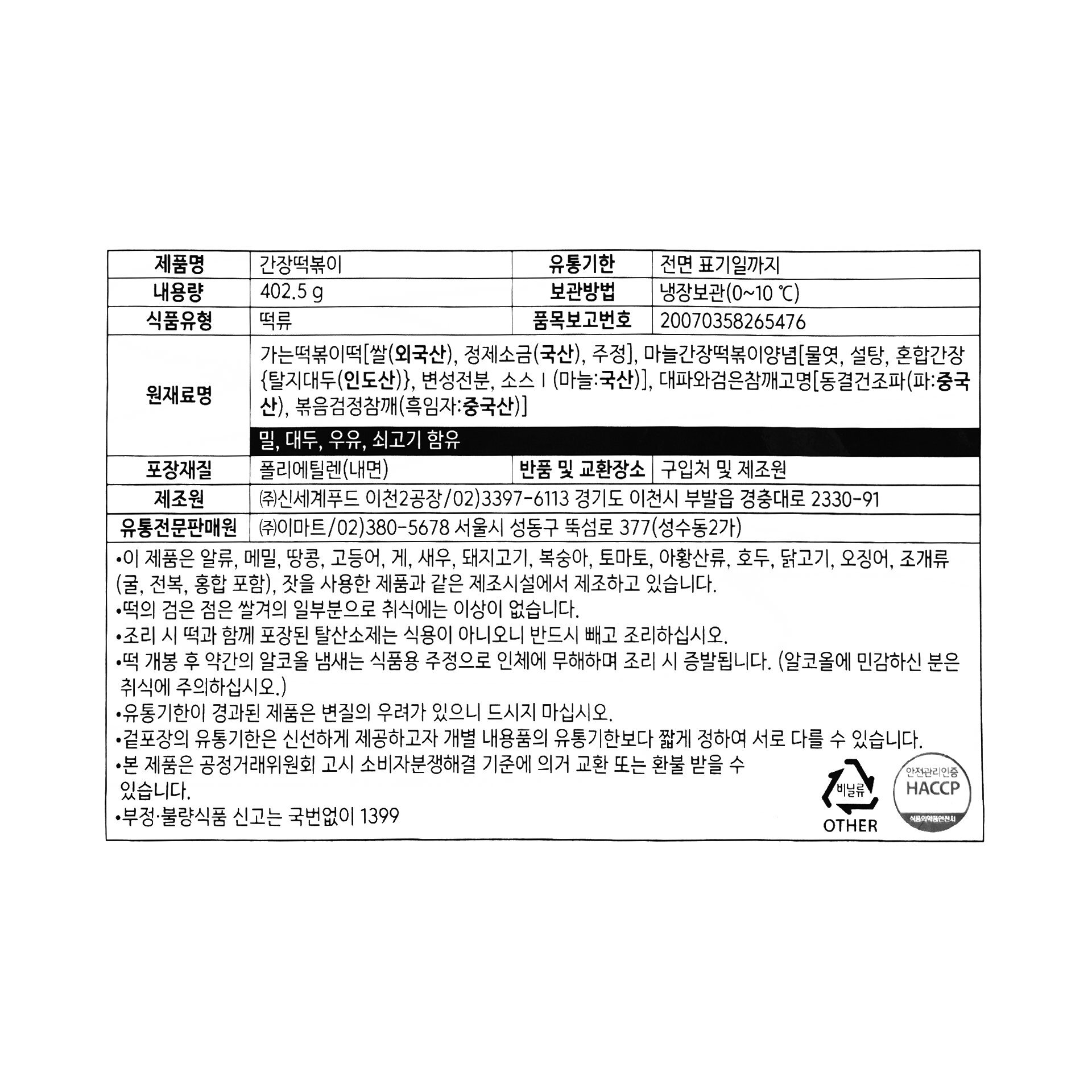 전자상거래 등에서의 상품 등의 정보제공에 관한 고시1. 「식품 등의 표시ㆍ광고에 관한 법률」 및 「식품등의 표시기준」에 따른 표시사항 : 상품상세참고 1-1. 제품명 : 상품상세참고 1-2. 식품의 유형 : 상품상세참고 1-3. 생산자 및 소재지 (수입품의 경우 생산자, 수입자 및 제조국) : 상품상세참고 1-4. 제조연월일, 소비기한 또는 품질유지기한 : 상품상세참고 1-5. 포장단위별 내용물의 용량(중량), 수량 : 상품상세참고 1-6. 원재료명 (「농수산물의 원산지 표시 등에 관한 법률」에 따른 원산지 표시 포함) 및 함량(원재료 함량 표시대상 식품에 한함) : 상품상세참고 1-7. 영양성분 (영양성분 표시대상 식품에 한함) : 상품상세참고 1-8. 유전자변형식품에 해당하는 경우의 표시 : 상품상세참고 1-9. 소비자 안전을 위한 주의사항 (「식품 등의 표시ㆍ광고에 관한 법률 시행규칙」 제5조 및 [별표 2]에 따른 표시사항을 말함) : 상품상세참고 2. 수입식품의 경우 “수입식품안전관리 특별법에 따른 수입신고를 필함”의 문구 : 상품상세참고 3. 소비자 상담 관련 전화번호 : 상품상세참고 ![]() |