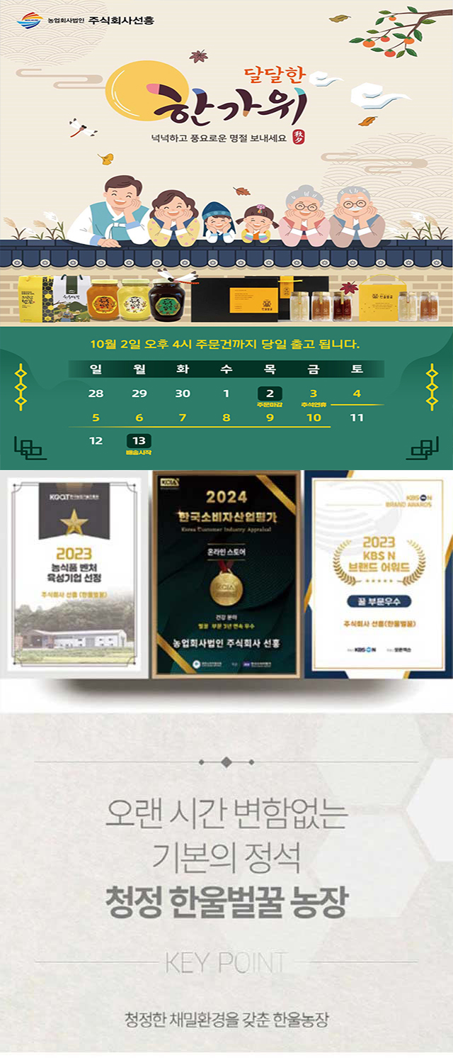 소비자산업평가 벌꿀부문 소비자만족도상 수상 1) 22년~24년 3년연속 한국소비자 산업평가 벌꿀부문 1위 2) 2023년 농식품 벤처 육성기업 선정
