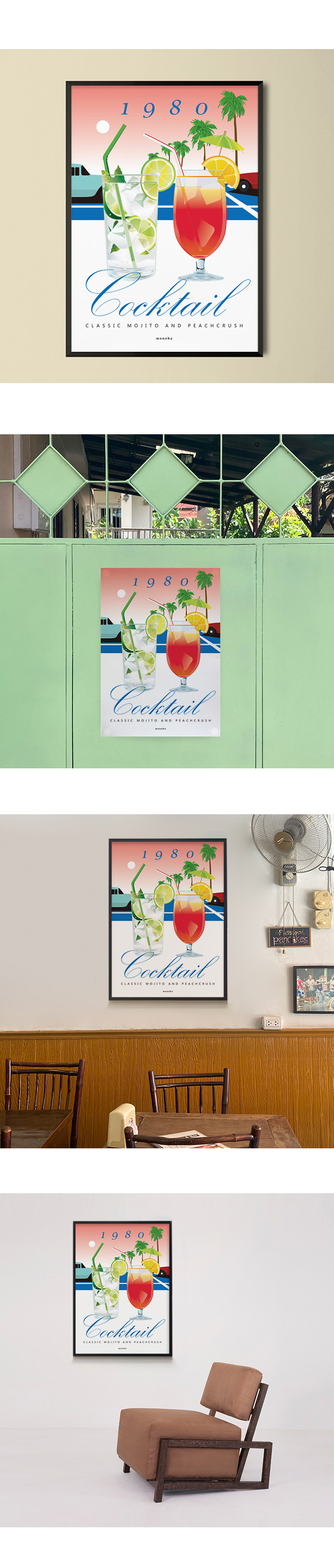 모히또와 피치크러시를 선명한 색감의 시티팝 스타일로 담아본 칵테일 포스터입니다.