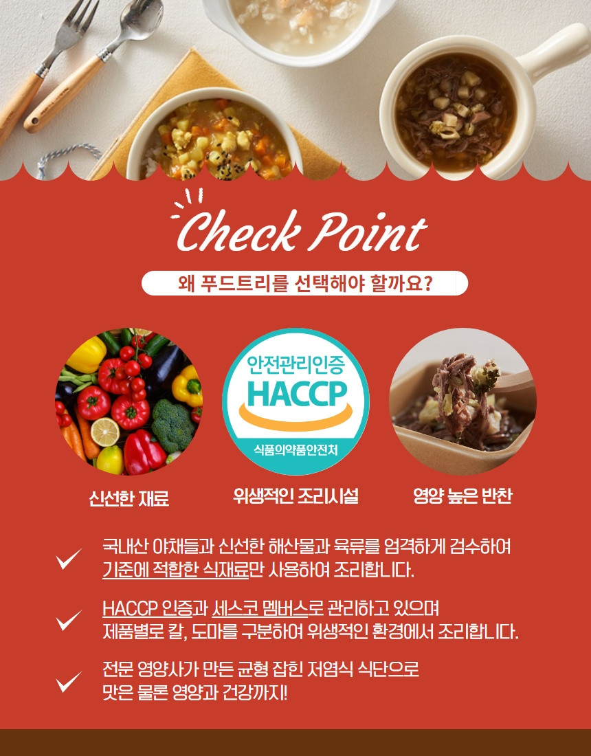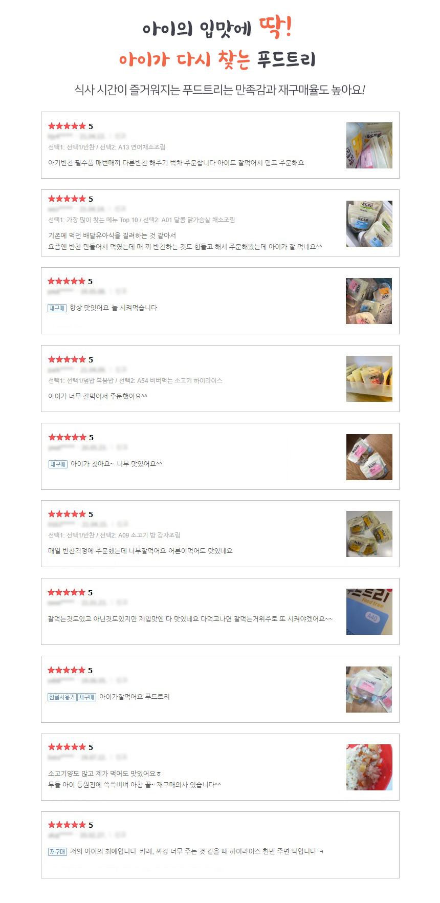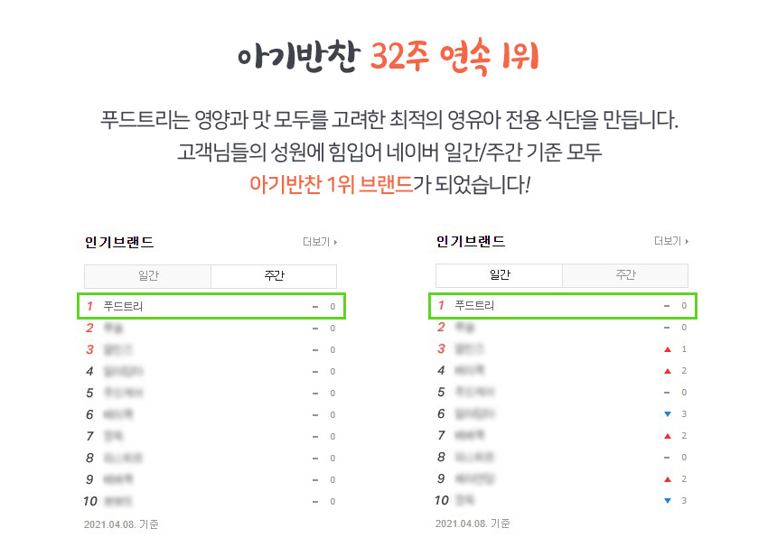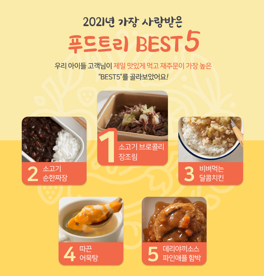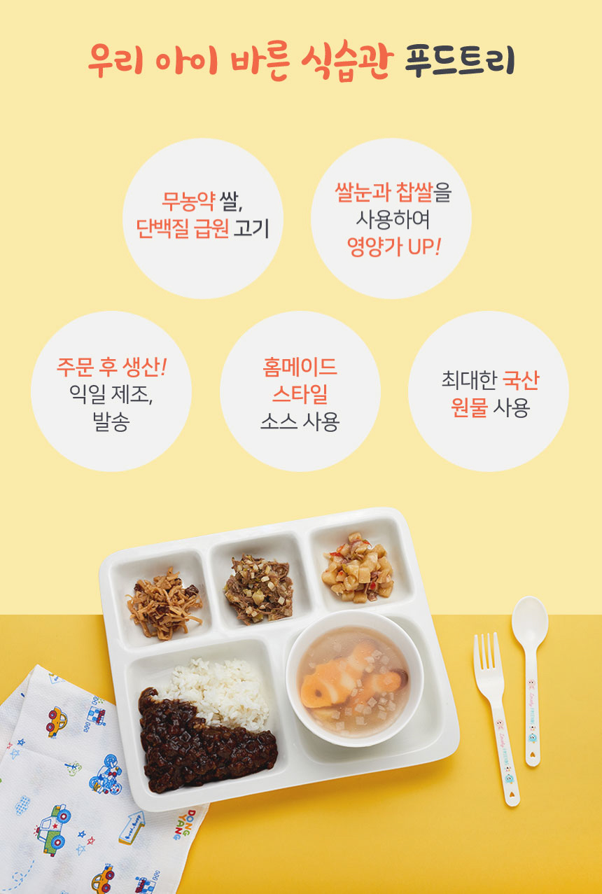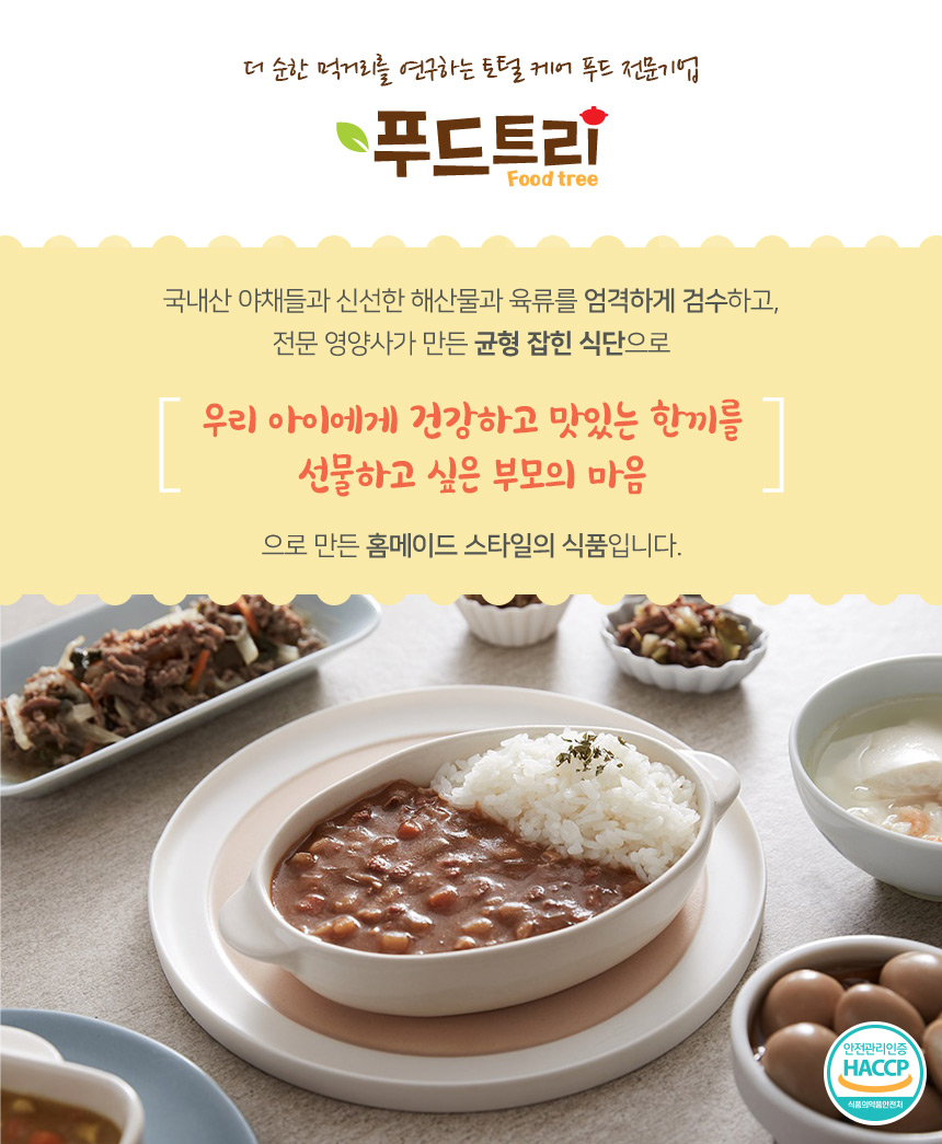 식탁에서 아이와의 싸움에 지친 엄마, 아빠를 위해 아이반찬 전문가들이 만든 홈메이드 스타일의 반찬을 전해드립니다 ? 육아카페 엄마들이 극찬을 하게된 비밀.... 직접 확인하세요 어린이들이 먹는 음식에는 전문성이 필요해요 재료를 엄선하고 성장에 필요한 영양을 고려한 레시피를 만들고 아이가 잘 먹을 수 있게 입자를 잘게 만드는 등등등 신경 쓸게 참 많죠? ? 어려운 일은 푸드트리 전문가들이 대신해드립니다 ? 전문 기업을 믿고 맡겨주세요