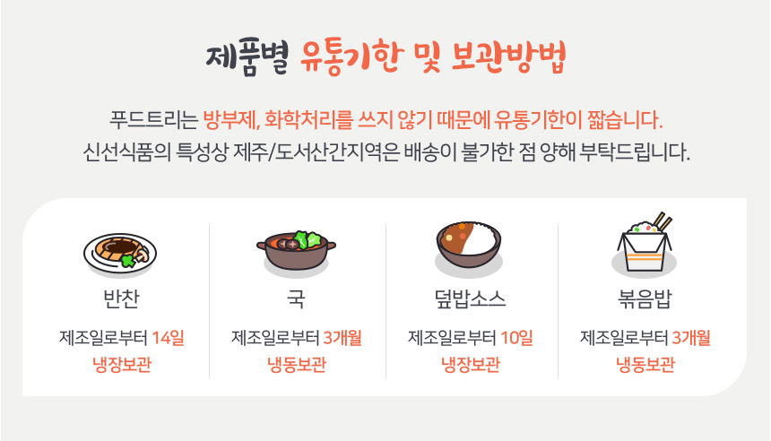?반찬&죽 [ 제조일로부터 14일 ] 덮밥소스 [ 제조일로부터 10일 ] 국&볶음밥 [ 제조일로부터 90일-냉동 보관 ] 생선 [ 제조일로부터 1년-냉동 보관 ] ?
