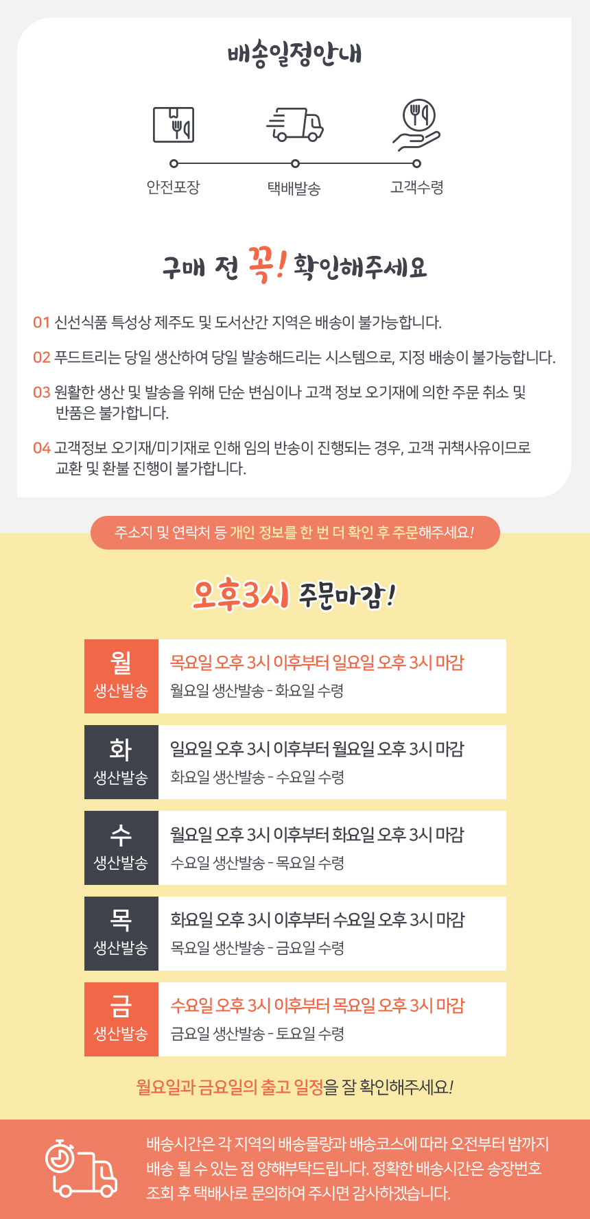 주문 하시고 수령까지 2~4일 정도 소요됩니다 재료 본연의 맛은 살리고 인체에 해로운 것은 넣지 않았기에 택배 수령 후 바로 냉장보관하시고 개봉 후에는 바로 바로 드시길를 권해드립니다