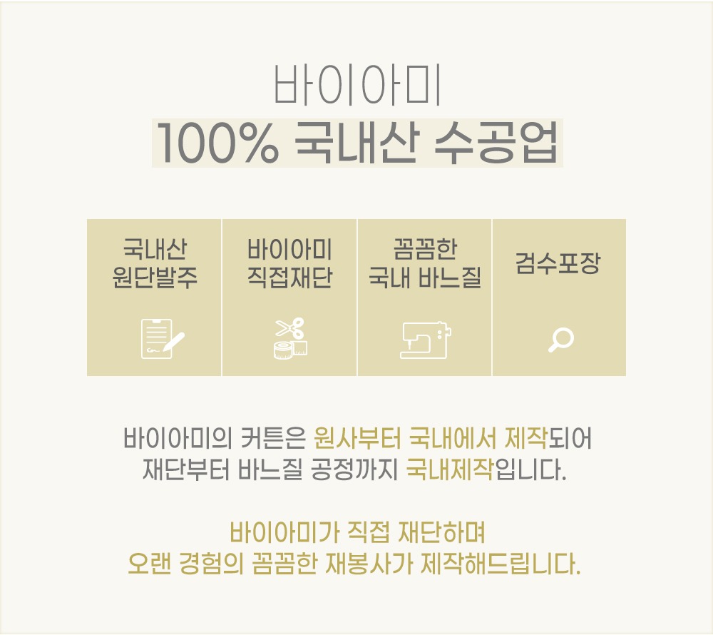 ![]() ※since2009 수년간의 경험을 통한 노하우로 원단선택부터 제작, 마감까지 최고의 재봉사와 함께 바이아미에서 진행합니다. 실용적인 디자인과 국내 원단을 합리적인 가격에 만나보실 수 있습니다. 가격거품을 최소화하면서도 고객분들께 최대의 만족을 드릴 수 있게 항상 최선을 다하겠습니다.