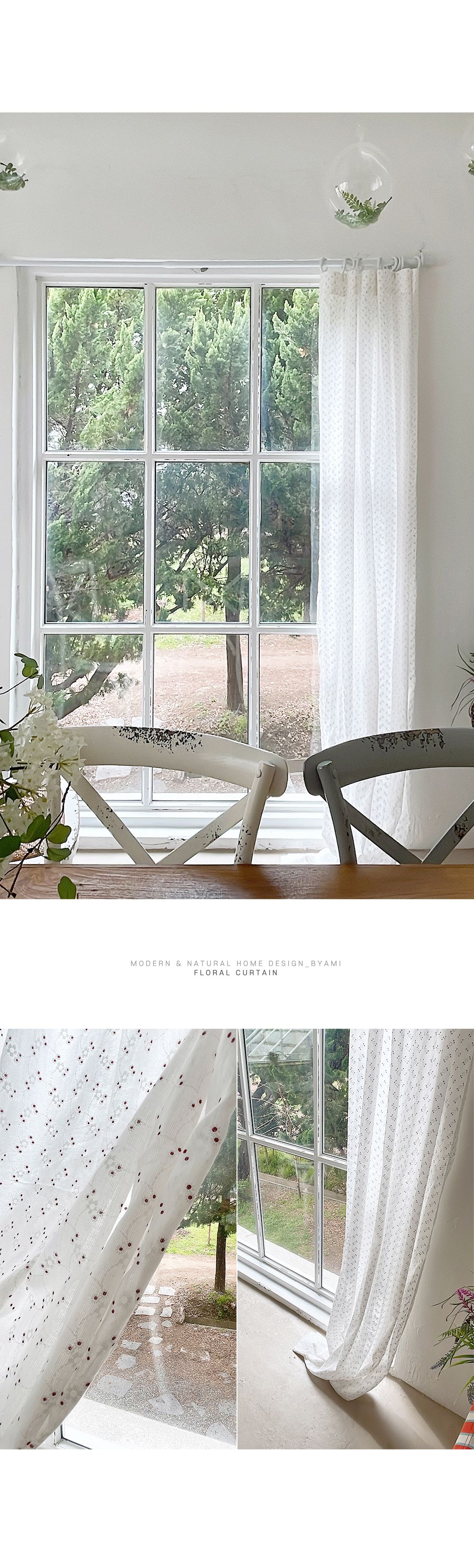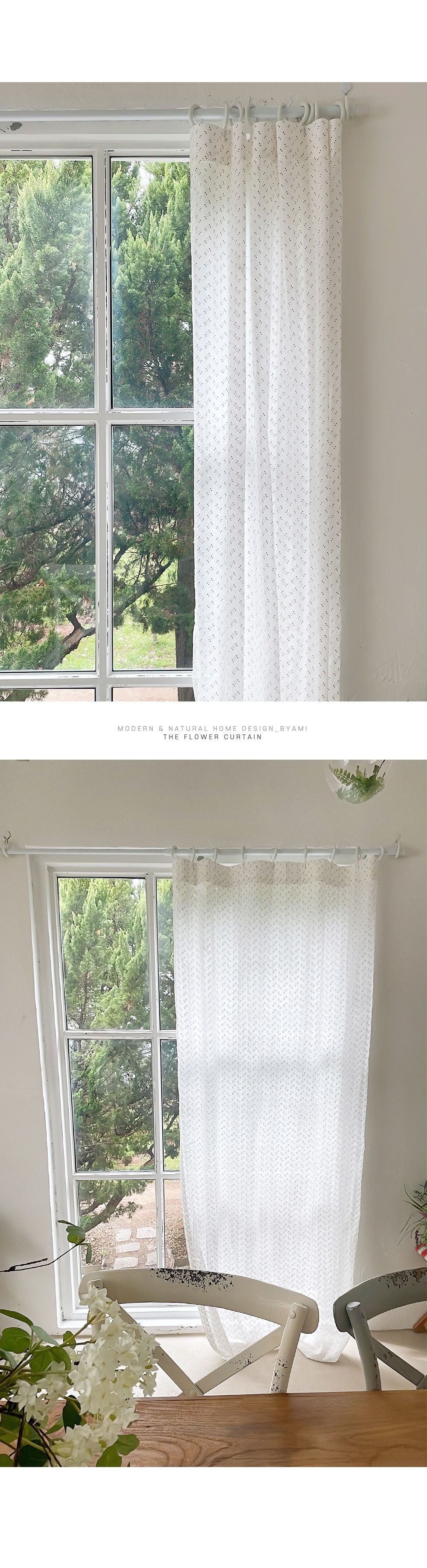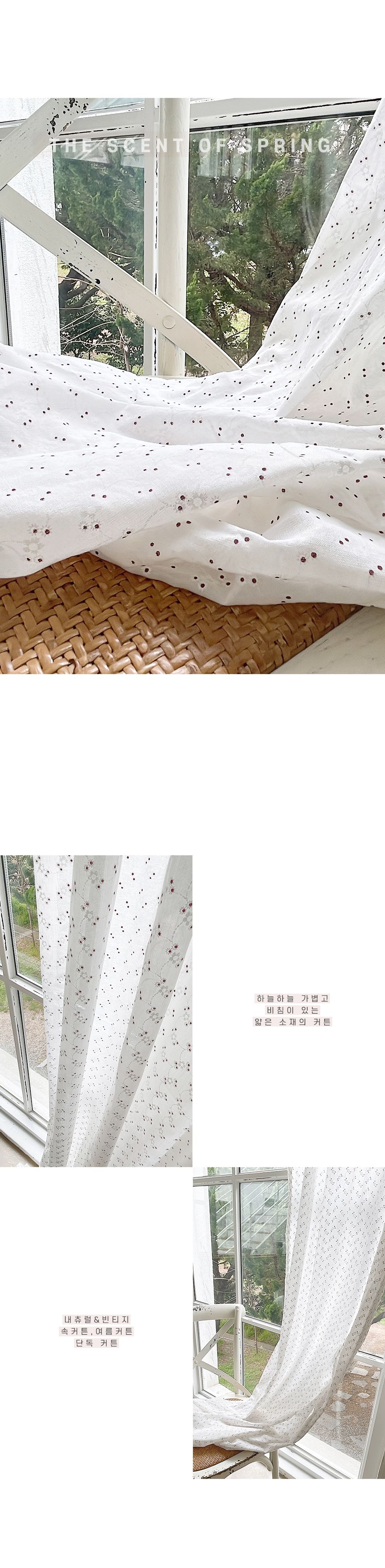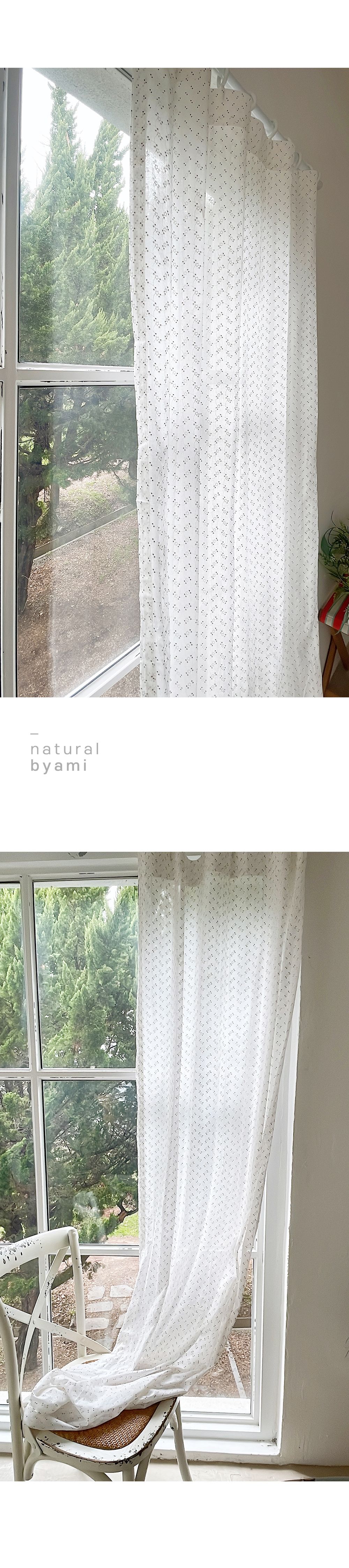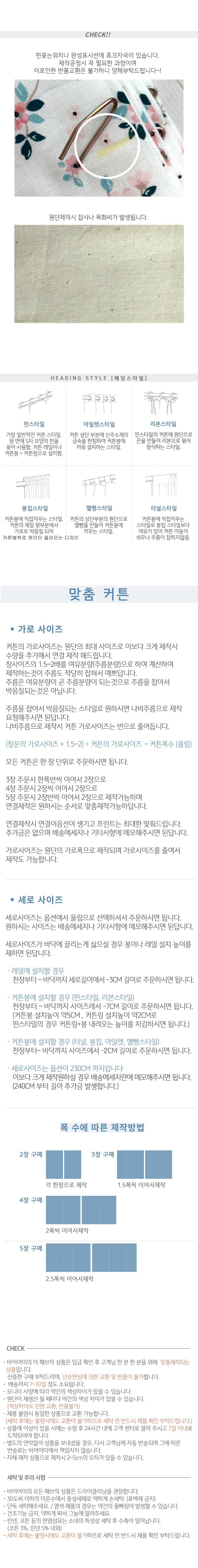<디자인> 하늘하늘 가볍고 비침이 있는 얇은 소재의 커튼입니다. 쉬폰보다 비침은 덜하구요 좀더 내츄럴하면서 빈티지한 느낌의 프린트가 더해져 단독커튼으로 사용하셔도 이쁘답니다. 얇은 소재라 빛차단이나 방한효과는 거의 없답니다. 속커튼이나 여름커튼으로 사용하시기 좋아요 제조사-바이아미 제조국-국내 바이아미의 커튼은 원사부터 국내에서 제작되어 재단부터 바느질공정까지 국내제작입니다. 오랜경험의 꼼꼼한 재봉사가 제작하는 바이아미의 믿을 수 있는 공정을 눈으로 확인해주세요 ![]() ★바이아미에서 주문 후 제작되는 상품입니다. 제작이 완료된 상품을 보내드리는게 아니라 주문이 들어오면 제작에 들어가는 방식입니다. 재고를 쌓아두지 않습니다. ^^ 제작기간이 3~5일 소요되며 세로길이 변경가능합니다. 변경사항은 제작전에 알려주시면 된답니다. 제작은 당일 오후1시에 들어가니 1시 전에 고객센터로 연락주세요 ![]() ○ 기본헤딩스타일은 핀스타일입니다. 핀스타일은 커튼봉+커튼링에 설치하시거나 레일에 설치가능합니다. 커튼이 끌리지 않게 원하시면 커튼봉+커튼링에 설치시 전체길이에서 -8CM 커튼봉 설치시(터널스타일로 제작시) -5CM 레일에 설치시-3CM차감하면 된답니다.