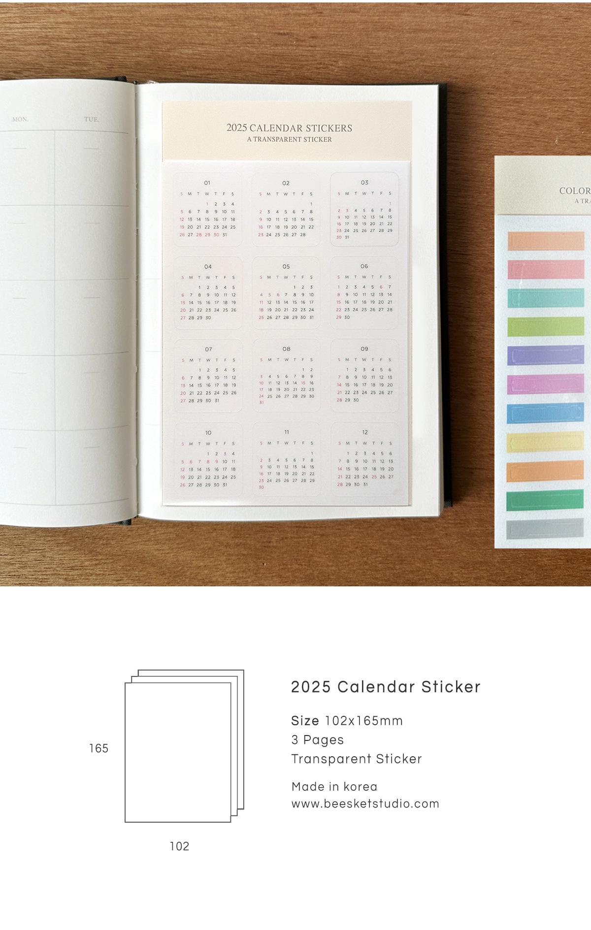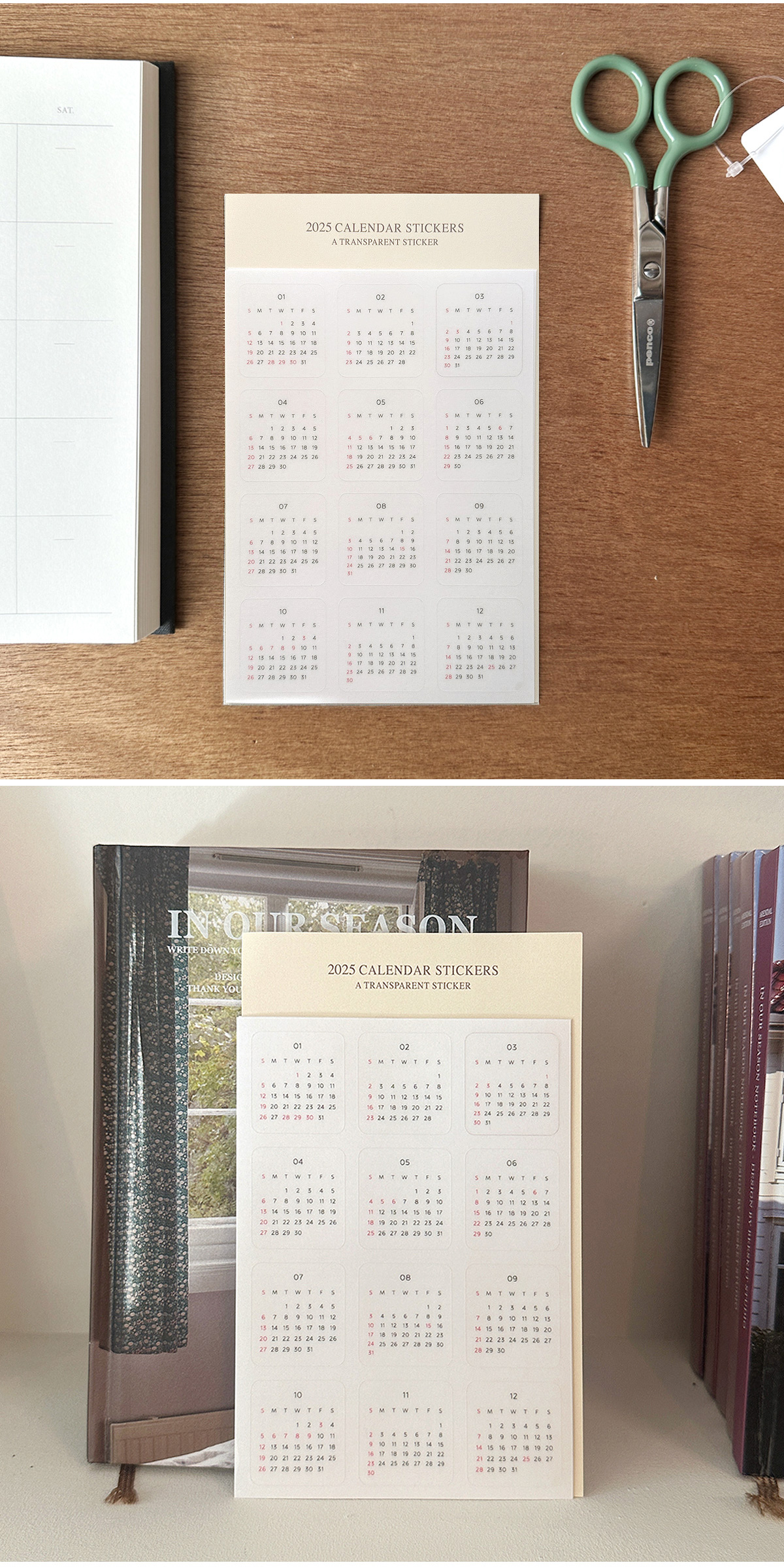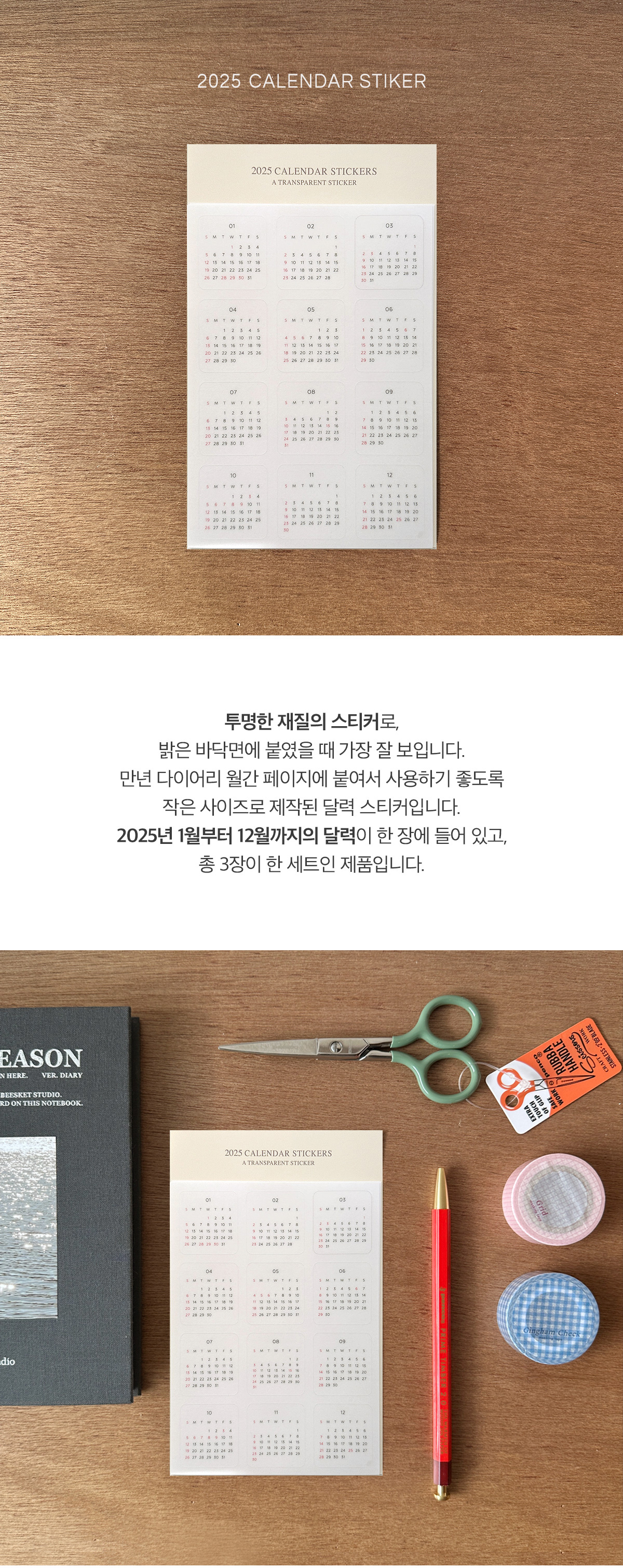 2025년 1월부터 12월까지의 달력이 한 장에 들어 있고, 총 3장이 한 세트입니다.