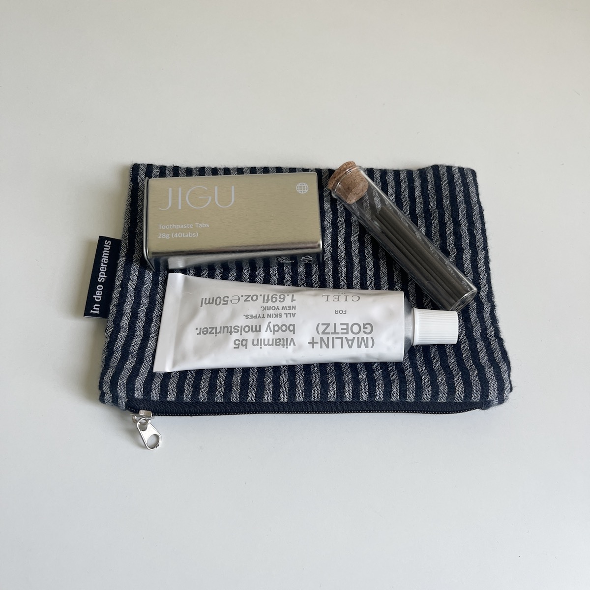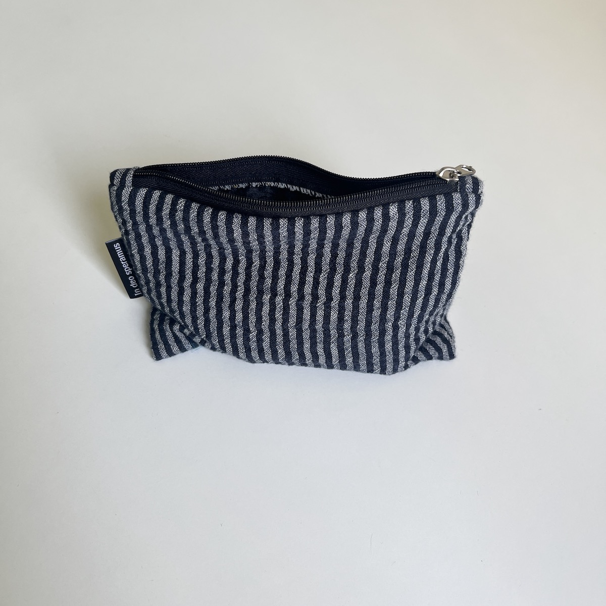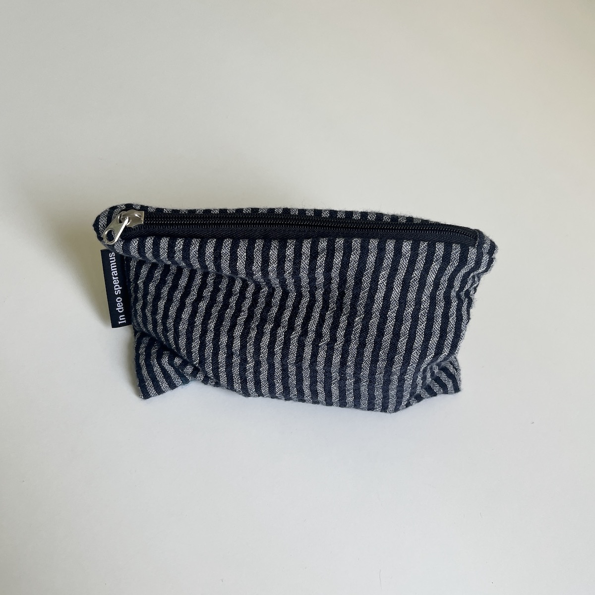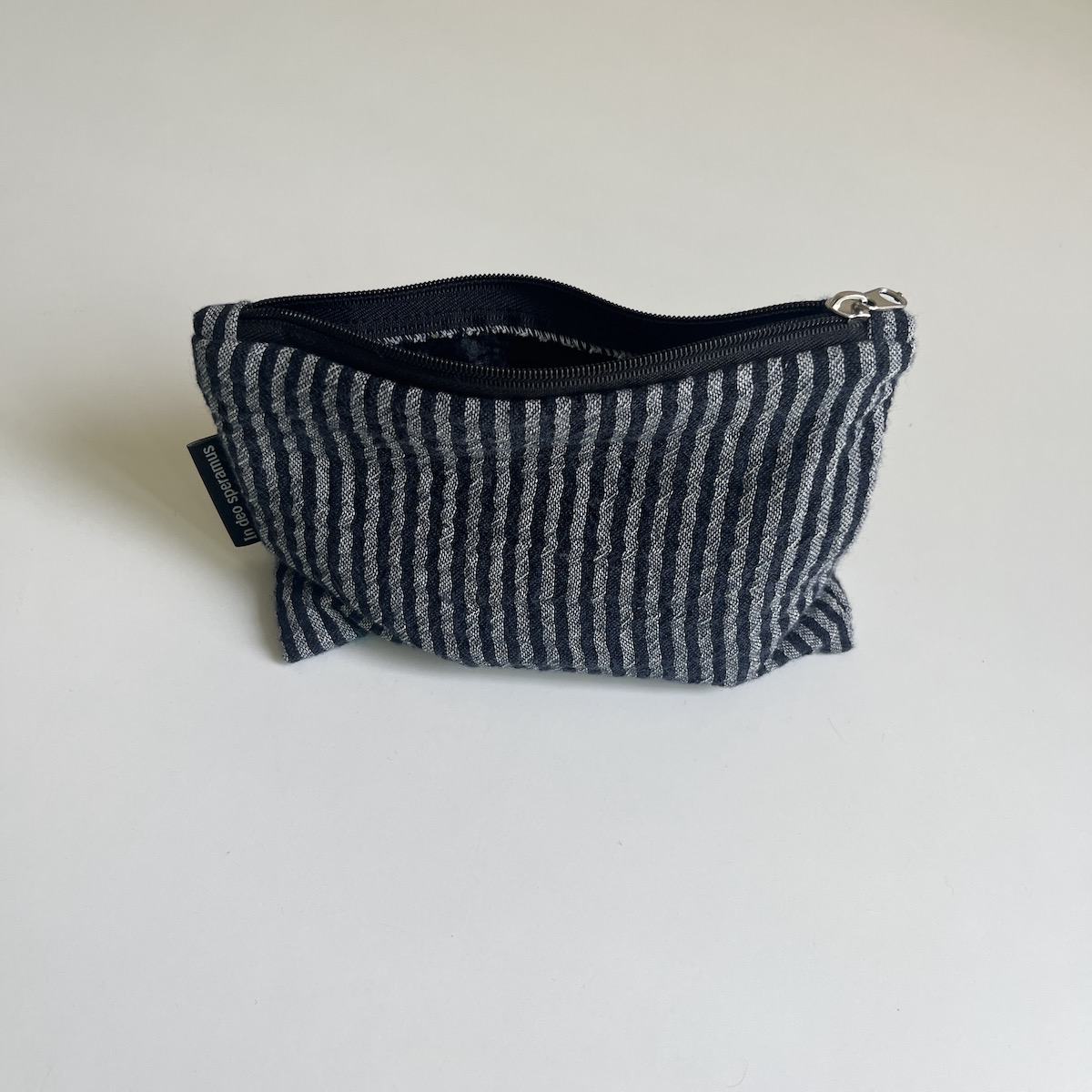 상품 설명 빈티지한 줄무늬가 매력적인 파우치입니다. 팩트1개 립3-4개 소지 가능한 사이즈입니다. 발수 기능이 있는 안감 원단을 덧대어 제작하여 보다 위생적으로 사용할 수 있습니다. 선물용으로도 추천드립니다.