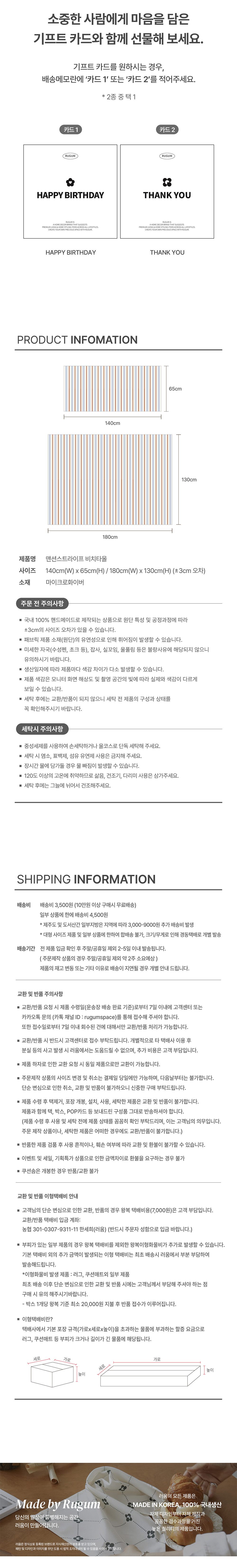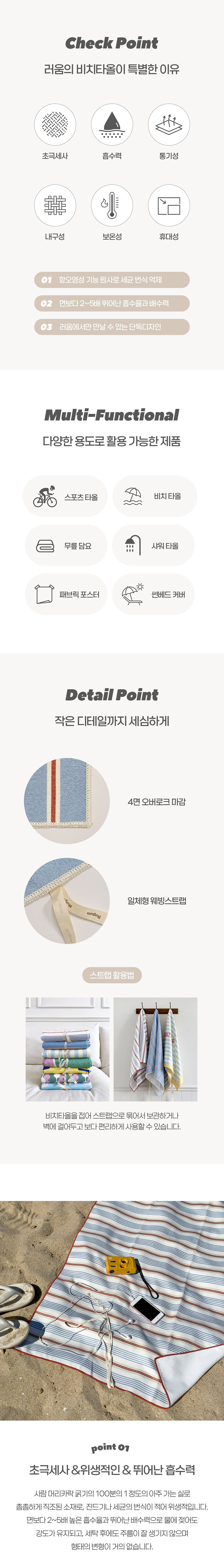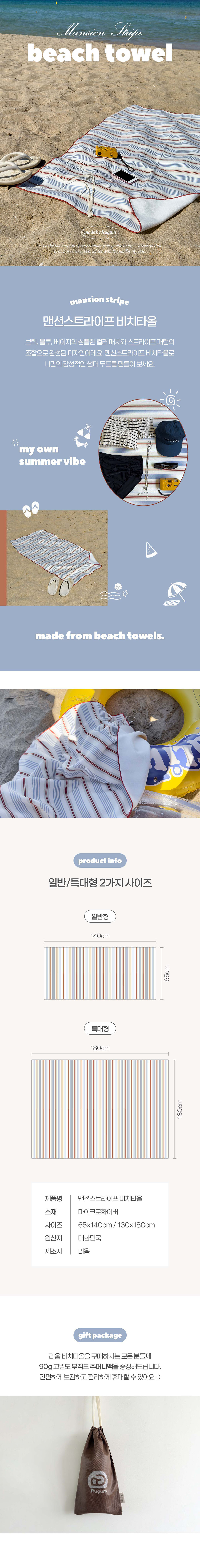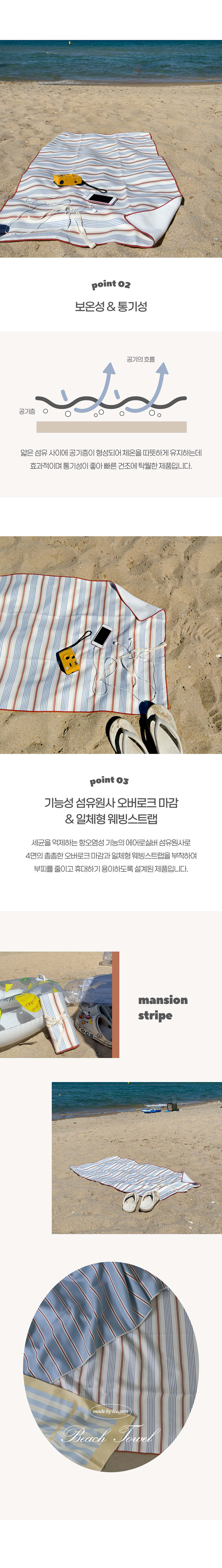 | 브릭, 블루, 베이지의 심플한 컬러 매치와 스트라이프 패턴의 조합으로 완성된 디자인이에요. 맨션스트라이프 비치타올로 나만의 감성적인 썸머 무드를 만들어 보세요. 기능성 섬유 원사로 촘촘하게 짜여진 소재로 흡수율과 배수력이 뛰어나고, 얇은 섬유 사이에 공기층이 형성되어 체온을 따뜻하게 유지하는데 효과적이며 통기성이 좋아 빠른 건조에 탁월합니다. 4면의 촘촘한 오버로크 마감과 일체형 웨빙스트랩을 부착하여 부피를 줄이고 휴대하기 용이하도록 설계된 제품입니다. |