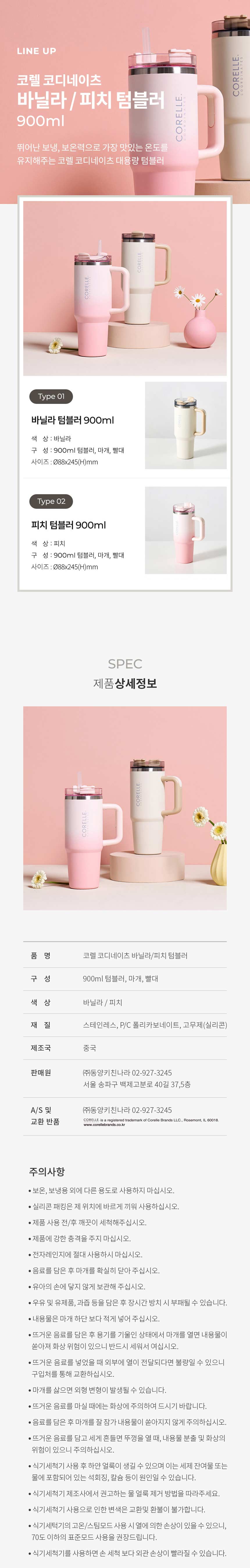 | 바닐라/피치 텀블러는 고급스러운 디자인과 컬러, 뛰어난 보냉&보온력이 특징으로 어디에서나 간편하게 휴대와 사용이 가능하며 견고한 스테인레스 304 재질로 내구성이 우수합니다. 1. 프리미엄 소재로 안전하게 ? 뚜껑은 P/C 폴리카보네이트를 적용하여 밀폐력을 높였으며 본체는 스테인레스 304 소재를 사용하여 녹이 슬거나 변색되지 않고 언제나 안전하게 사용할 수 있습니다. 2. 손목 부담과 이동성을 고려한 머그형 핸들 ? 차량 이동, 가벼운 외출 등 어느 상황에서나 텀블러를 들고 편안하게 이동할 수 있습니다. 3. 차량 컵홀더 거치로 편하게 사용 가능 ? 자동차 컵홀더에 거치가 가능하도록 제작되어 차안에서 편리하고 안전하게 사용할 수 있습니다. 4. 특급 보온 보냉력으로 맛있는 온도 유지 ? 텀블러의 내벽과 외벽 사이에 동코팅 처리된 이중진공구조 방식의 텀블러로 맛있는 온도를 오랫동안 유지합니다. 5. 음용하기 편한 텀블러 뚜껑 ? 내장된 빨대를 꽂아 사용하거나 음용구로 바로 마실 수 있는 360도 회전방식의 뚜껑으로 편리함을 더합니다. 5. 세척이 편한 넓은 주입구 ? 넓은 주입구는 음료를 담거나 솔을 이용해 세척하기 편한 넉넉한 사이즈로 제작되었습니다. |