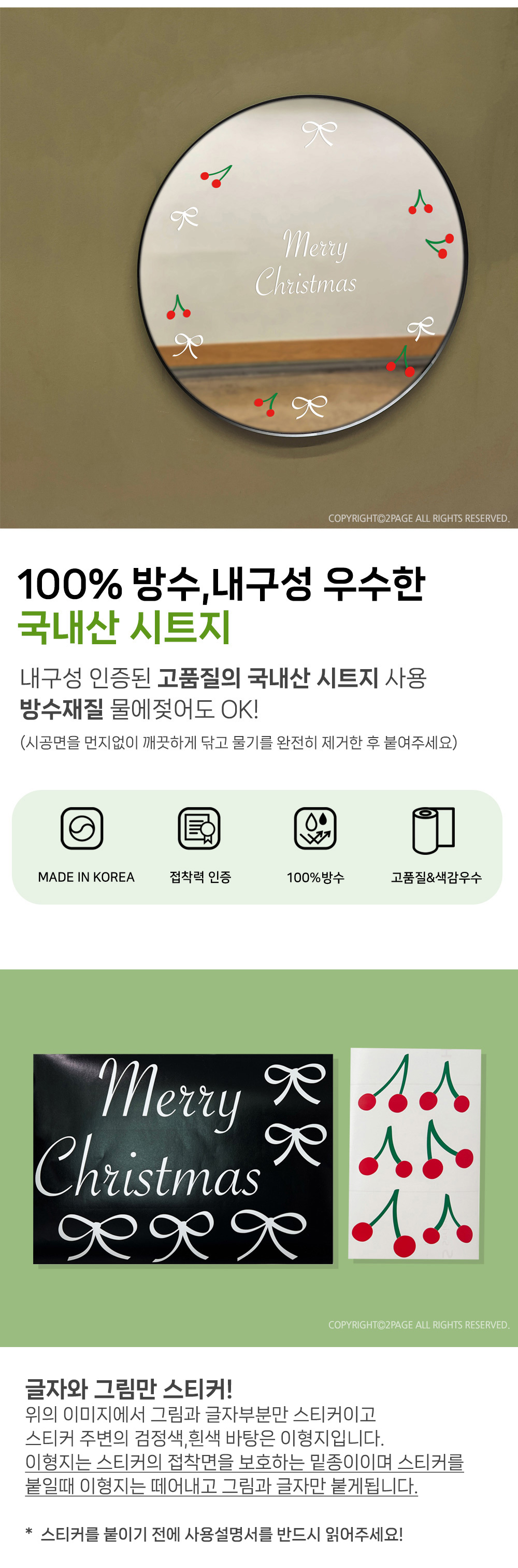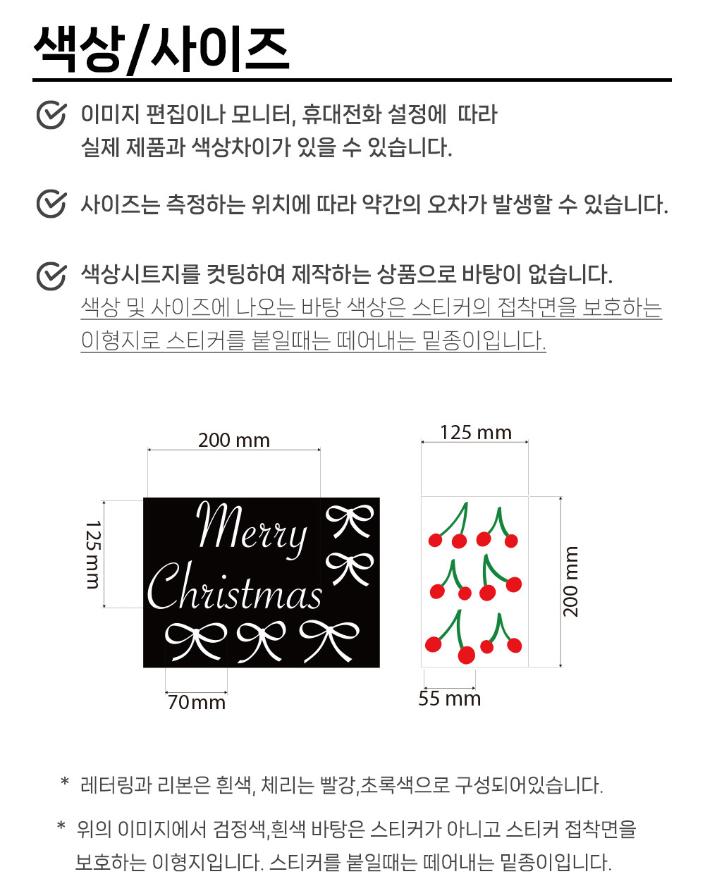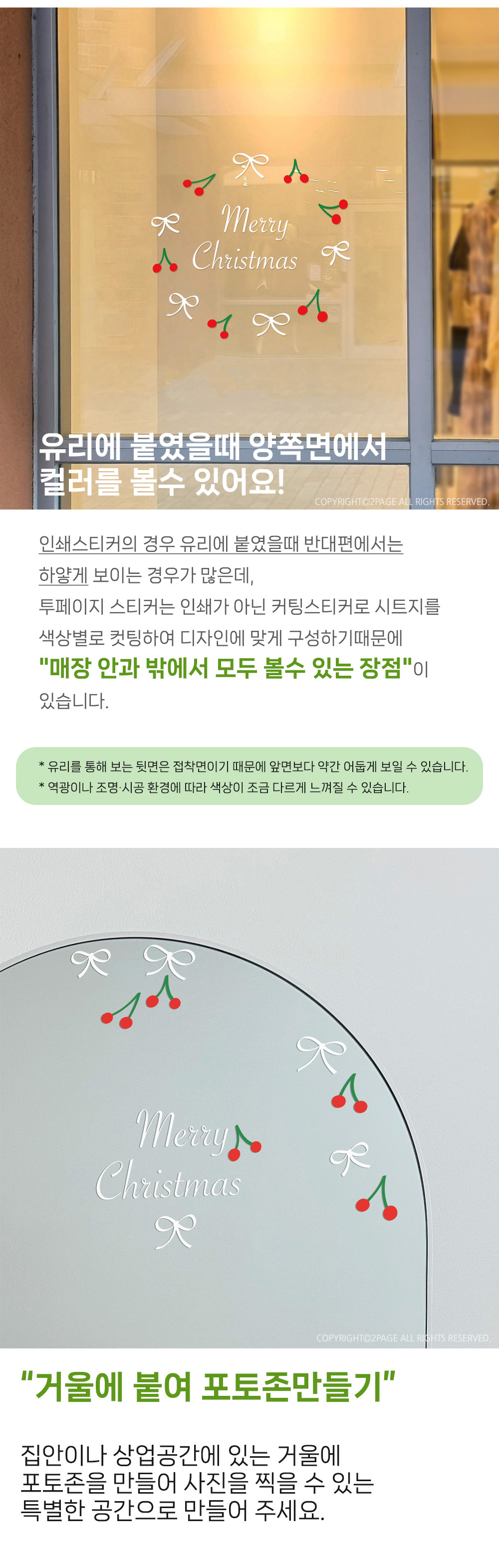스티커는 유리나 매끈한 시공면에는 접착이 잘 되는 편이지만 벽지나 페인트 벽면 등 접착면이 고르지않은 시공면에는 접착력이 떨어질수 있습니다. 제품을 구매하시기 전에 스티커를 붙일곳에 접착여부를 꼭 확인해 주세요~! 마감이 잘 안된 벽면이나 일부 벽지는 스티커를 제거할때 시공면이 손상될수도 있습니다. 구매전 시공면 상태를 잘 확인해주시고 구매해주세요. 스티커는 재사용이 안되니 시공전에 제품 시공방법을 미리 숙지하신 후 작업해주세요. 스티커를 부착할때는 함께 제공되는 보조시트지(투명눈금시트지)를 이용하여 붙이시고 시공후 보조시트지는 제거해주시면 됩니다. *시공 하시기전에 사용설명서를 꼭 확인해주세요~! |