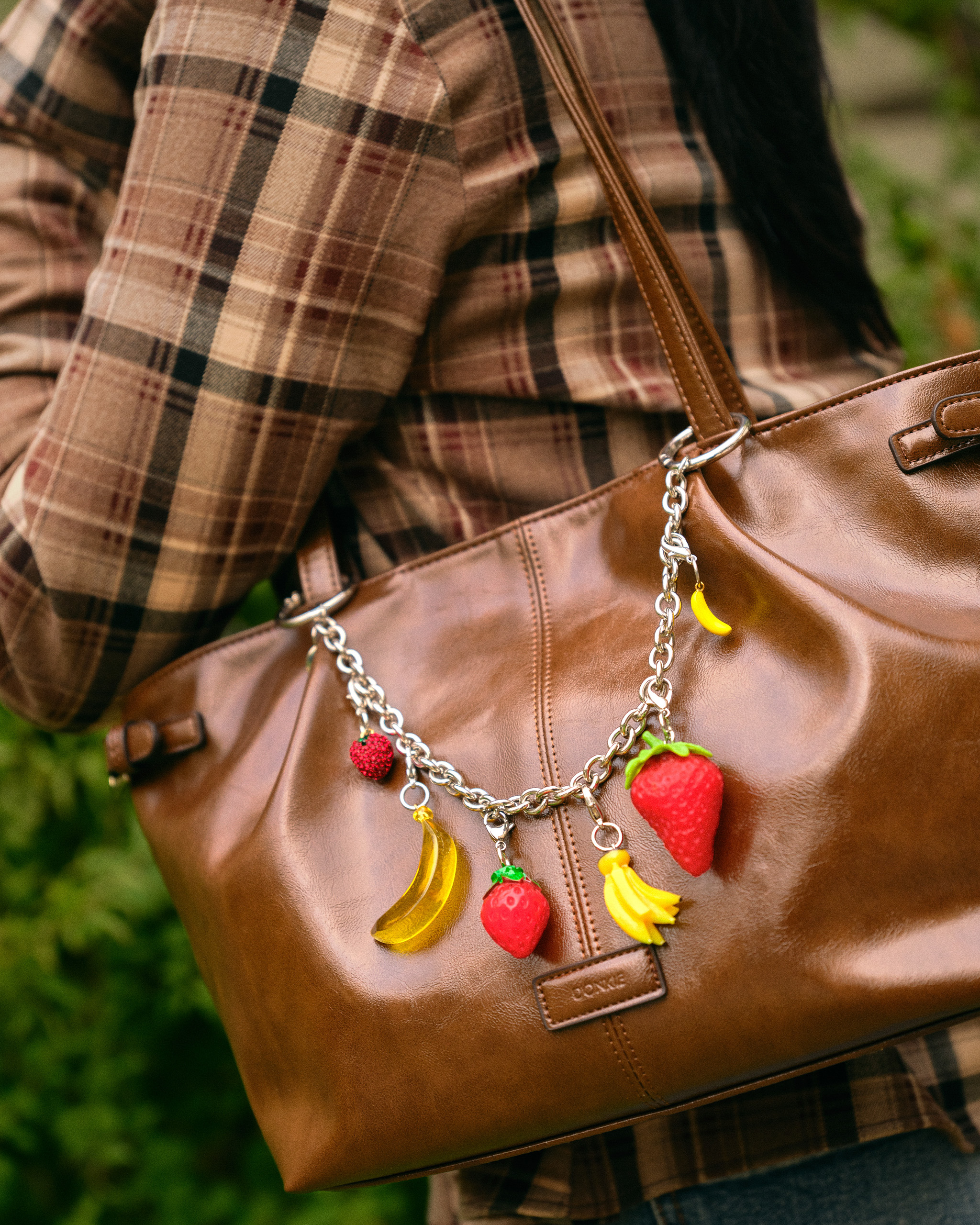 바나나와 딸기 모양의 참이 달린 키체인입니다. 여러 형태의 오브제와 실버 로고 펜던트로 유니크한 분위기를 더해보세요.