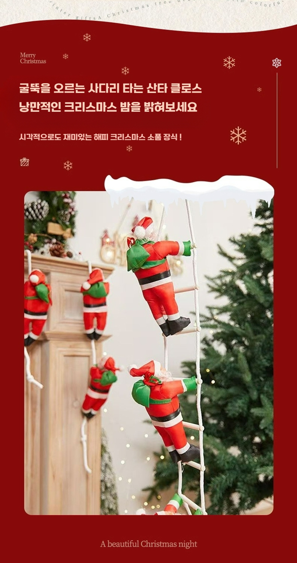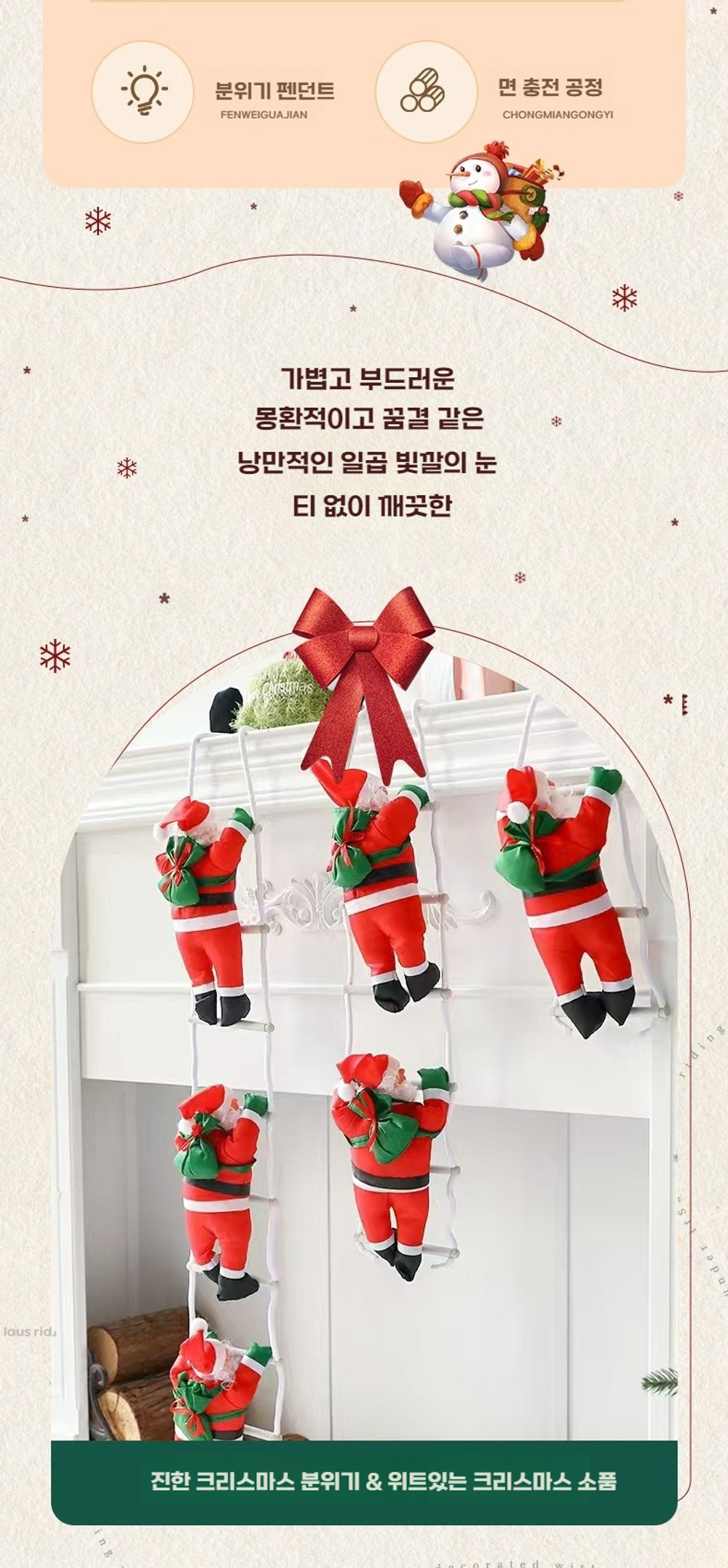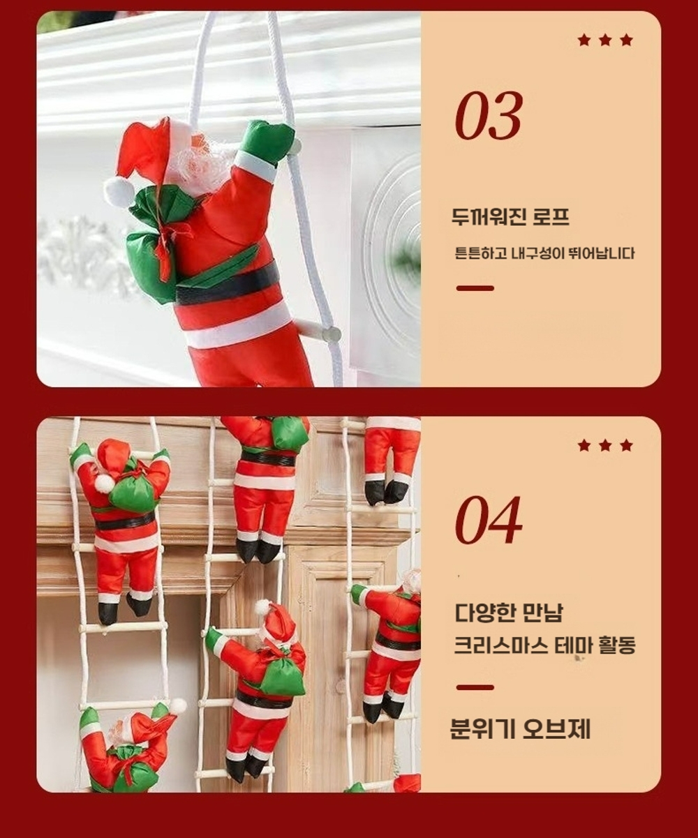![]() [상품 설명] 사랑스러운 크리스마스 분위기를 연출해 줄, 메리 크리스마스 굴뚝 산타 등반 장식 데코입니다! 현관문이나 벽에 걸어두면 집에 들어오는 모든 사람들에게 즐거운 크리스마스 분위기를 선사해 드릴 수 있답니다. 아이들이 있는 집에서는 아이들이 정말 좋아할 거예요. 매일매일 산타클로스가 올라가는 모습을 보면서 크리스마스를 손꼽아 기다릴 수 있겠죠?ㅎ 사다리 길이에 따라 다양한 크기로 준비되어 있으니, 원하시는 사이즈로 집 안 공간을 개성 있게 꾸며보세요. 크리스마스 파티를 더욱 특별하게 만들어 줄 거예요. 친구들과 함께 사진을 찍으면서 즐거운 추억을 만들어 보세요! [상품 정보] 소형 산타: 25cm 크기 2인용 사다리: 전체 길이 60cm 3인용 사다리: 전체 길이 90cm 산타클로스: 40cm/50cm/60cm ![]() ![]() ![]() ![]() ![]() ![]() ![]() ![]() ![]() ![]() ![]() ![]() ![]() ![]() - [ 포토 리뷰 이미지 ] - Photo Images ![]() - # notice 해당상품은 제품마다 특성상 모양과 형태가 조금씩 다를수 있습니다. 자연스럽게 눌려있거나 제품의 마감처리가 깔끔하지 않은 듯한 느낌이 드실 수 있습니다. 핸드메이드 제작으로 실밥처리 또는 붙임자국등이 남아있을수 있습니다. 이는 모두 제품 불량이 아닌점 꼭 참고후 구매 부탁드려요!^^ - ![]() |