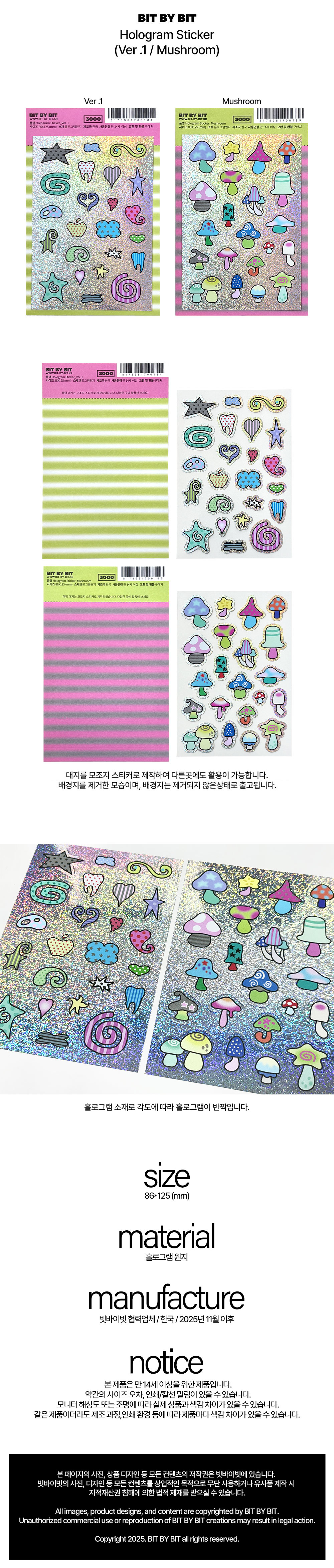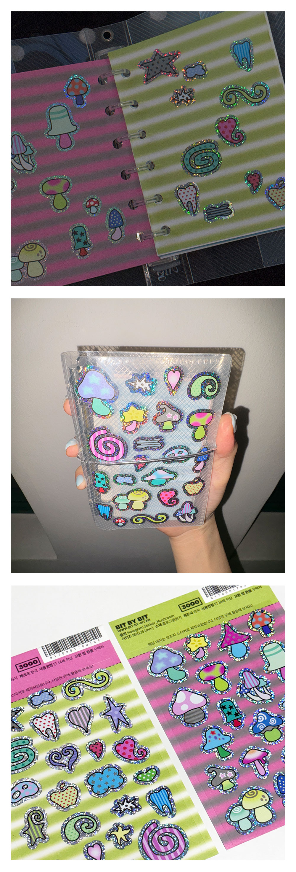 유니크한 색감과 귀여운 낙서, 버섯 그림의 스티커입니다.