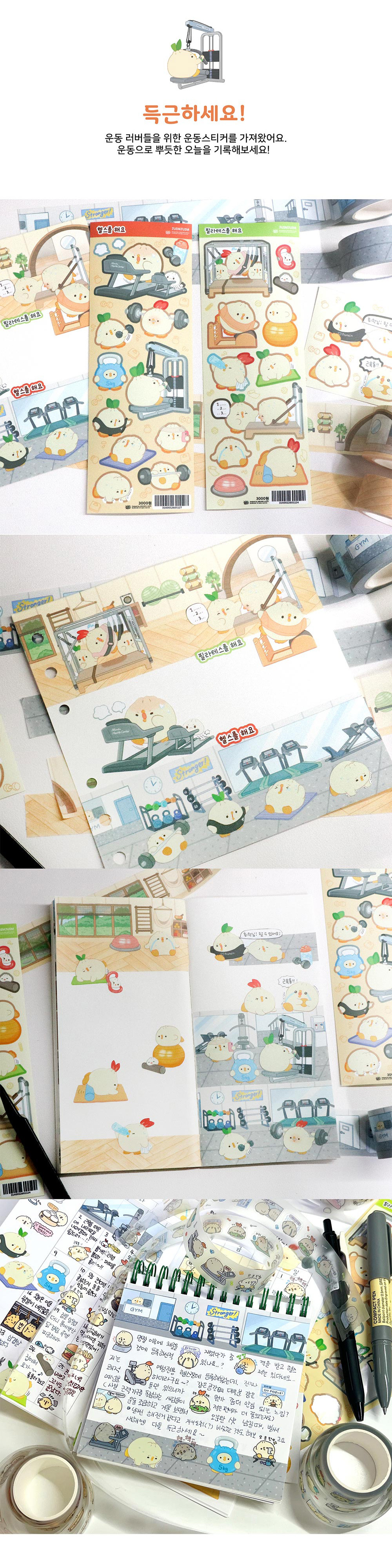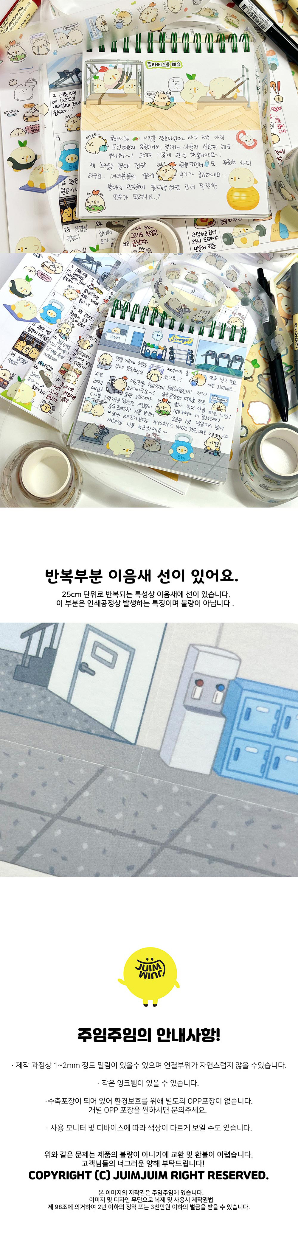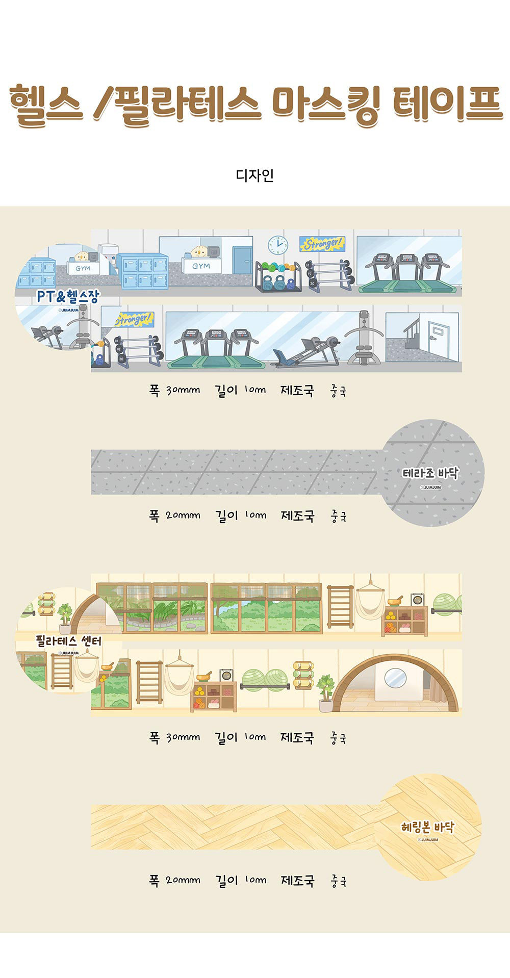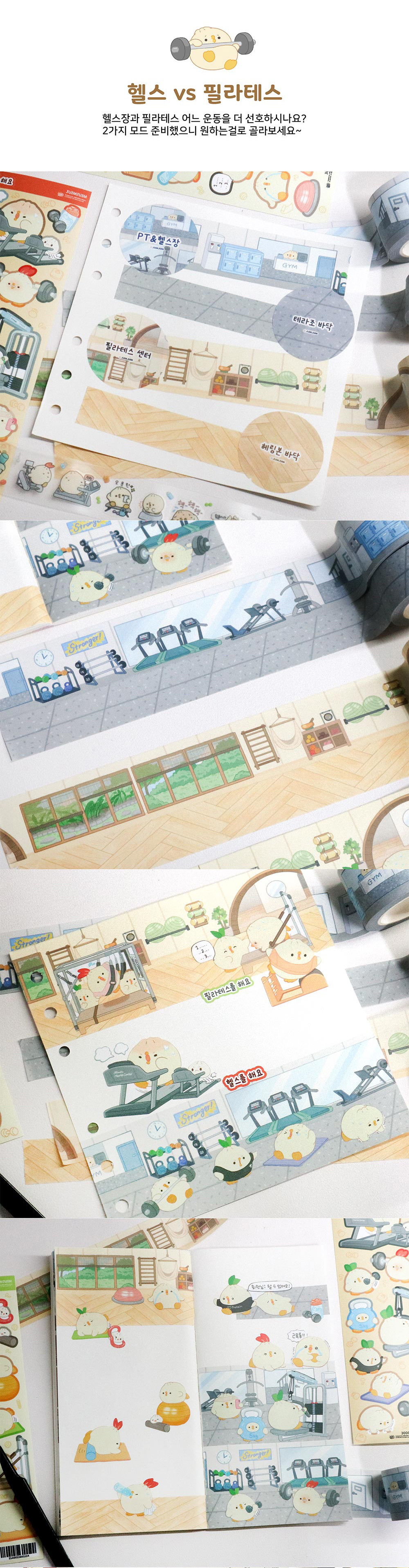 마스킹 테이프 (필라테스 센터 + 헤링본 바닥) + 스티커 (필라테스를 해요)로 구성되어 있습니다.