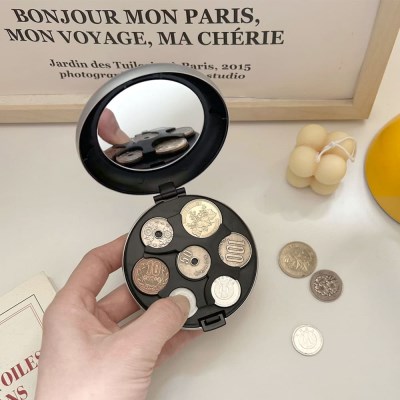 오자마자 예쁜스티커로 꾸며주었어요 깔끔한 블랙이라 어떤 스티커도 착붙이예요 이 아이는 실제로 쓸 때 너무나도 빛이납니다!엔화동전이 얼마나있는지 바로정리되고 쓰기도 넘편해요 거울도 있어서 잠깐잠깐 사용하기도 최고입니다!