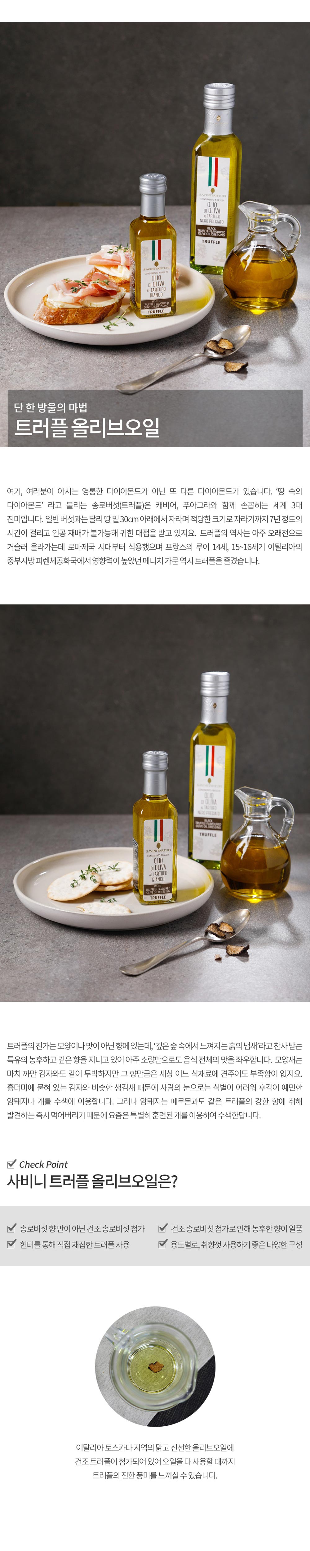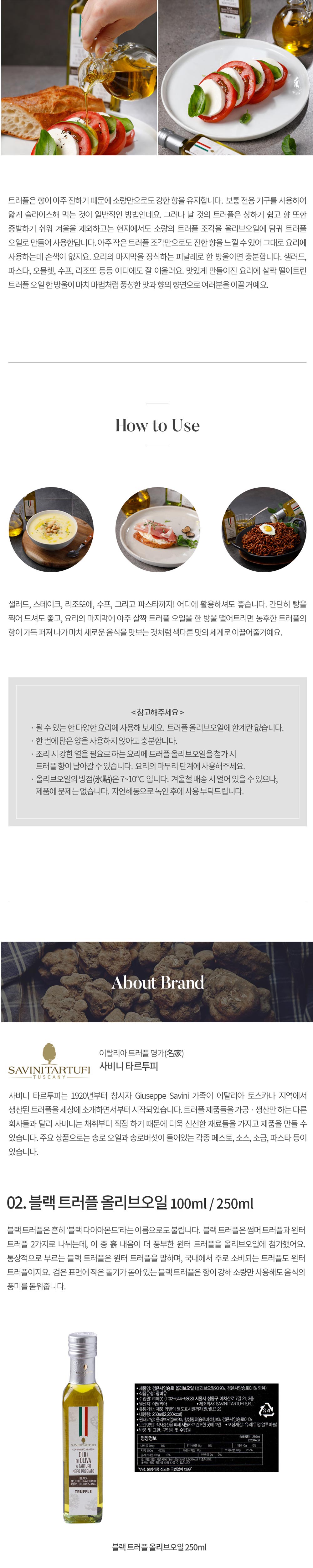 | 이탈리아 토스카나 지역의 올리브오일에 송로버섯 중 제일 비싼 화이트 트러플 향을 첨가하여 만든 트러플 올리브오일입니다. 향만 첨가된 것이 아니라 건조 송로버섯이 들어 오일을 다 쓸 때까지 향이 남아있습니다. 송로버섯의 향이 진해서 요리에 소량만 사용하여도 요리 전체를 더 고급스럽게 즐기실 수 있습니다. 명절선물, 지인선물, 결혼답계품, 집들이 선물 등 인기가 많은 제품입니다. 선물용으로 '선물박스' 구매가 가능한 제품이니, 상세페이지 하단에서 이미지 확인하시고 필요하시면 옵션에서 선택하세요~! 전체 블랙(무광)으로 되어 있는 사비니전용 고급스런 포장박스입니다 < 유통기한 2025년 3월 22일 제품으로 한정수량 특가할인 제품입니다> |