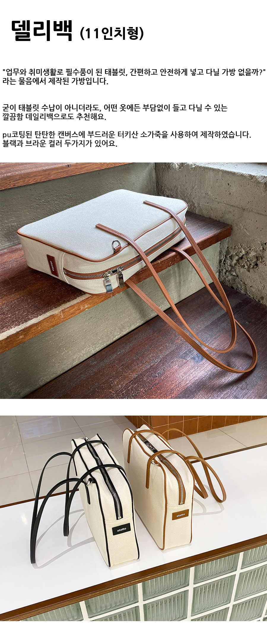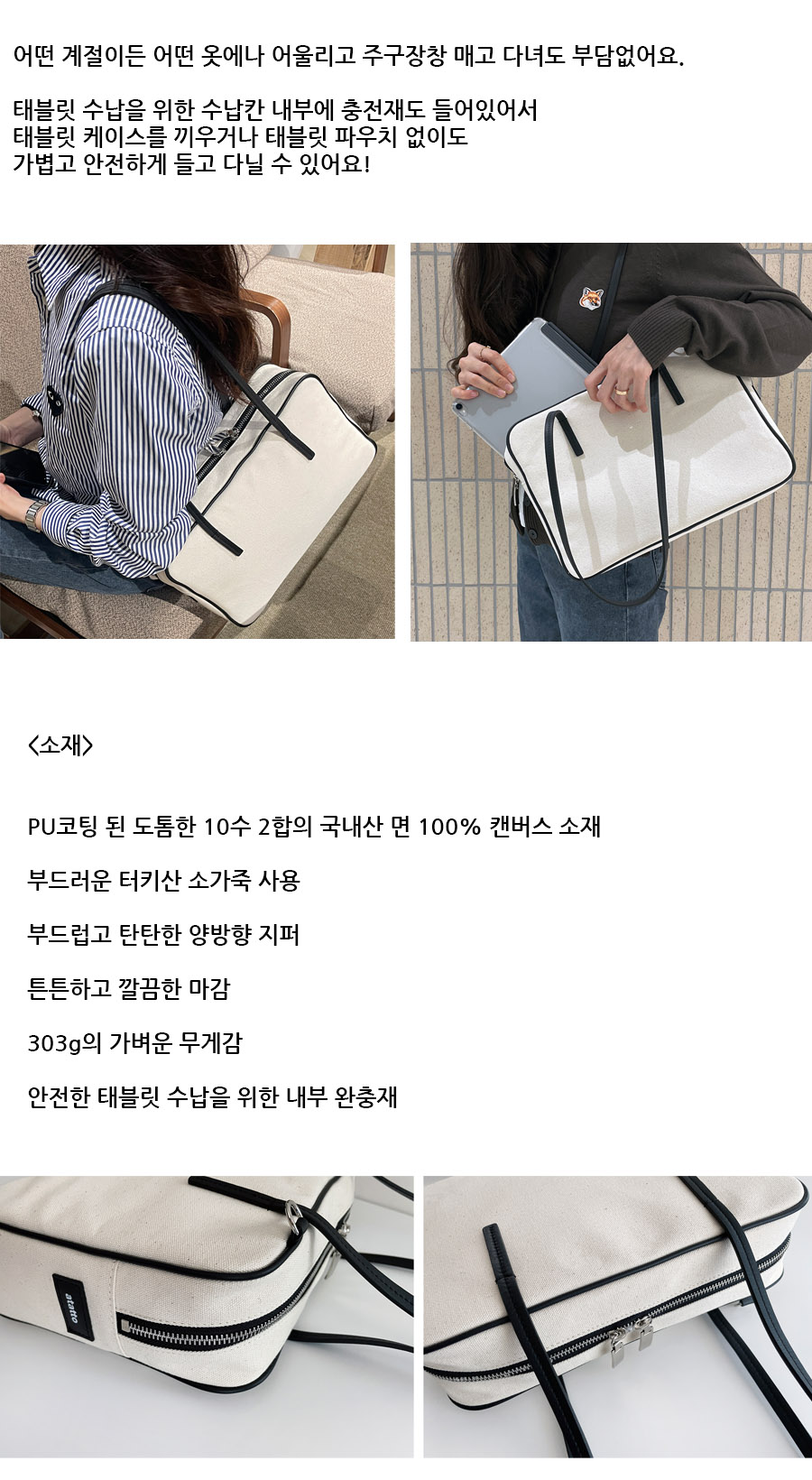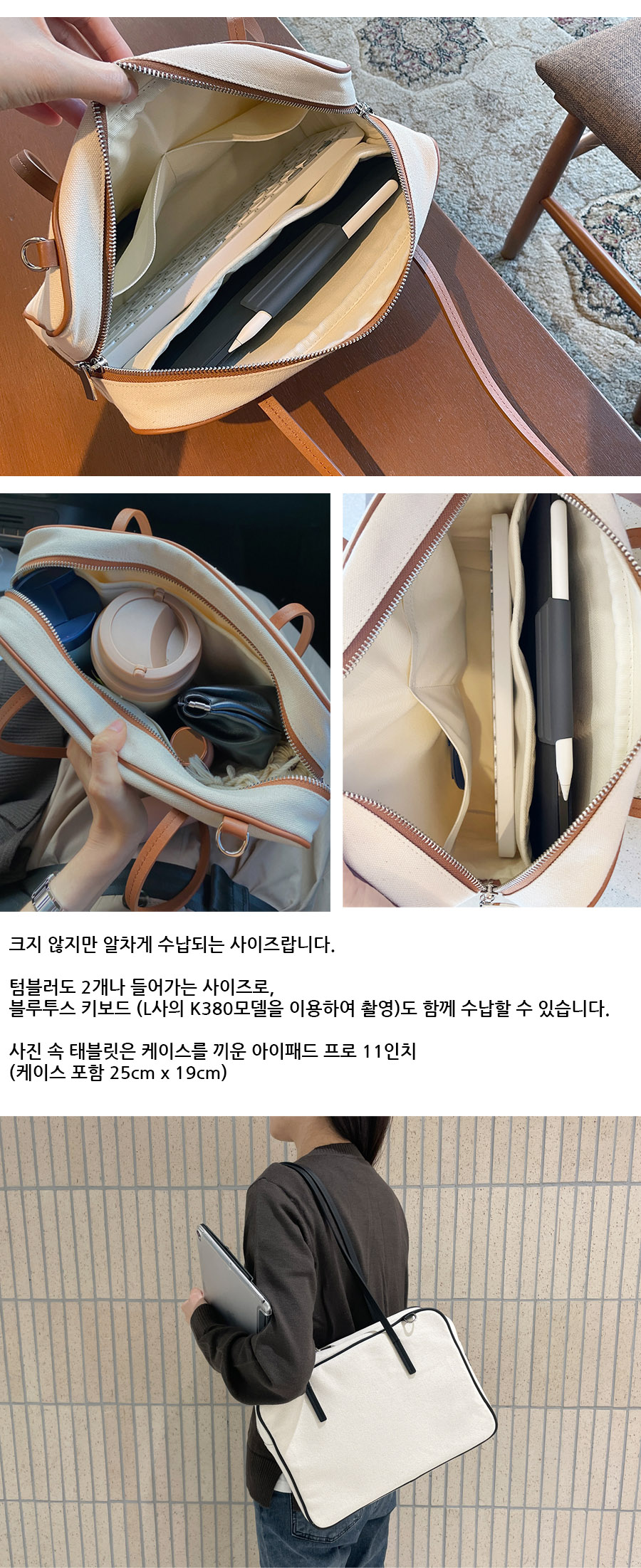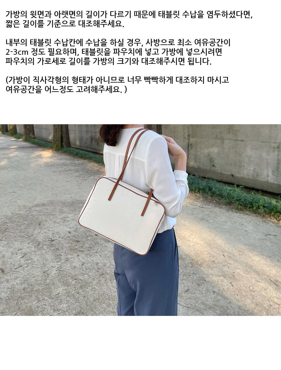 태블릿수납용 가방으로 제작되었지만 데일리백으로도 사용할 수 있는 델리백입니다. 내부 완충제가 있어 태블릿을 안전하고 간편하게 수납하기 좋습니다. 깔끔한 디자인으로 어떤 스타일에도 어울리는 깔끔한 디자인의 숄더백입니다.