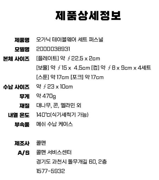 ![]() 전자상거래 등에서의 상품 등의 정보제공에 관한 고시1. 품명 및 모델명 : 상품상세참고 2. KC 인증정보 (「전기용품 및 생활용품 안전관리법」에 따른 안전인증ㆍ안전확인ㆍ공급자적합성확인대상제품에 한함) : 상품상세참고 3. 크기, 중량 : 상품상세참고 4. 색상 : 상품상세참고 5. 재질 : 상품상세참고 6. 제품 구성 : 상품상세참고 7. 동일모델의 출시년월 : 상품상세참고 8. 제조자, 수입품의 경우 수입자를 함께 표기 (병행수입의 경우 병행수입 여부로 대체 가능) : 상품상세참고 9. 제조국 : 상품상세참고 10. 상품별 세부 사양 : 상품상세참고 11. 품질보증기준 : 상품상세참고 12. A/S 책임자와 전화번호 : 상품상세참고 ![]() |