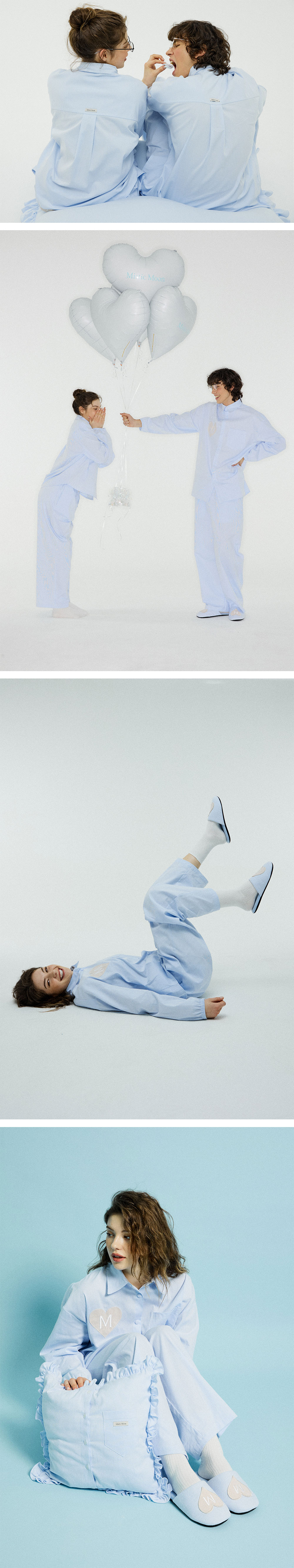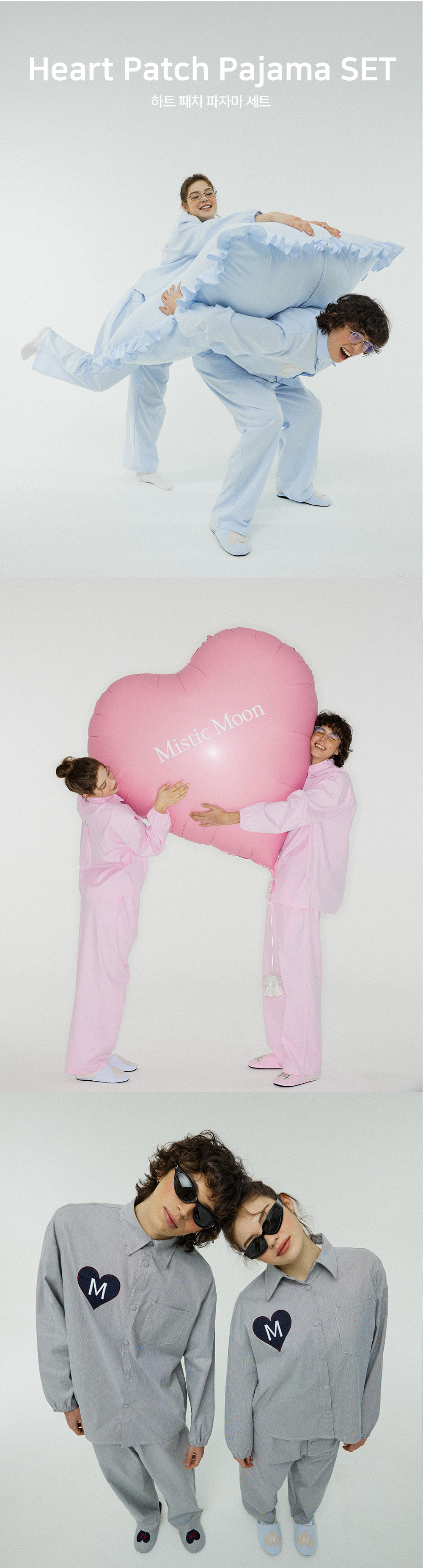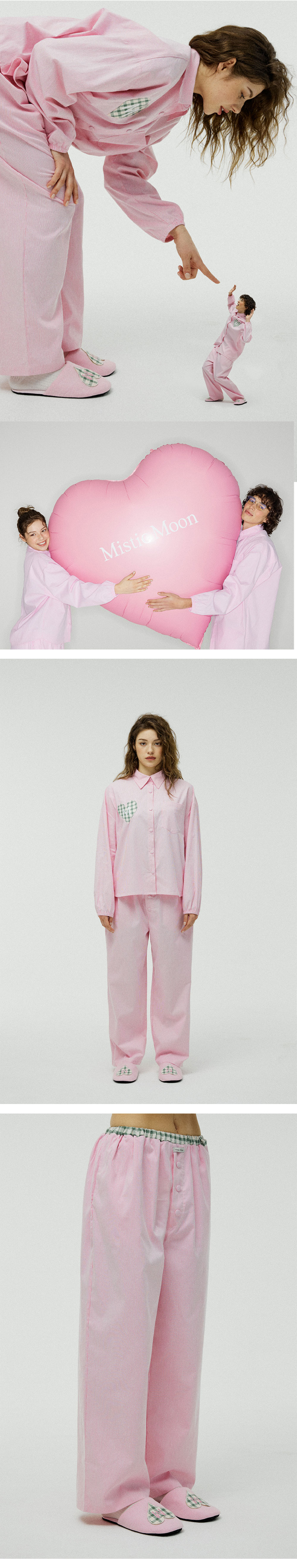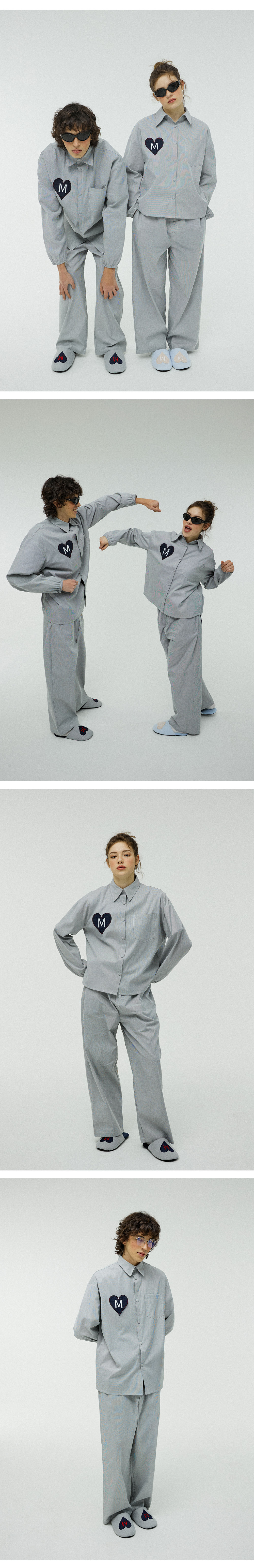 고급스러운 스트라이프 소재와 러블리한 하트 패치가 돋보이는 파자마 세트입니다