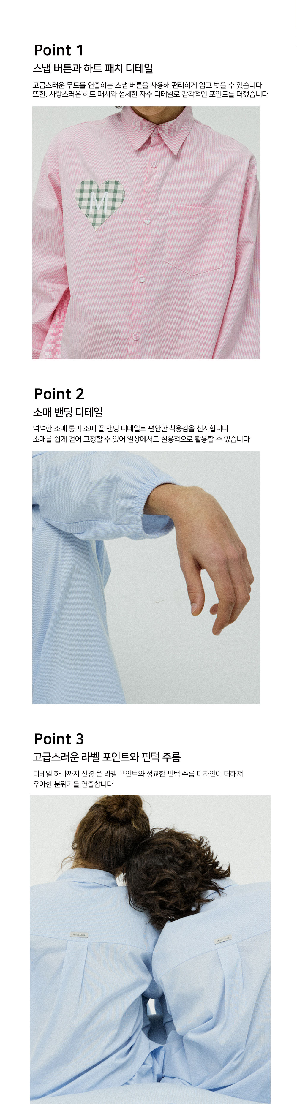 버튼이 아닌 스냅 버튼으로 입고 벗기 편하고, 소매 밴딩으로 쉽게 소매를 걷고, 고정할 수 있습니다.
