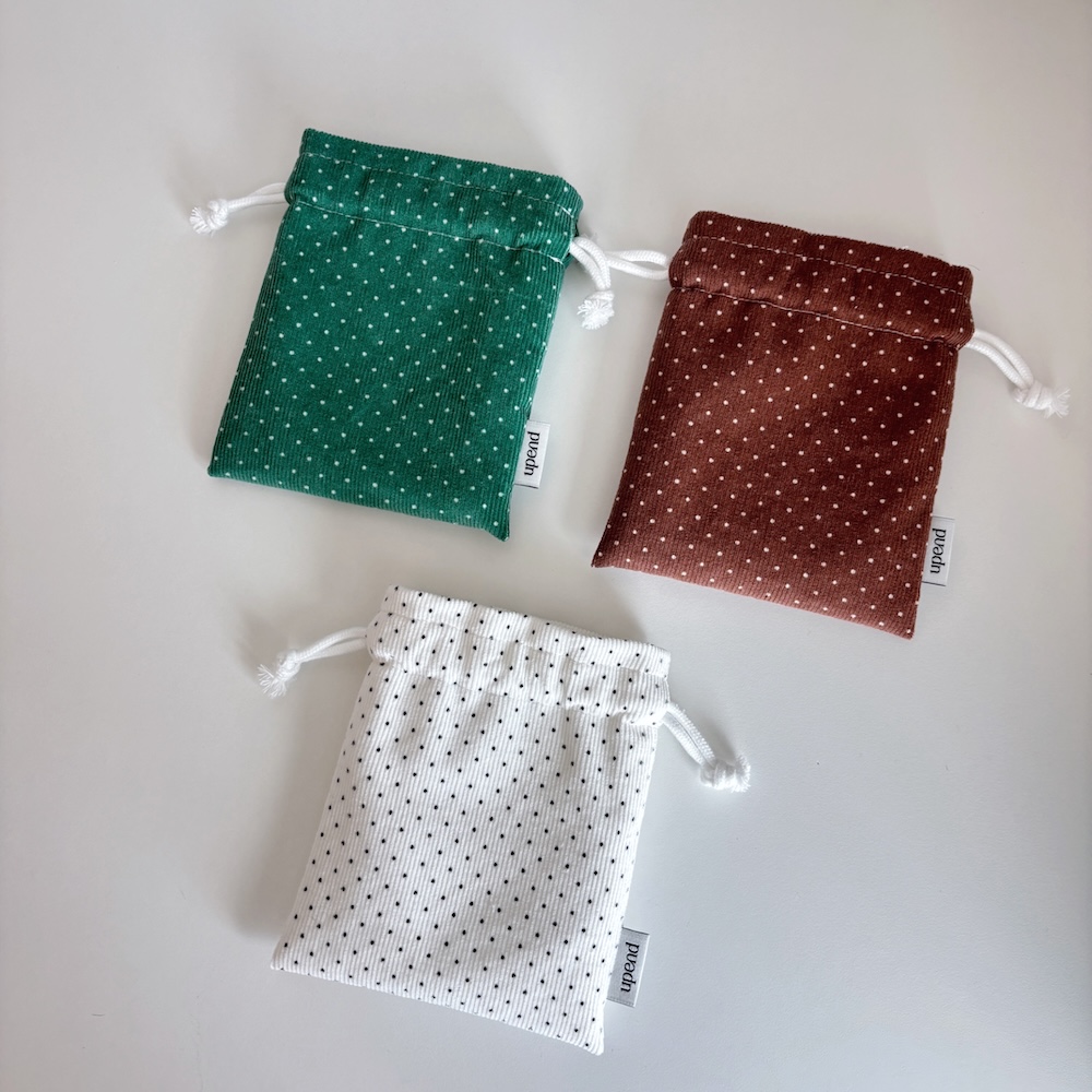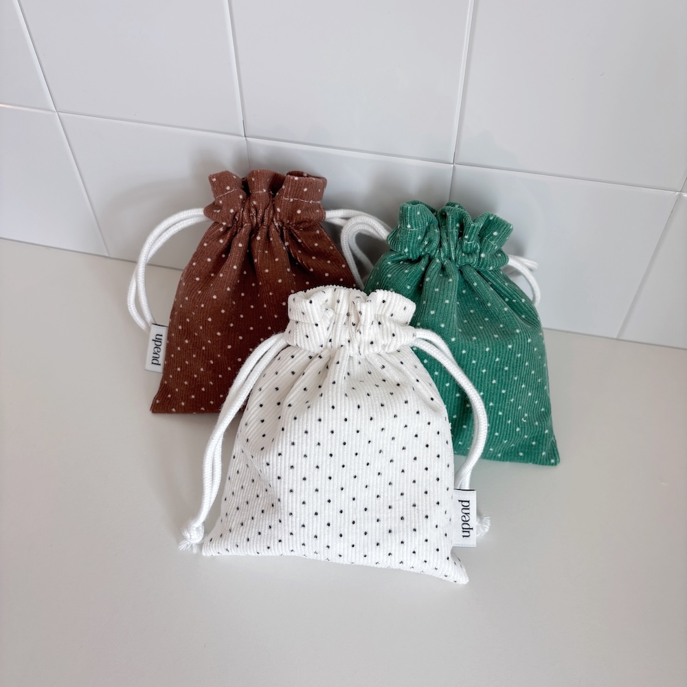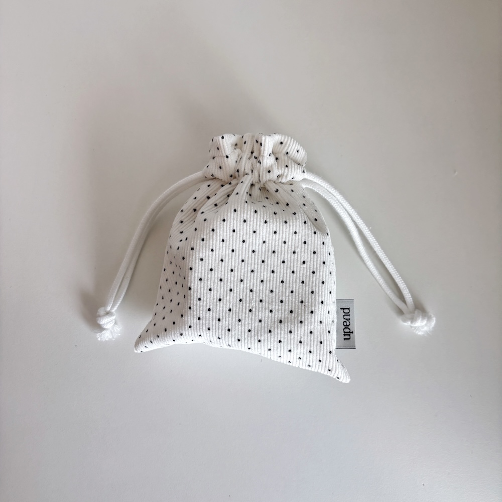 잔골덴 원단으로 만들어진 폭이 있는 스트링 파우치 입니다.