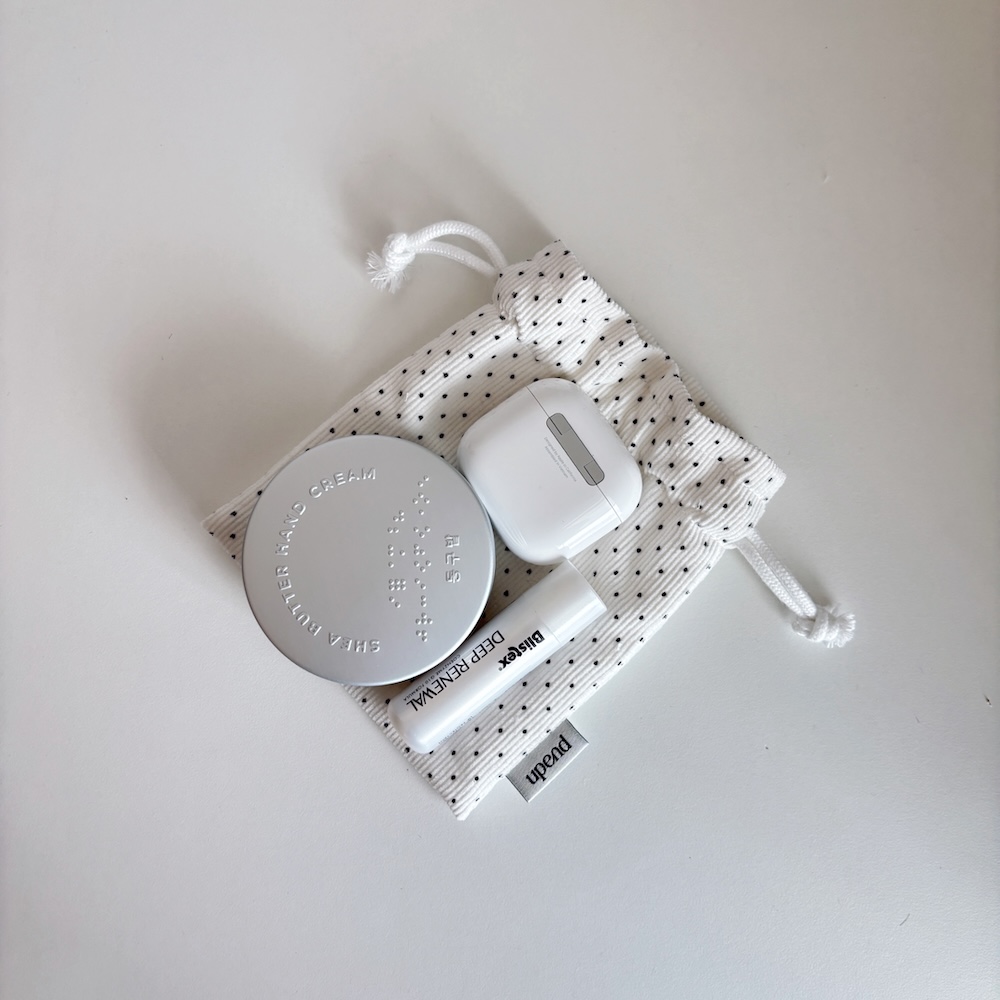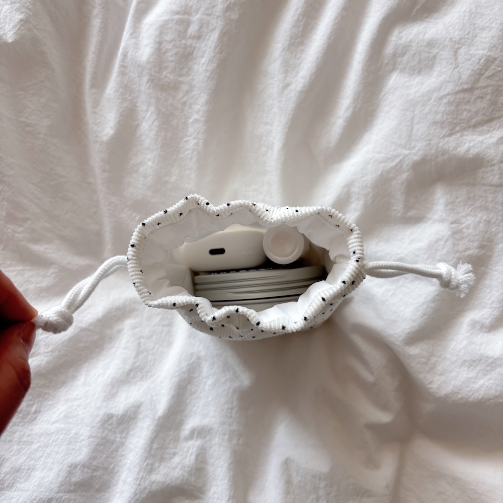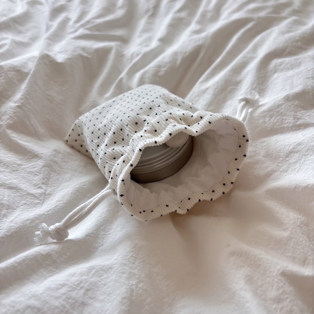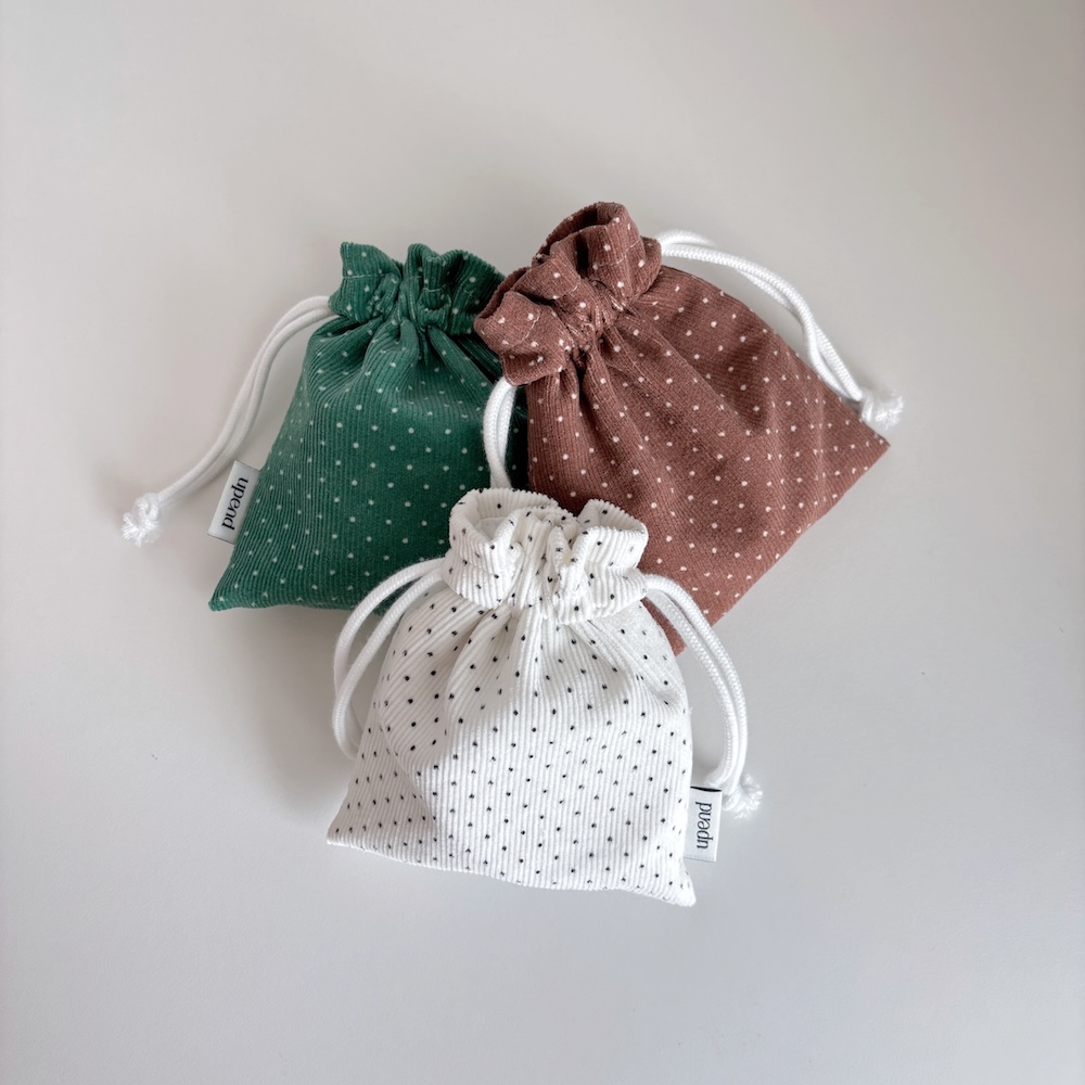 잔골덴 원단으로 만들어진 폭이 있는 스트링 파우치 입니다.