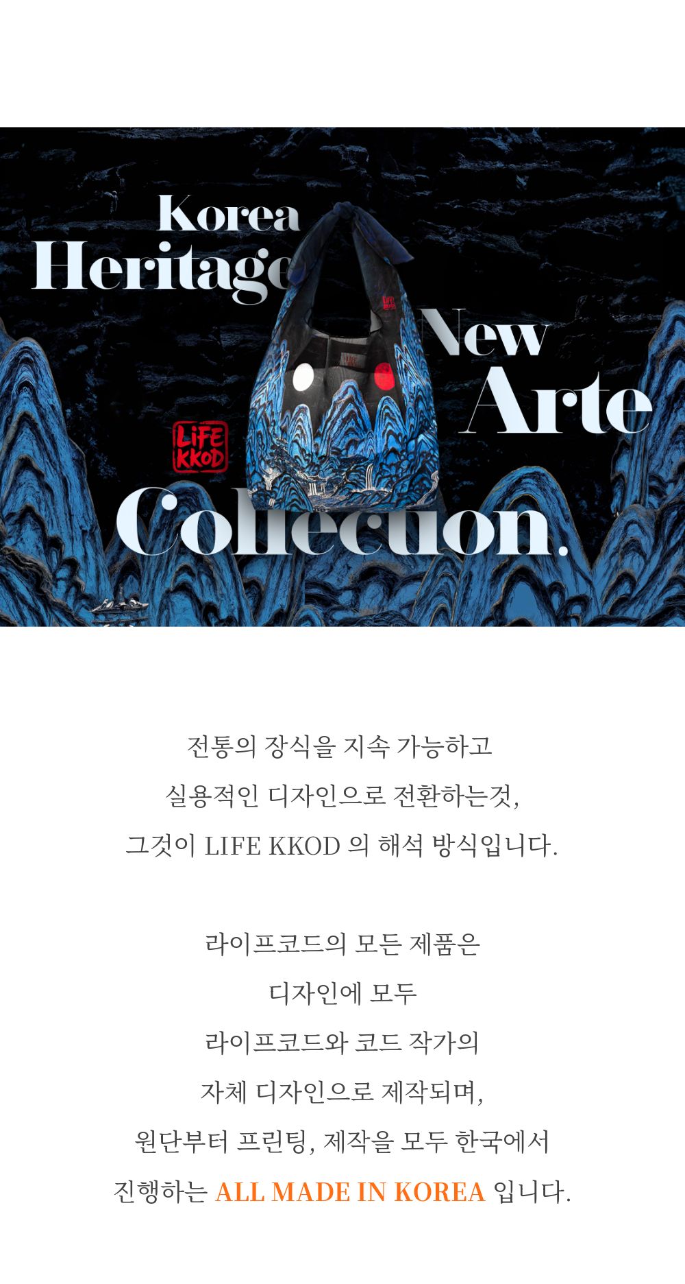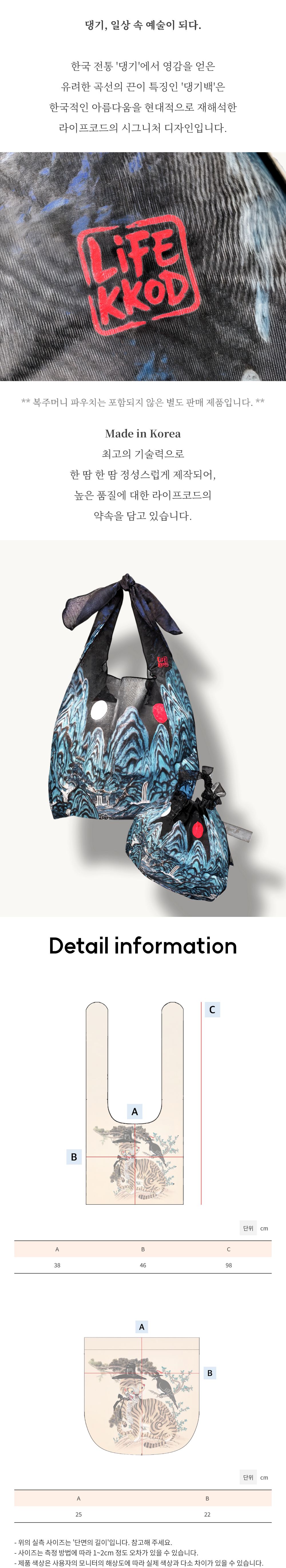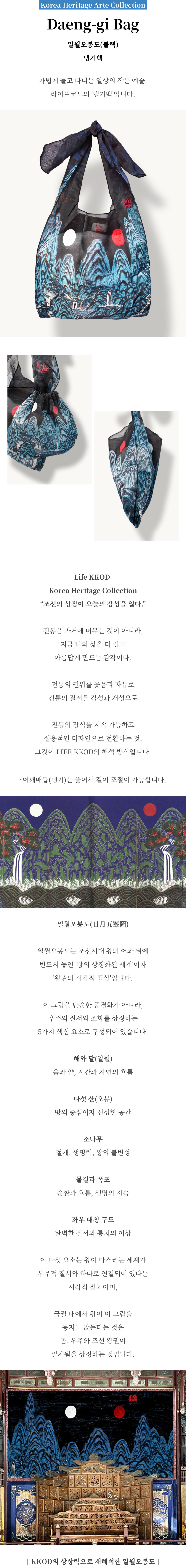 [LIFEKKOD] 댕기백 일월오봉도 블랙 Daeng-gi Bag Irworobongdo Black 'LIFEKKOD, Bring Art & Joy to LIFE' 조선 시대 왕의 권위와 위엄을 상징하는 일월오봉도를 라이프코드만의 감각적인 블랙 컬러로 재해석하여 일상의 예술을 제안합니다. 디지털 프린트: (유)오드리텍스의 고해상도 나염 기술로 일월오봉도의 장엄한 패턴을 화사하고 선명하게 구현했습니다. 유니크 실루엣: 한국 전통 댕기를 모티브로 한 리본 어깨끈으로 우아하고 독창적인 스타일링이 가능합니다. 초경량 무게: 약 200g의 가벼운 무게로 제작되어 일상에서 어깨 부담 없이 사용하기 좋습니다. [LIFEKKOD] Daeng-gi Bag Irworobongdo Blue Edition Irworobongdo: Reinterprets the iconic sun, moon, and five peaks pattern traditionally placed behind the King's throne with a modern , black aesthetic. Design: Features a signature ribbon-style strap inspired by the Daeng-gi (traditional Korean hair ribbon). Premium Quality: High-resolution digital printing on lightweight, premium organza for a refined look. Type: Daeng-gi Shoulder Bag Material: Premium Organza (100% Polyester) Color: Black (Irworobongdo Pattern) Size: (W) 36cm x (H) 42cm / Total length including handle: approx. 65cm Manufacturer: LIFEKKOD Country of Origin: Republic of Korea (Made in Korea) |
