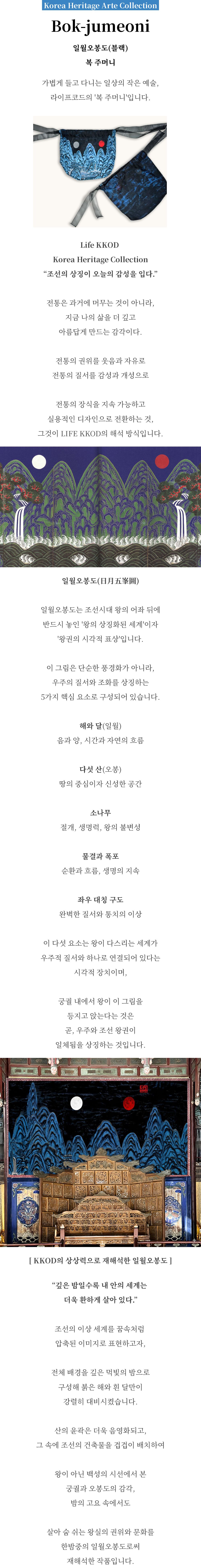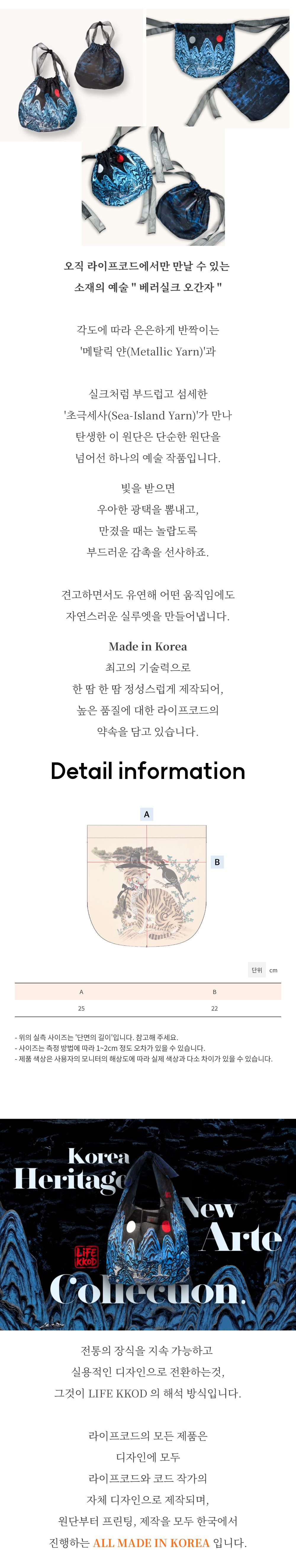 [LIFEKKOD] Bokjumeoni Pouch 'Bring Art & Joy to LIFE' The KOREA HERITAGE ARTE COLLECTION reinterprets the elegance of Korean tradition through modern art. Experience 'Art in Daily Life' featuring royal symbols and folk paintings captured through LIFEKKOD's unique perspective. Product Specifications Type: Bokjumeoni Pouch Material: Premium Organza (100% Polyester) Color: Black (Irworobongdo Pattern) Size: (W) 24.5cm x (H) 21cm Manufacturer: LIFEKKOD Country of Origin: Republic of Korea (Made in Korea) |