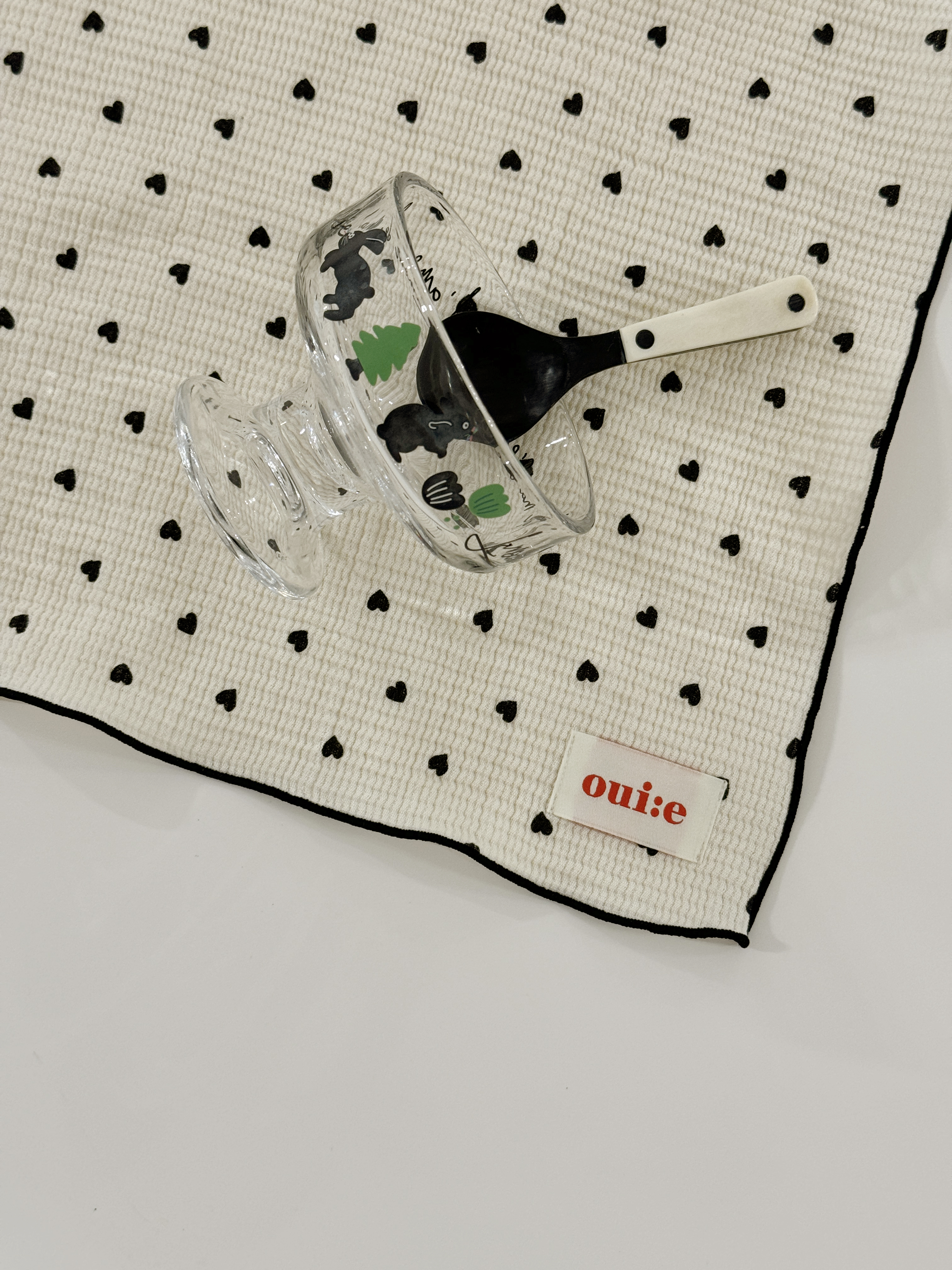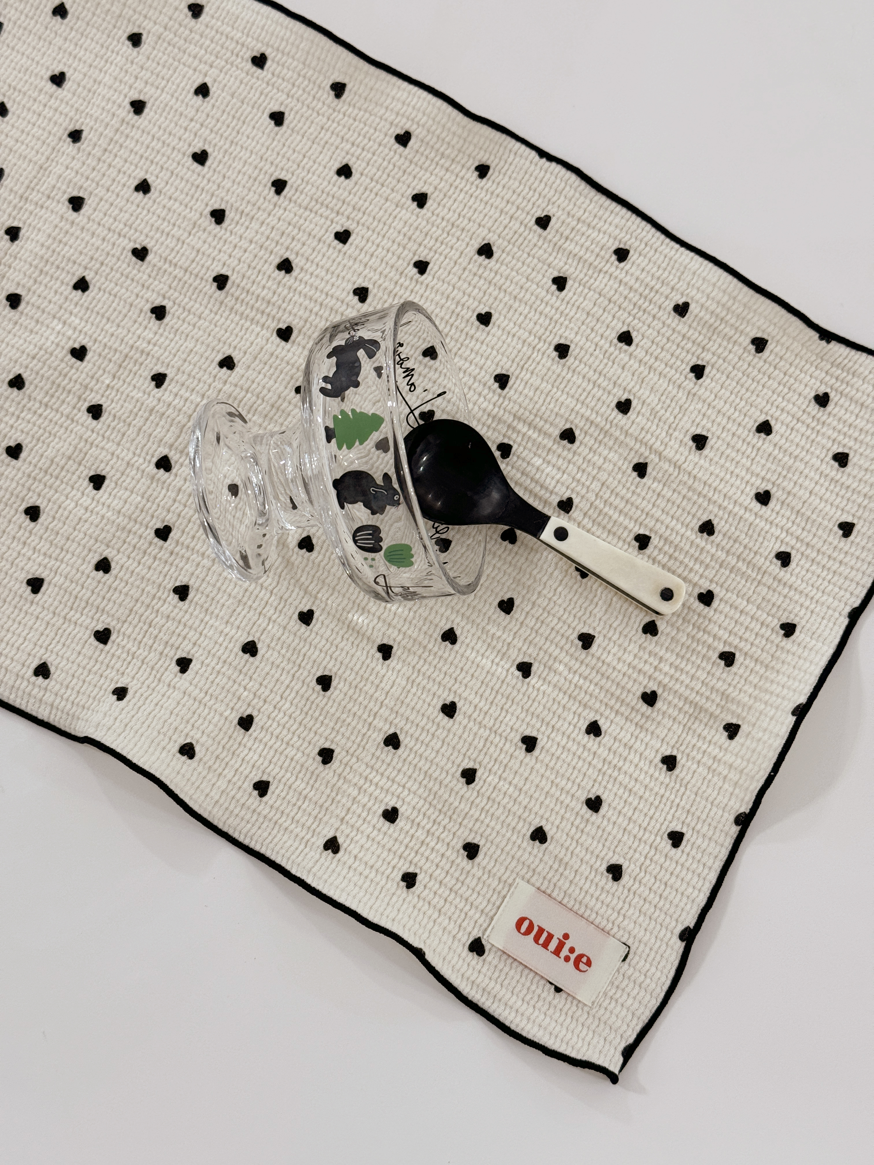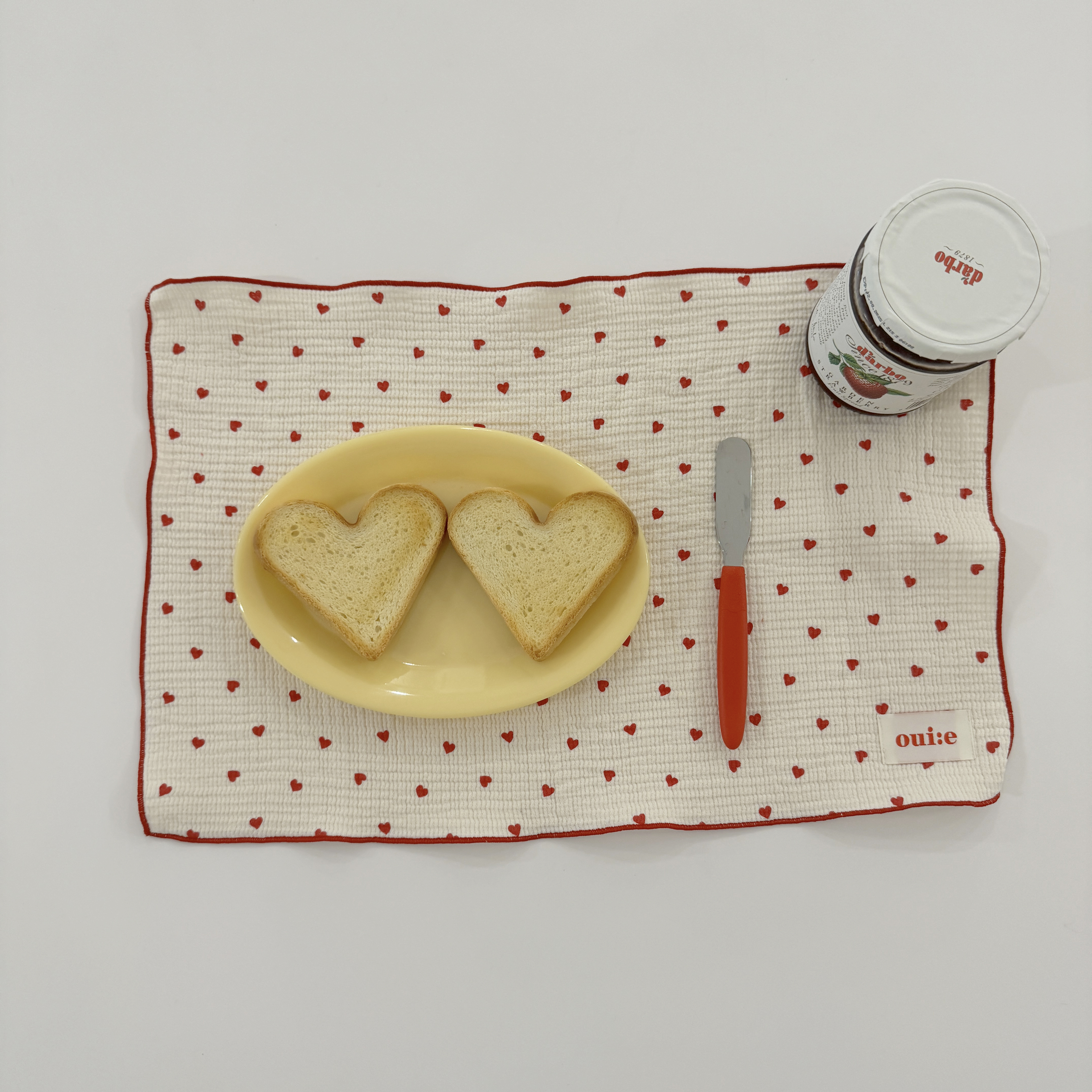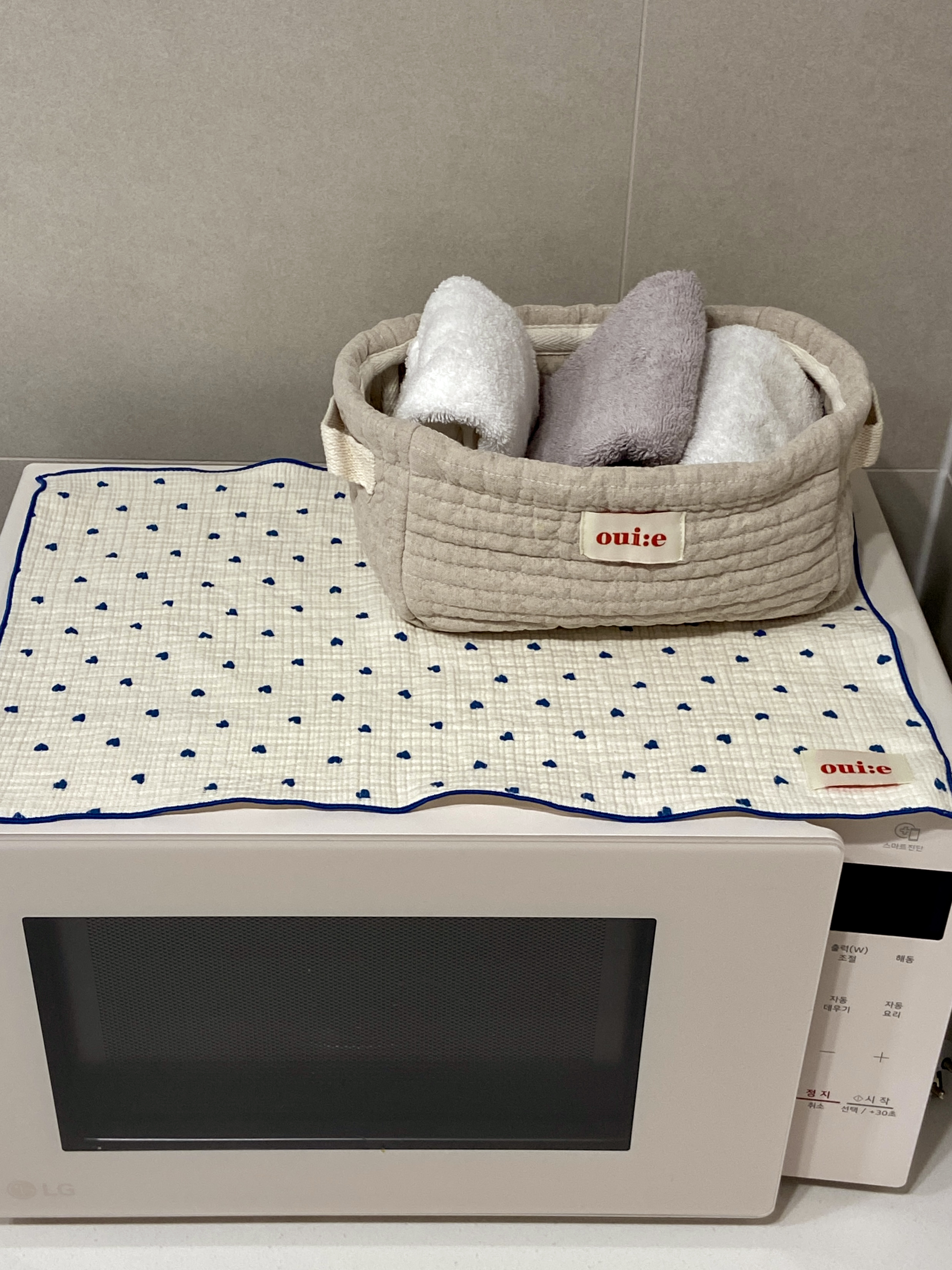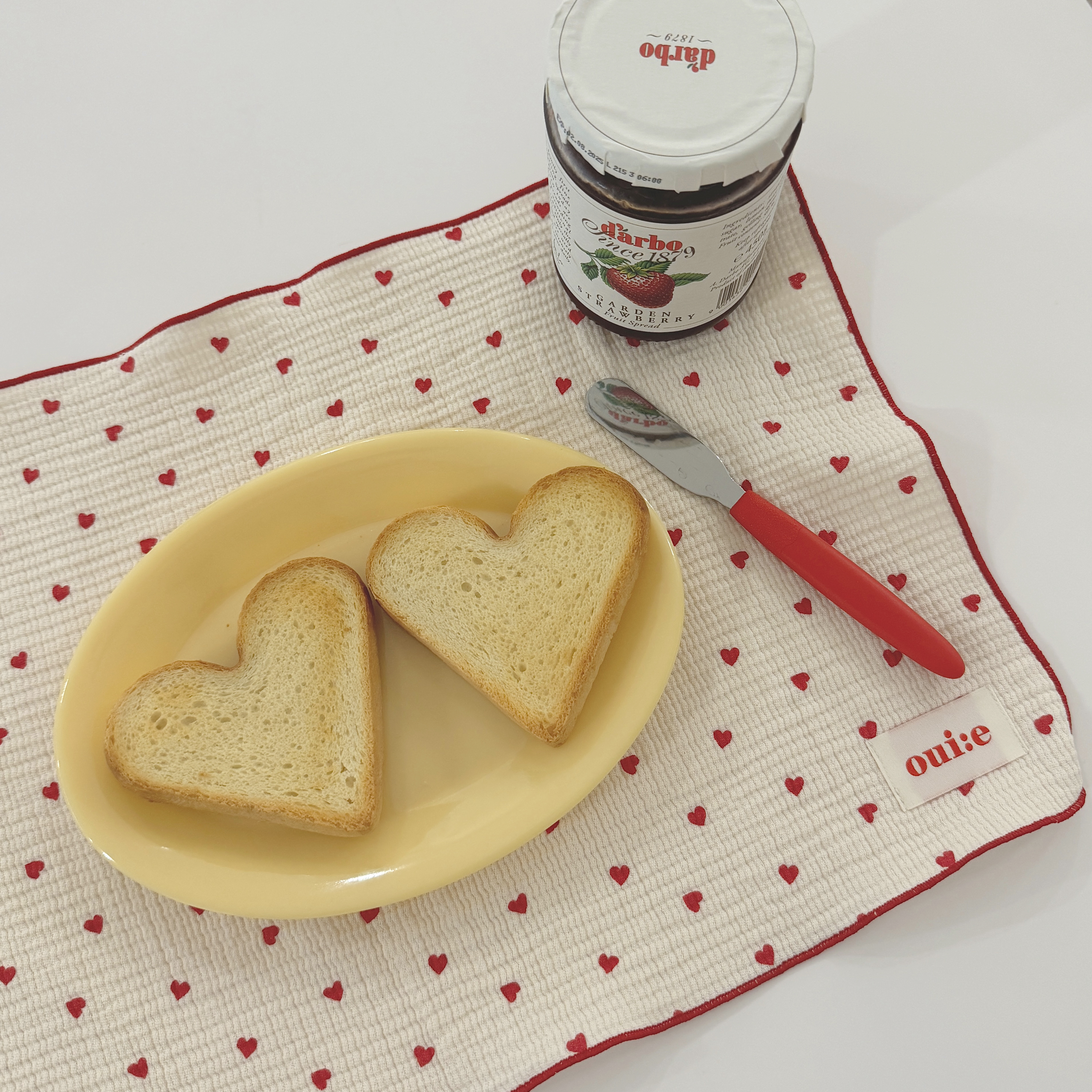 택배는 매주 월, 수, 금요일 발송됩니다. 참고바랍니다 :) [oui:e] ; 위에 어느 곳 '위에' 올려두어도 분위기와 어우러질 다양한 제품군을 만나보세요. 귀여운 하트 키친크로스가 제작되었어요♥ 너무도 사랑스럽고 귀엽습니다? 키친크로스는 다용도로 사용이 가능해요. 부드러운 면원단이라, 가벼운 핸드타올로도 좋고 귀여운 패턴덕에 가전덮개로도 포인트되고 심심한 테이블웨어 아래에 테이블 매트로도 좋아요. 내가 사용하고 싶은 용도에 맞게 쓰셔요 ^^ 저는 주방서랍에 그득그득 두었다가, 테이블 매트로 혹은 핸드타올로 잘 쓰는 것 같아요. 이번에 촬영하다가 전자레인지에 딱맞길래 하나는 또 거기에 고정되었어요 ㅋ 쓸모있게 휘뚜루마뚜루 잘 쓰는 것이 좋은 것 같아요. 반할 준비 하시고, 구경하셔요 ^^ 사이즈 43cm x 30cm (1~2cm 오차 있을 수 있음) 소재 면거즈 100% 소재특성상 세탁후 약간의 수축이 있음 (망에 넣어 찬물세탁요망 / 건조기 사용불가) |