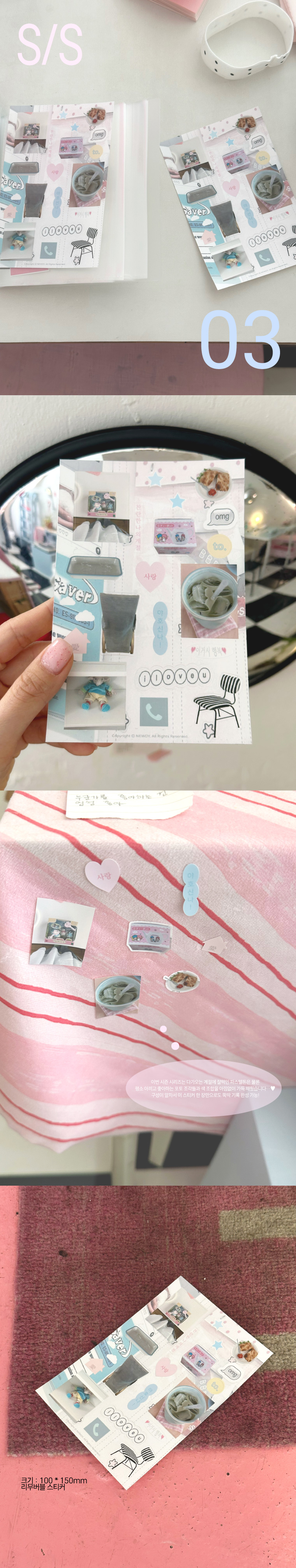 | S/S season 03 솔직히 말씀드리면 .. 시즌 스티커들 중 아니, 뉴디 스티커들 통틀어서 제일 마음에 드는 스티커가 탄생하였다....... 해도 과언이 아닐 정도로 마음에 드는 시즌 스티커 03이에요! 이번 시즌 시리즈는 다가오는 계절에 찰떡인 파스텔톤은 물론 평소 아끼고 좋아하는 포토 조각들과 색 조합을 아낌없이 가득 채웠거든요 구성이 알차서 이 스티커 한 장만으로도 뚝딱 기록 완성 가능! 제 사심이 듬뿍 담긴 시즌 03 ~! 리무버블이니 여기저기 붙여보세요 |