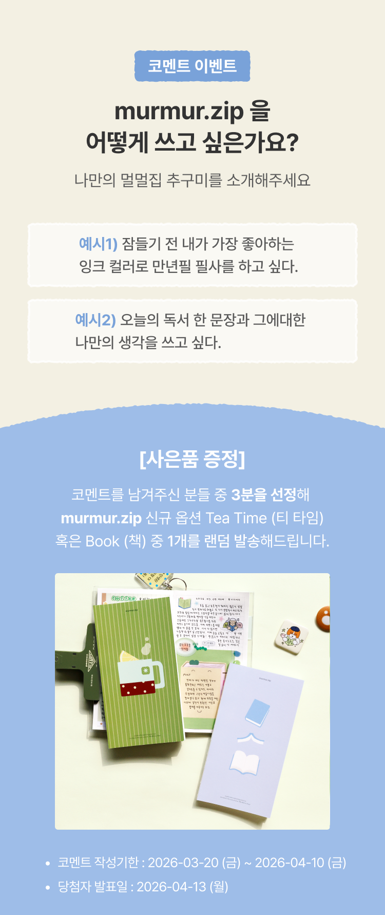 작성 기간 : 2026.03.20 ~ 2026.04.10 당첨자 발표 : 2026.04.13